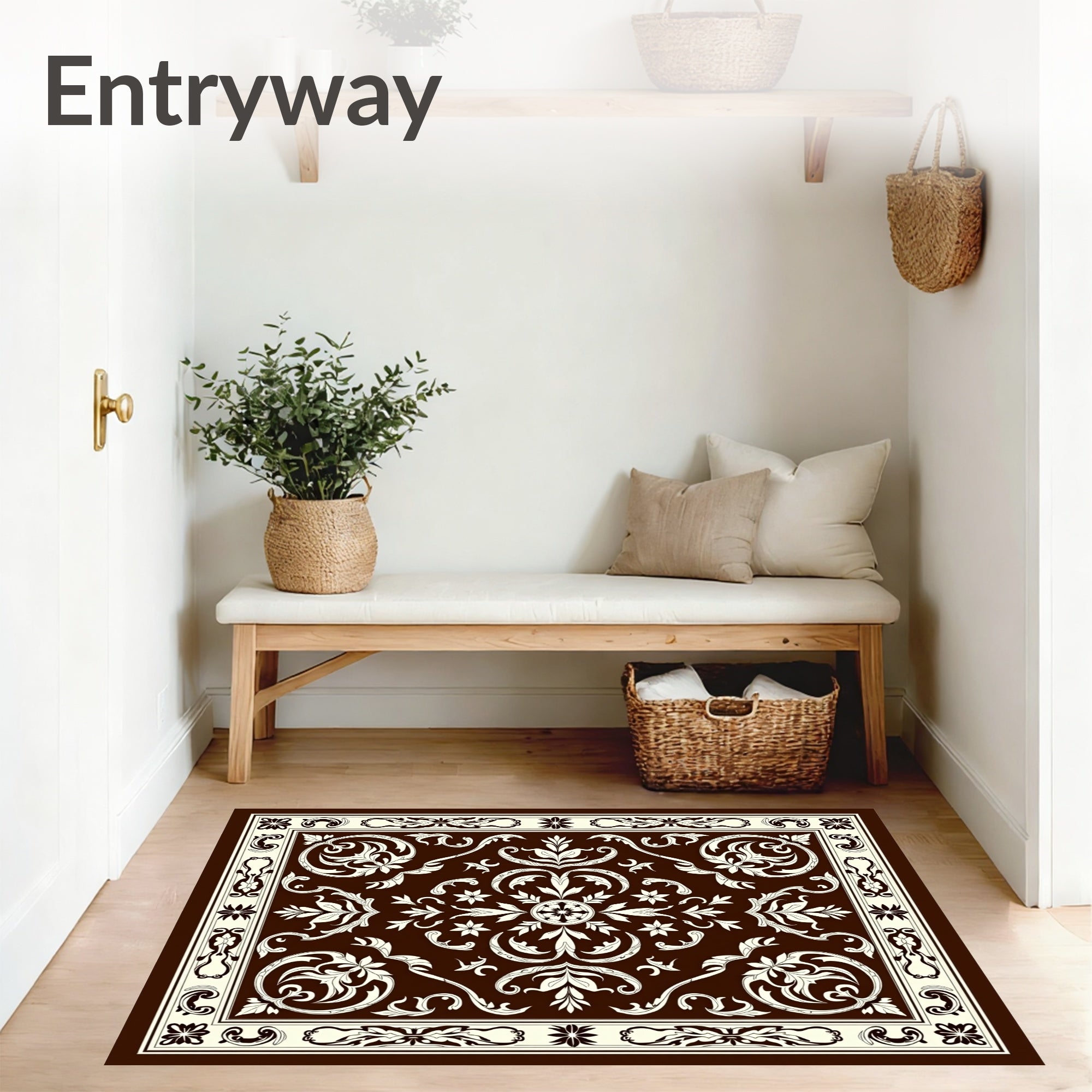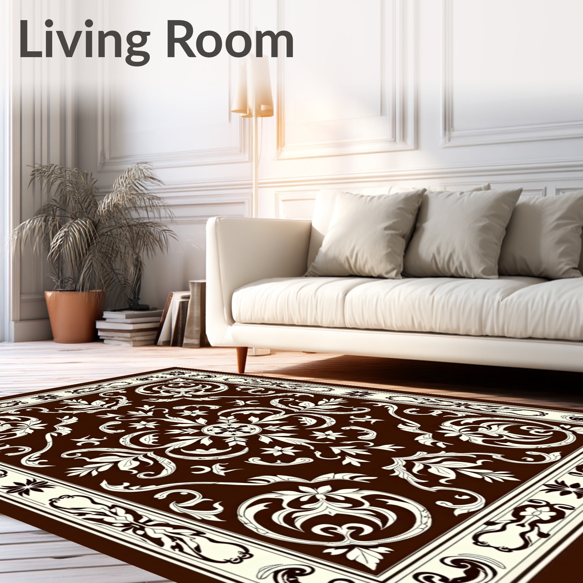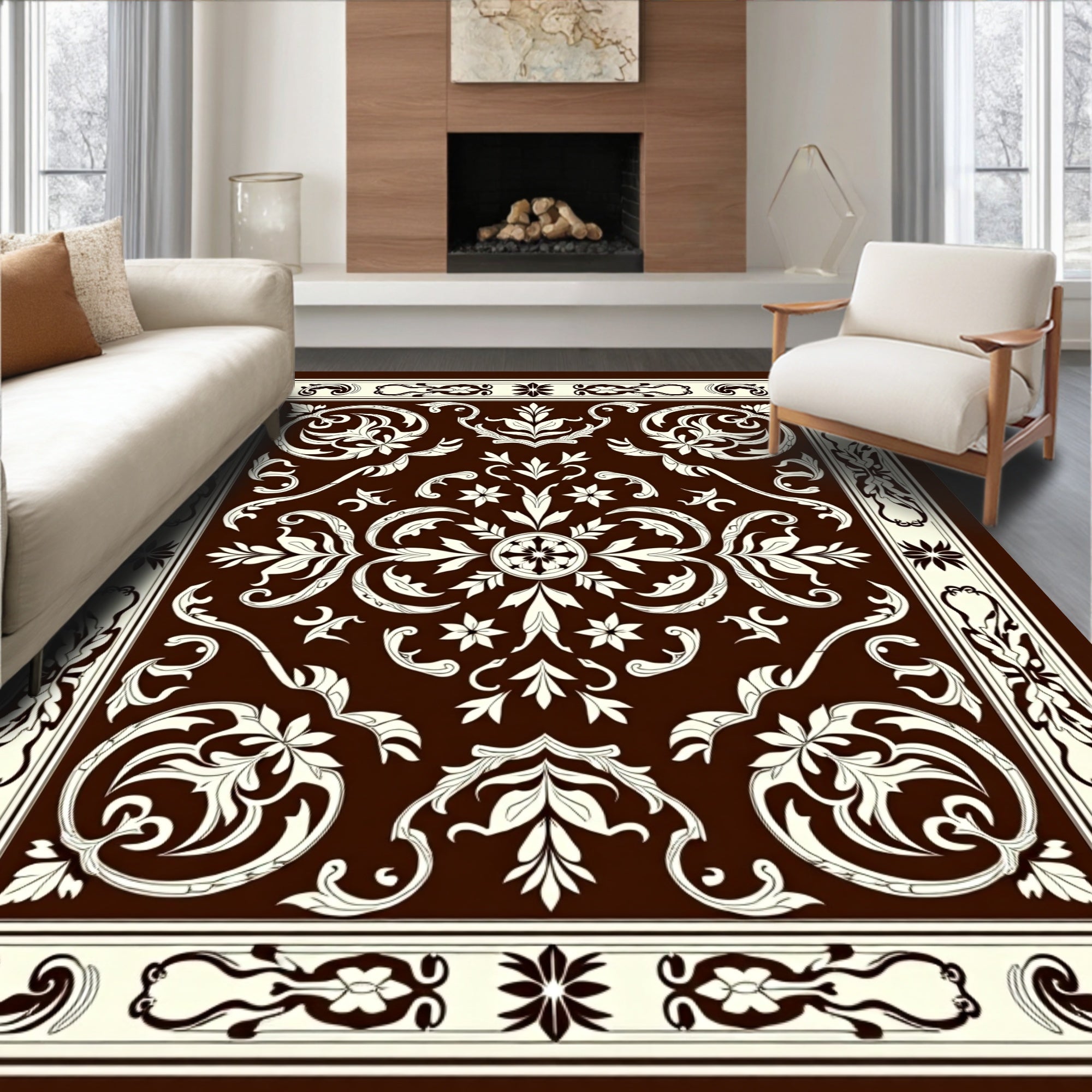 Flatwoven High Traffic Area Rug, Elegant Damask Flourish with Stylized Leaf and Baroque Inspired Detailing, Non Slip, Stain Resistant, Washable Area Rugs for Living Room, Bedroom (Brown) Overview: