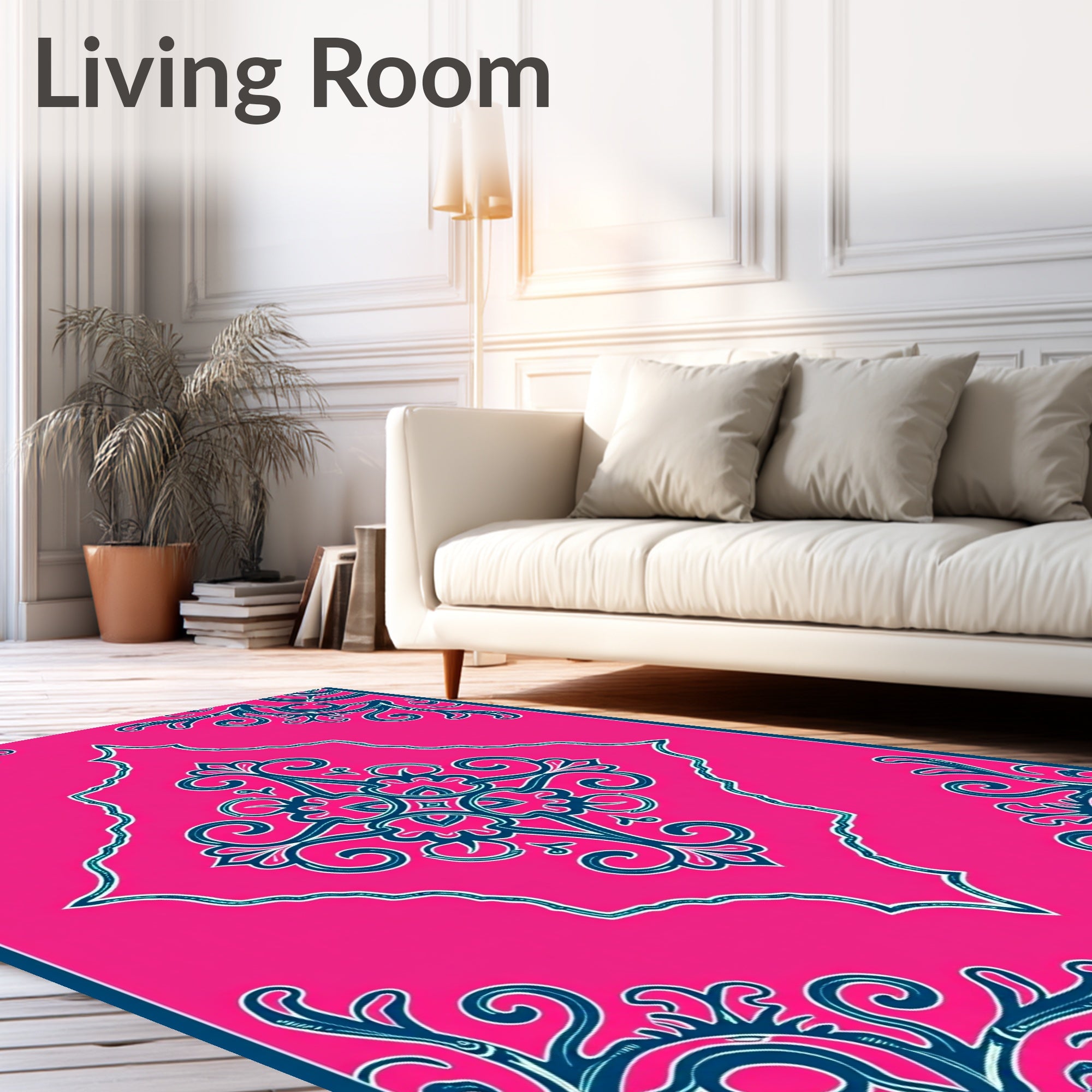 Flatwoven High Traffic Area Rug, Elegant Damask Motif with Symmetrical Interlocking Floral Embellishments, Non Slip, Stain Resistant, Washable Area Rugs for Living Room, Bedroom (Pink) Overview:
