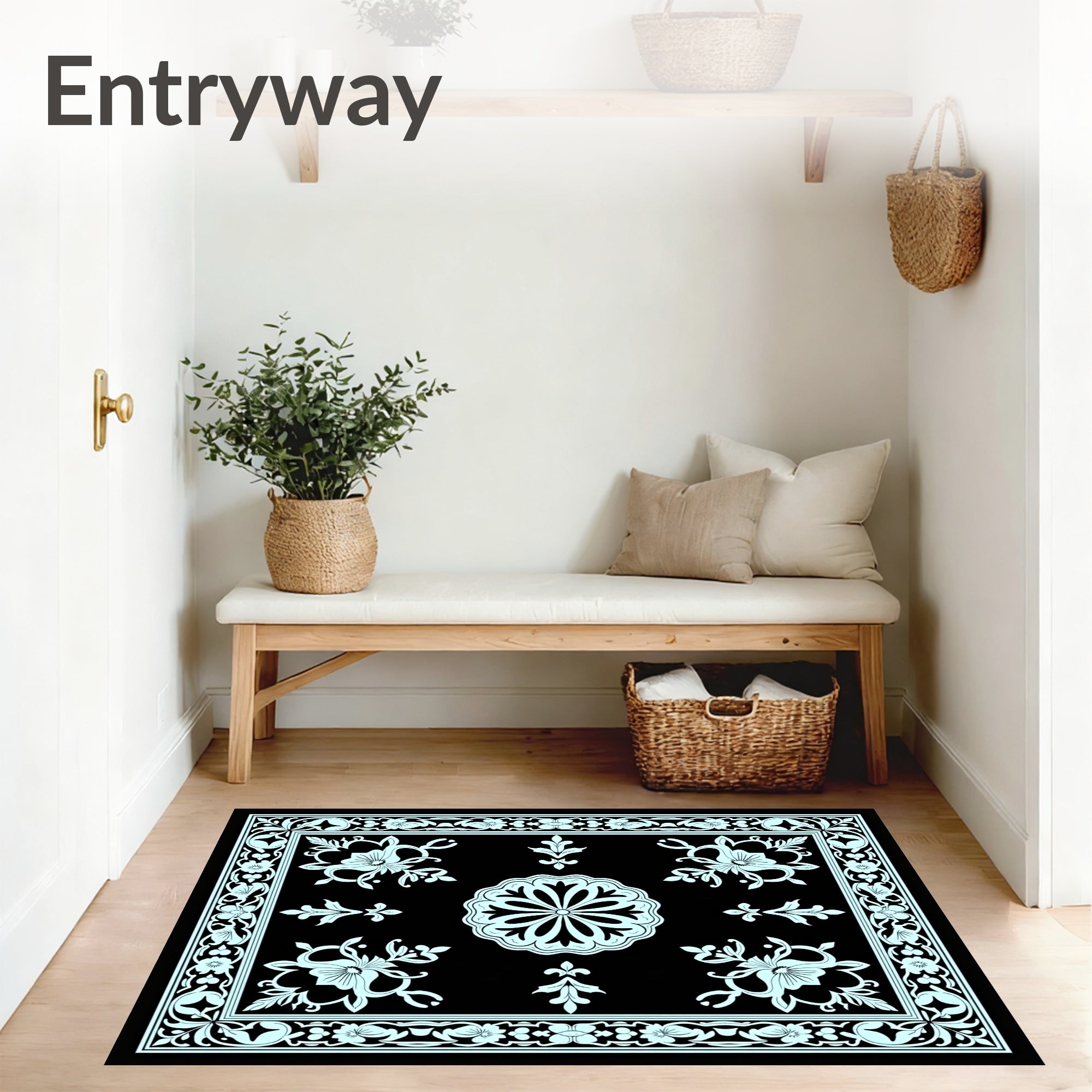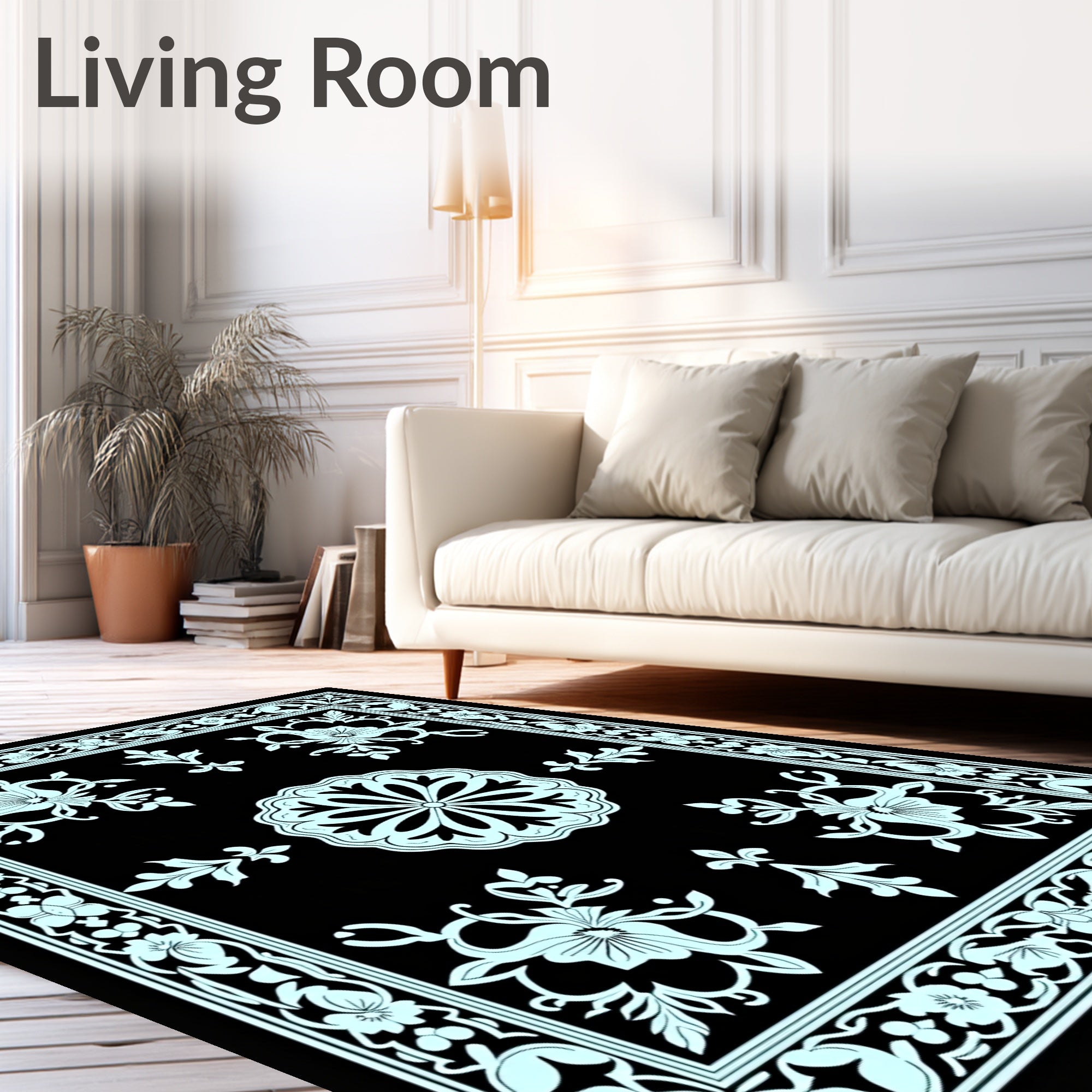 Flatwoven High Traffic Area Rug, Elegant Damask Scrollwork with Classic Floral Embellishments, Non Slip, Stain Resistant, Washable Area Rugs for Living Room, Bedroom (Black) Overview: