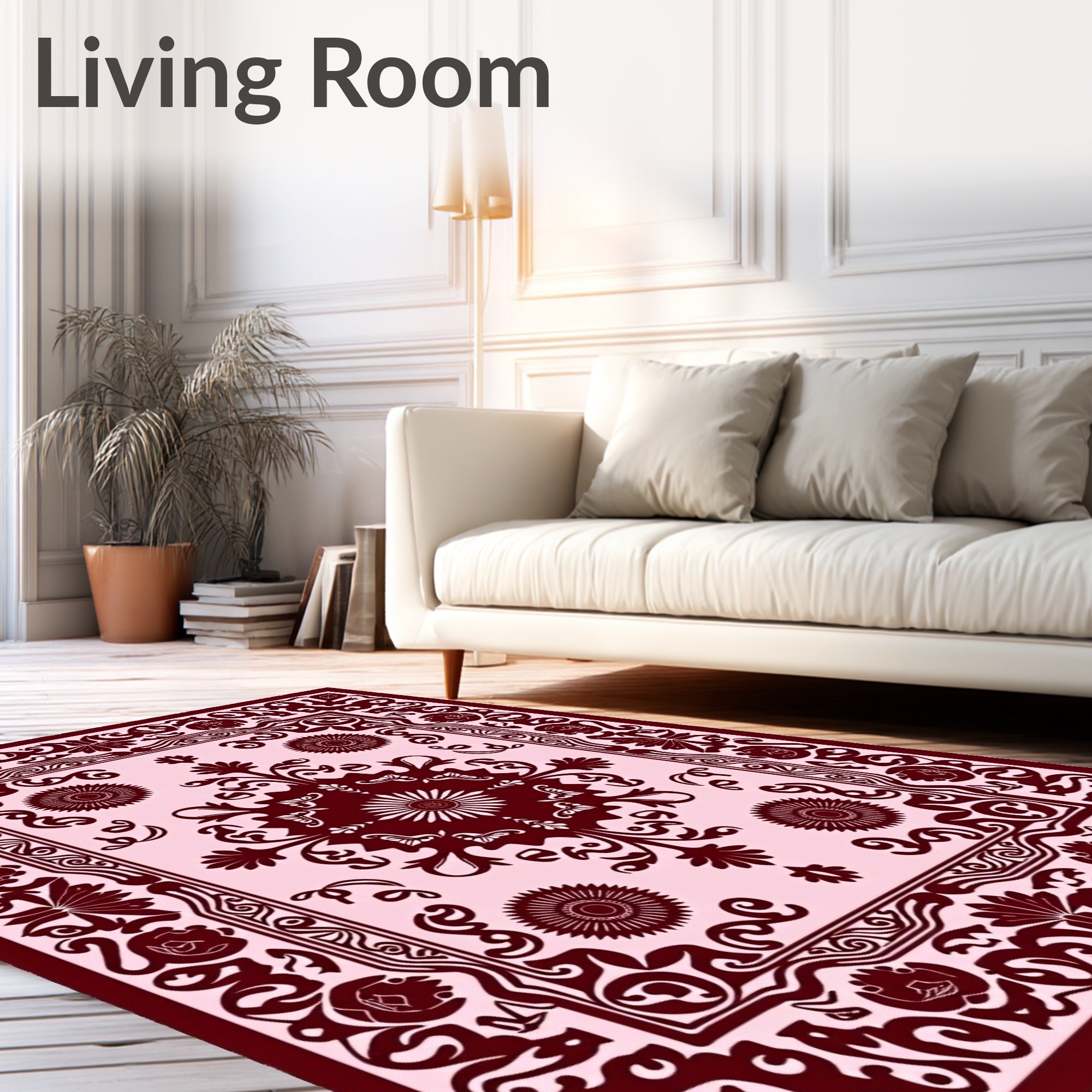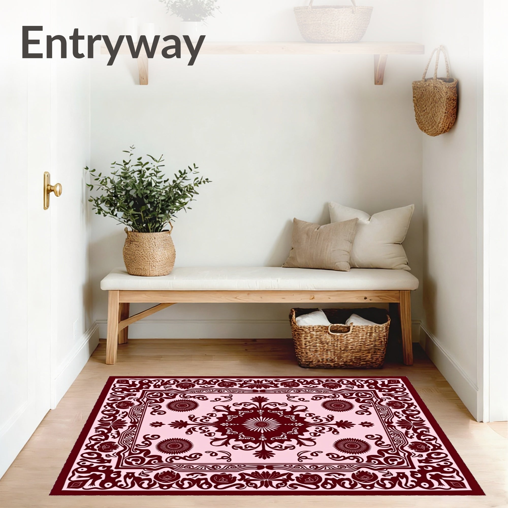 Flatwoven High Traffic Area Rug, Elegant Floral Medallion Scroll Paisley Vine Damask, Non Slip, Stain Resistant, Washable Area Rugs for Living Room, Bedroom (Pink) Overview:
