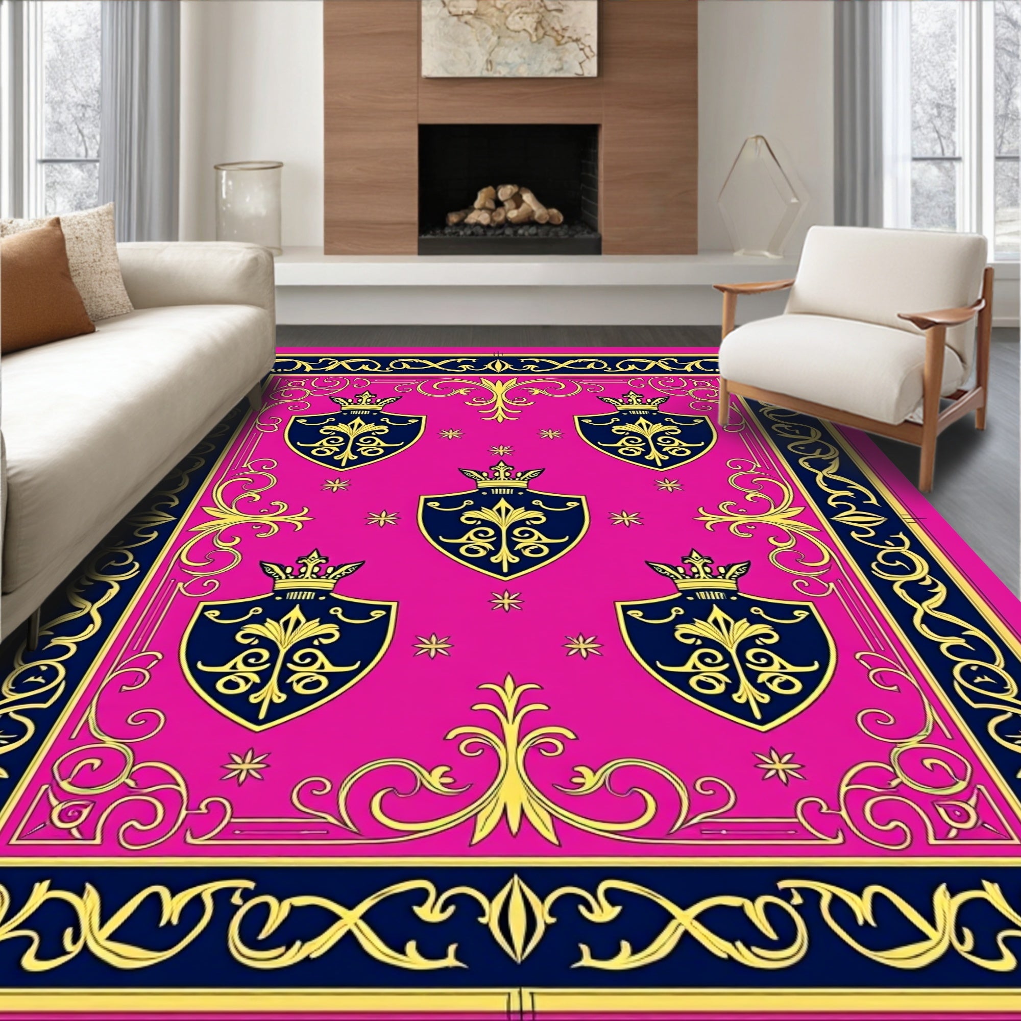Flatwoven High Traffic Area Rug, Emblem Heraldic Crest with Motifs, Non Slip, Stain Resistant, Washable Area Rugs for Living Room, Bedroom (Pink) Overview:
