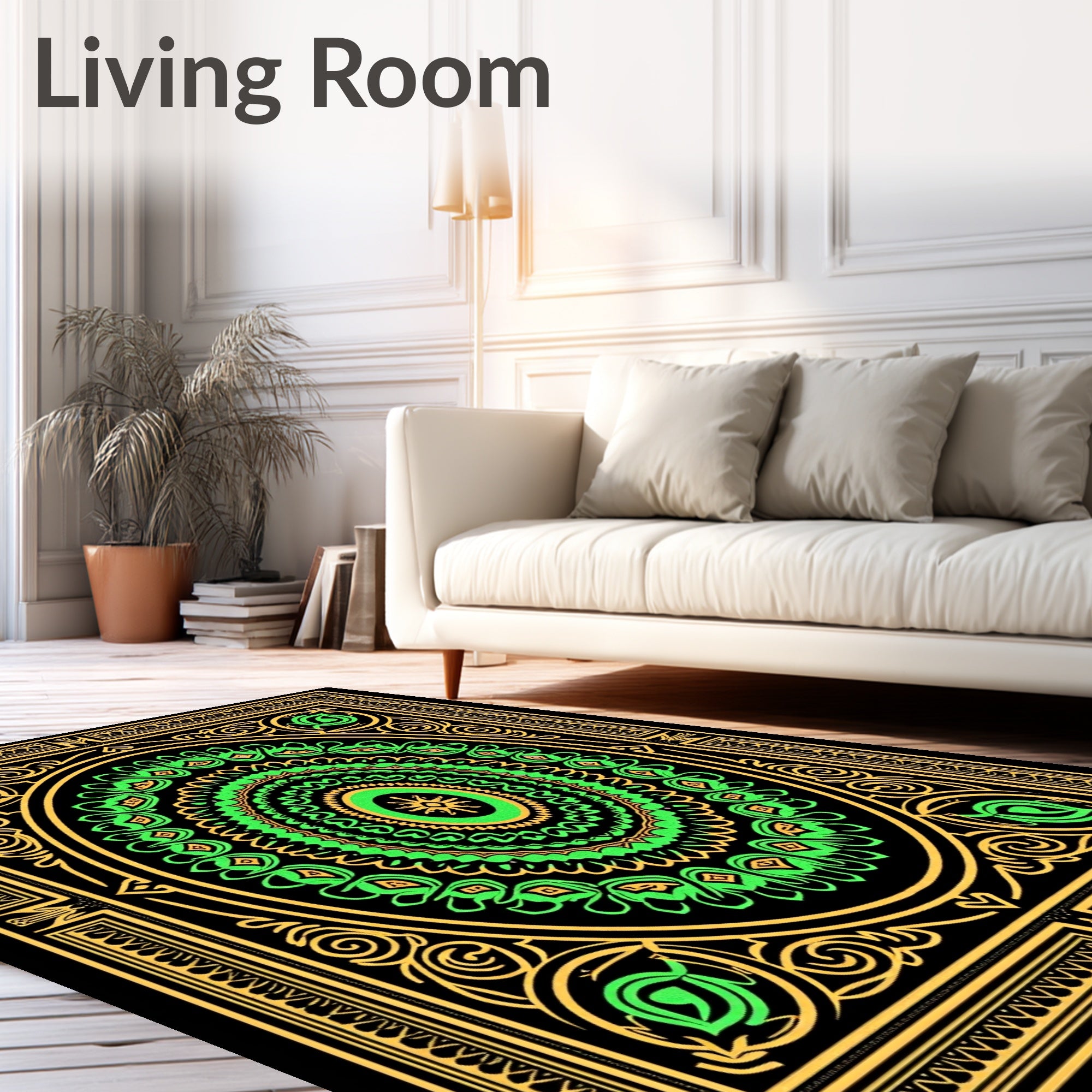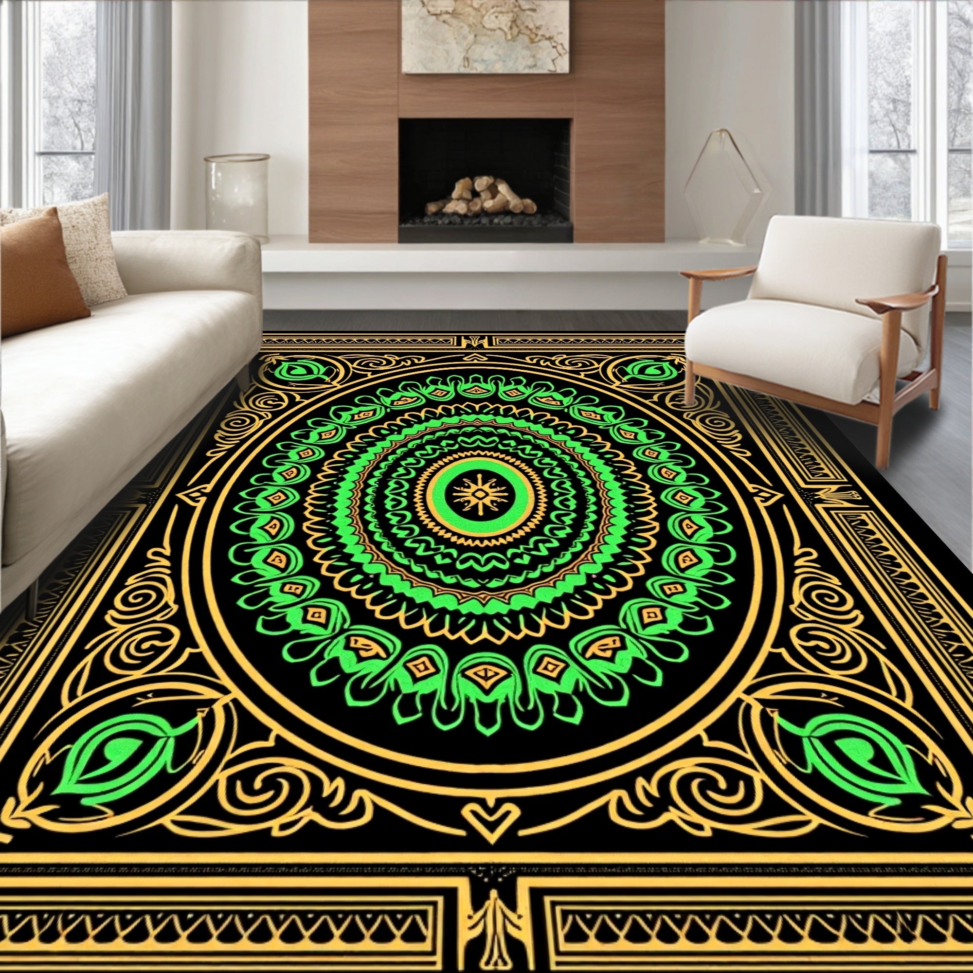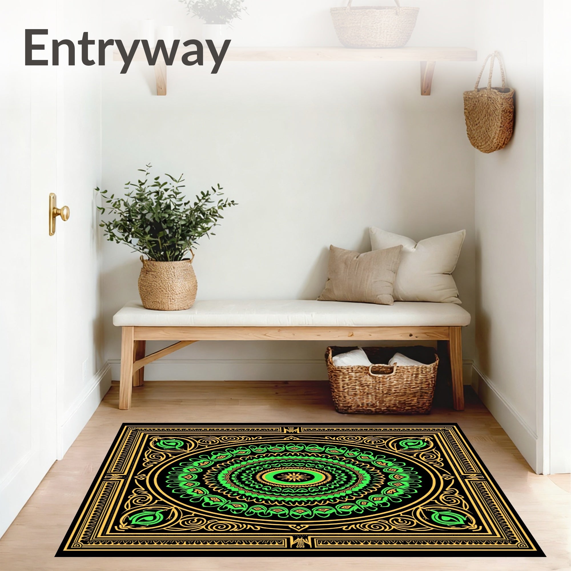 Flatwoven High Traffic Area Rug, Emerald Spiral Medallion with Intricate Interlocking Motifs, Non Slip, Stain Resistant, Washable Area Rugs for Living Room, Bedroom (Black) Overview: