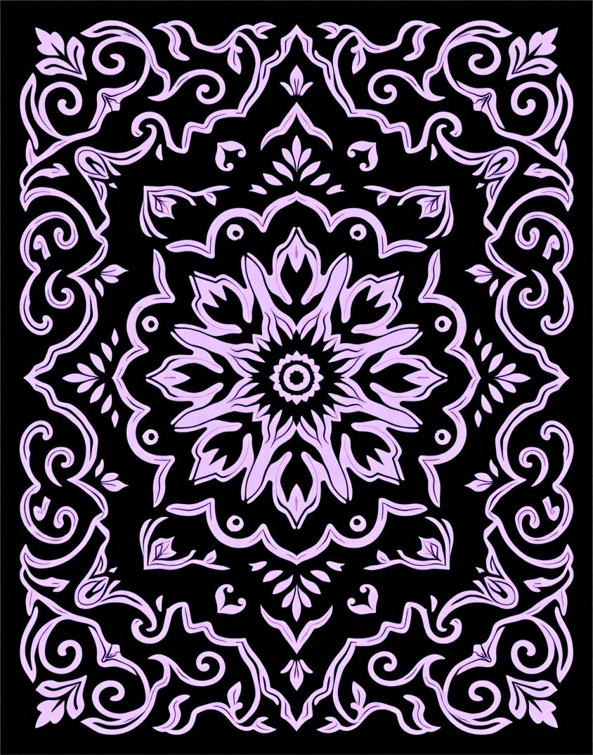 Floral Medallion Motif with Whimsical Vine Detailing and Ornate Scrollwork (Black)
