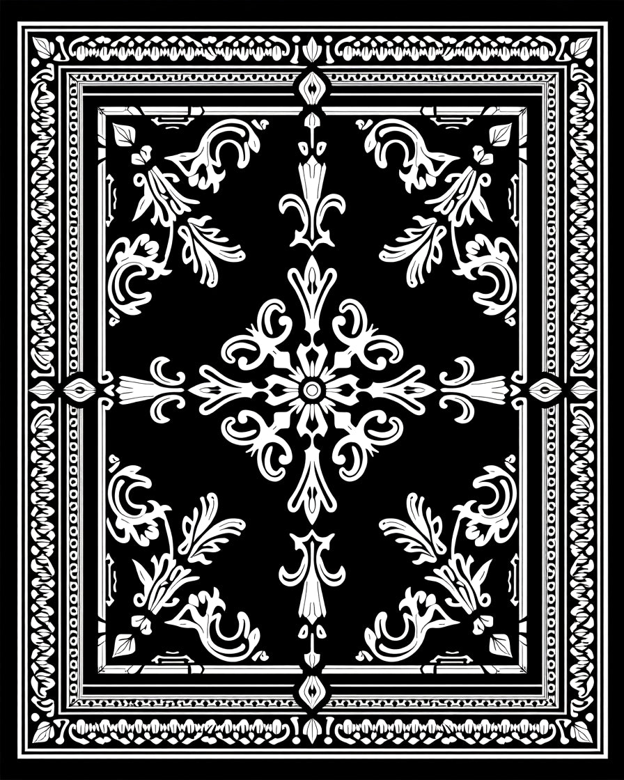 Latticework Damask with Baroque Filigree and Whimsical Florals (Black)