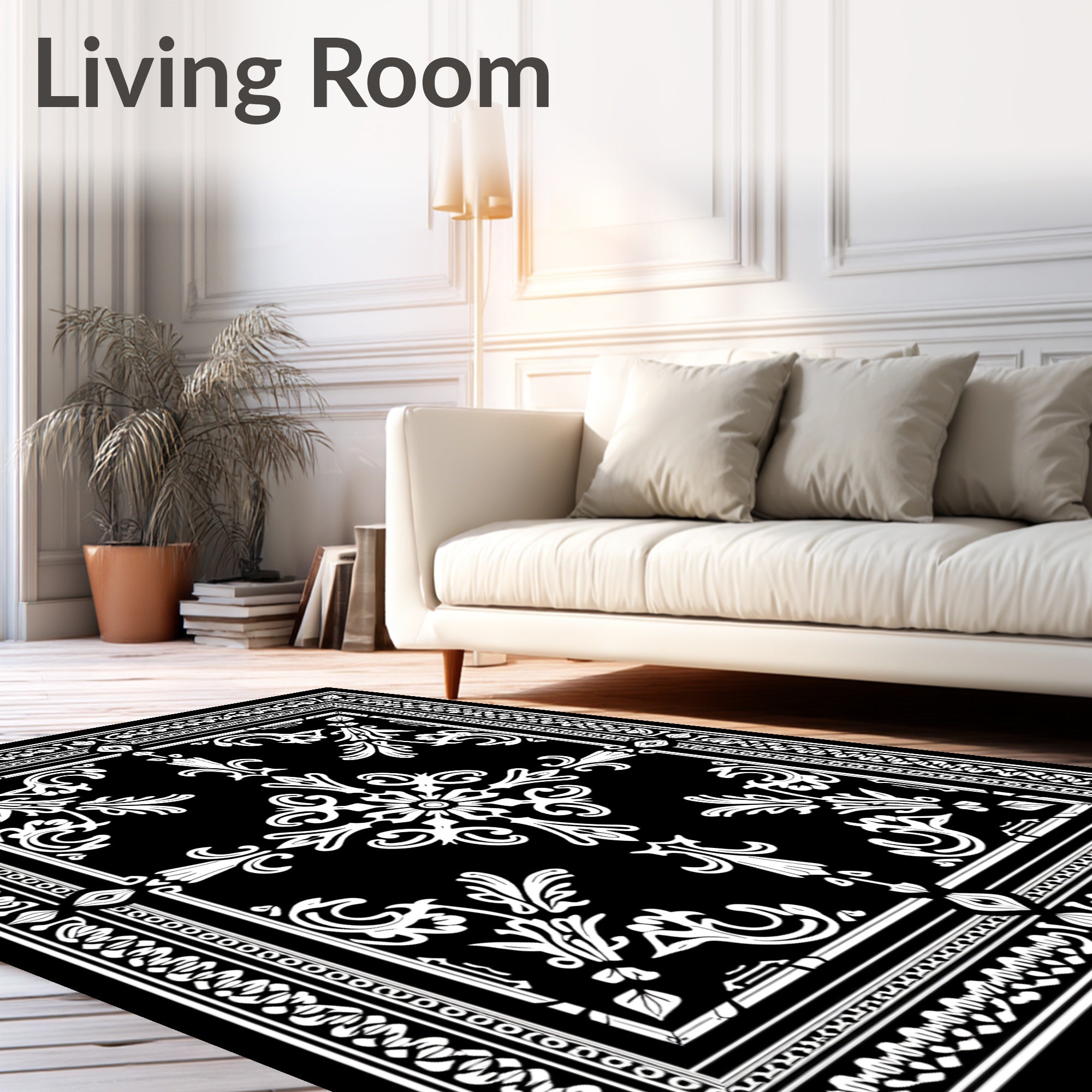 Flatwoven High Traffic Area Rug, Latticework Damask with Baroque Filigree and Whimsical Florals, Non Slip, Stain Resistant, Washable Area Rugs for Living Room, Bedroom (Black) Overview: