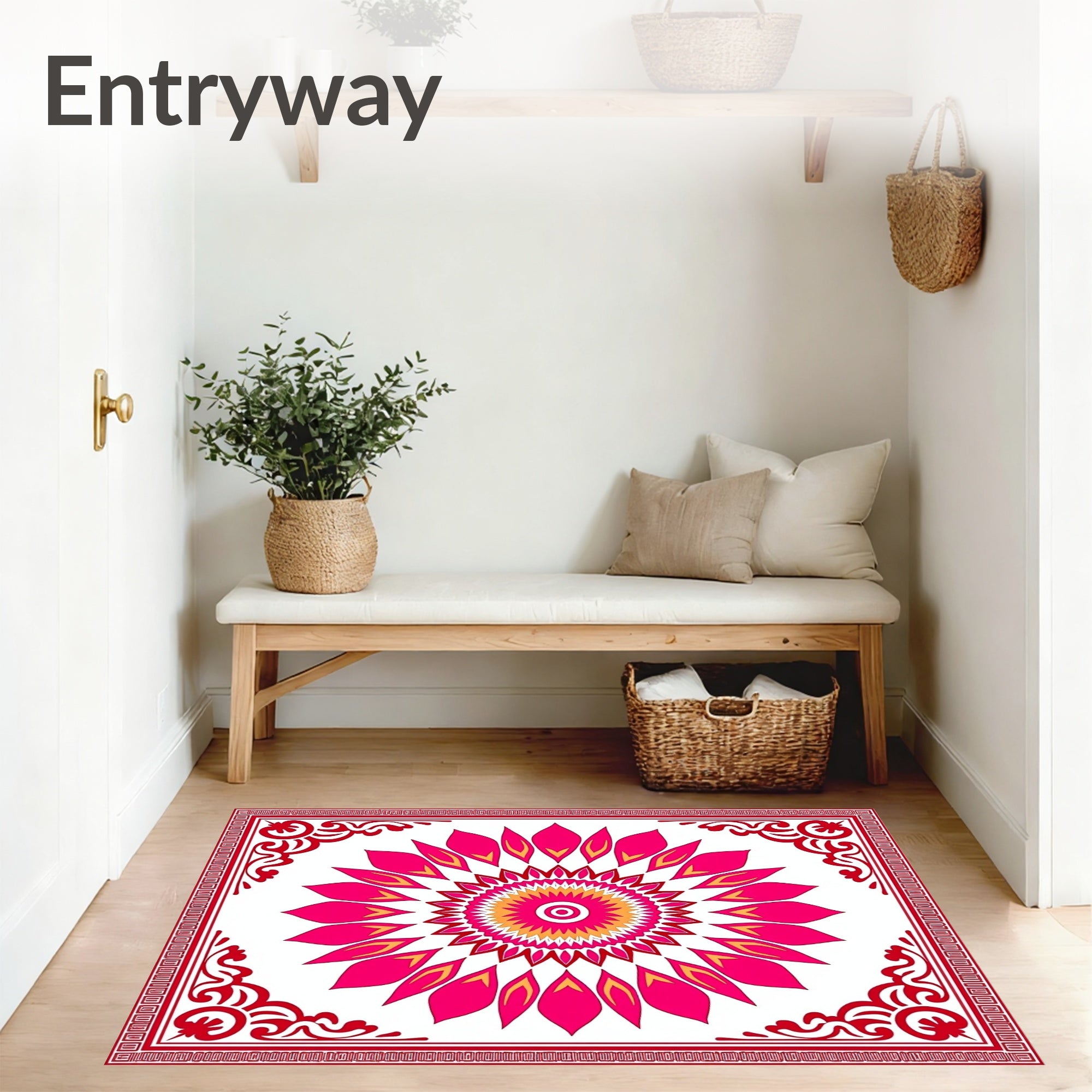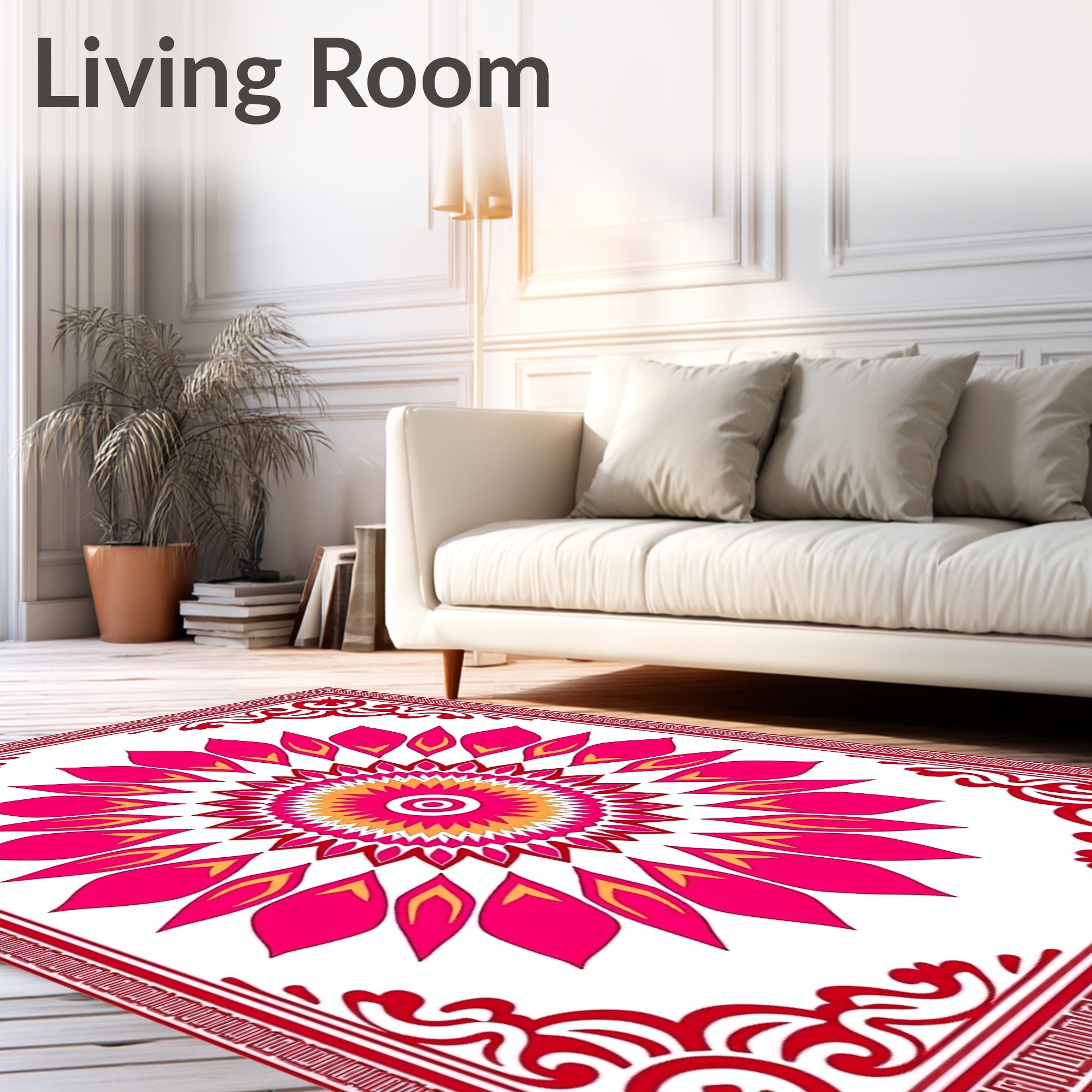 Flatwoven High Traffic Area Rug, Lotus Petal Formation with Ornate Symmetrical Details, Non Slip, Stain Resistant, Washable Area Rugs for Living Room, Bedroom (Pink) Overview: