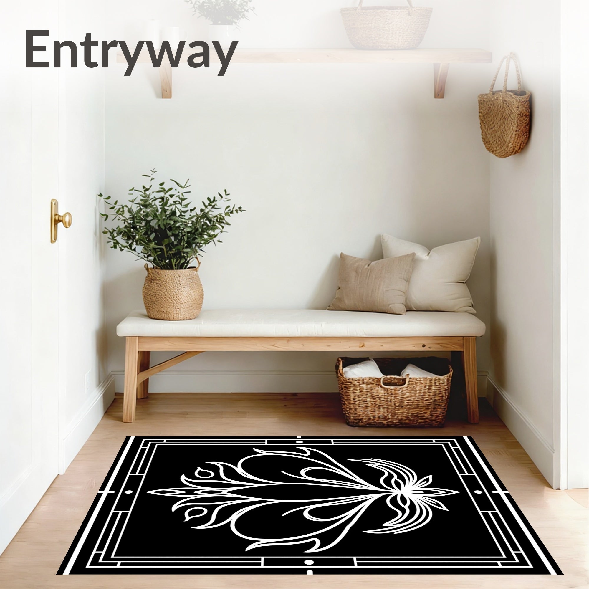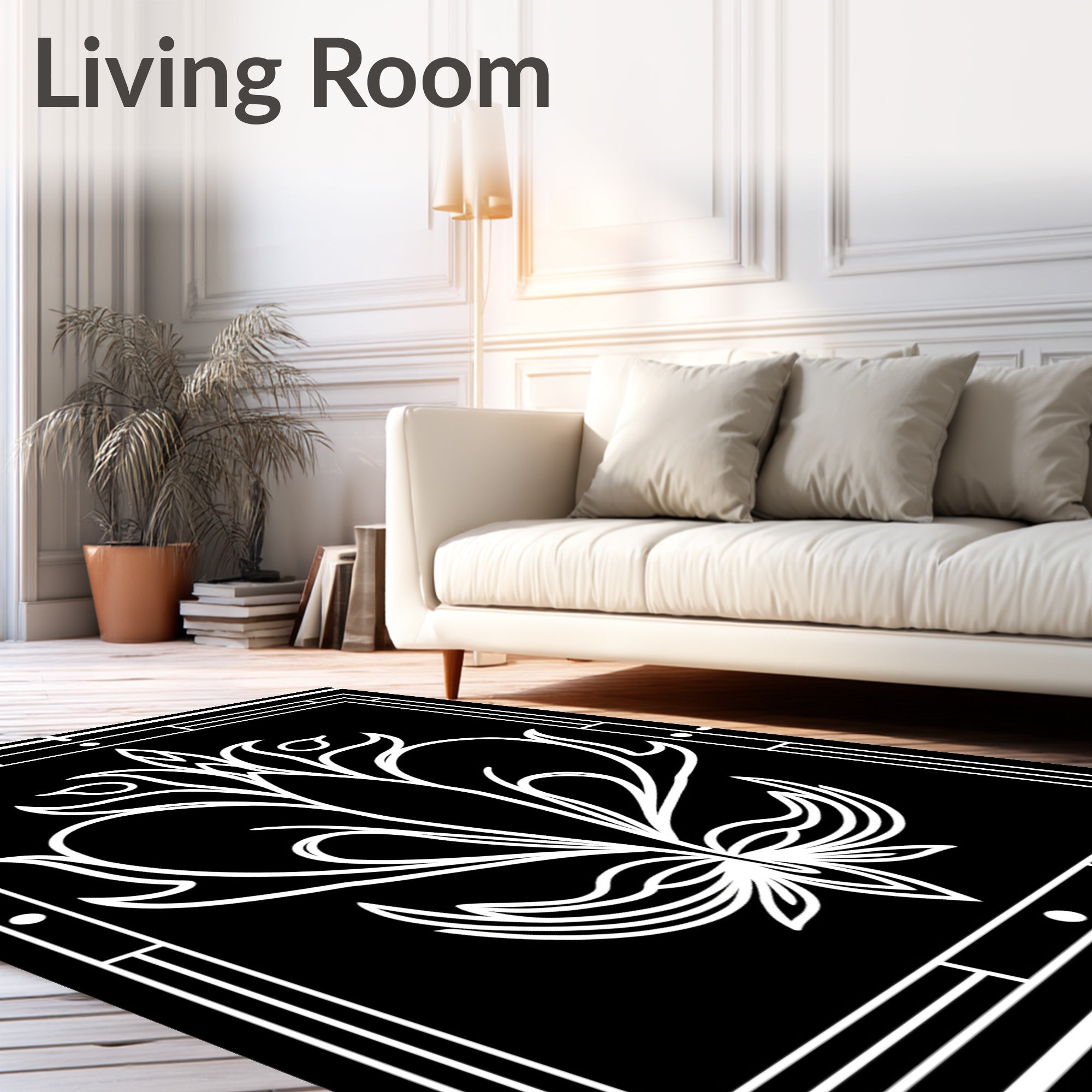 Flatwoven High Traffic Area Rug, Minimalist Lotus with Art Floral Filigree, Non Slip, Stain Resistant, Washable Area Rugs for Living Room, Bedroom (Black) Overview: