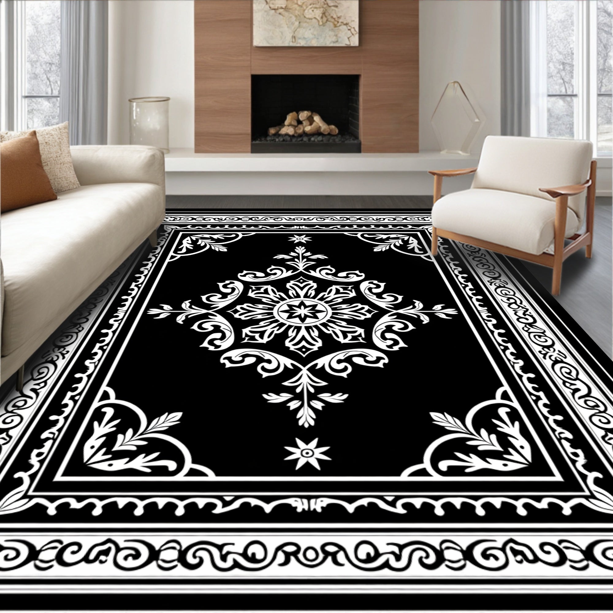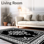 Flatwoven High Traffic Area Rug, Sophisticated Baroque Inspired with Flourished Floral Embellishments, Non Slip, Stain Resistant, Washable Area Rugs for Living Room, Bedroom (Black) Overview: