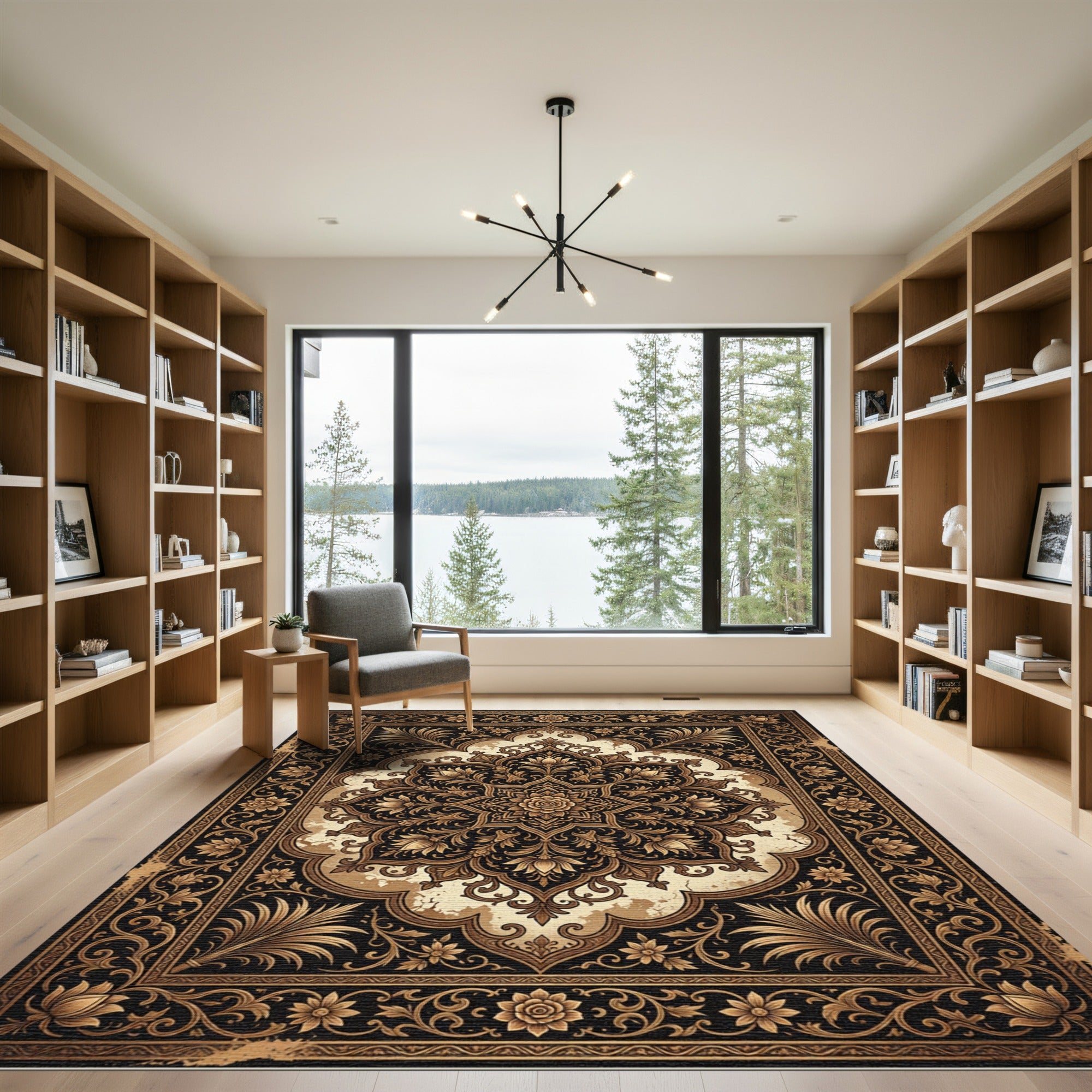 Elevate your living space with this exquisite area rug, featuring a stunning golden floral medallion on a deep black and ivory backdrop. This traditional design brings timeless elegance and intricate detail to any room, making it a perfect choice for living rooms, dining areas, or hallways. Crafted for longevity, this durable rug is also conveniently machine washable, ensuring effortless maintenance. Its OEKO-TEX Standard 100 certification guarantees it's free from harmful substances, prioritizing your family's well-being. Available in various sizes, this rug scales from cozy corners to open living areas and its low pile height ensures it fits seamlessly under doors and furniture, a practical yet luxurious addition to your home.
