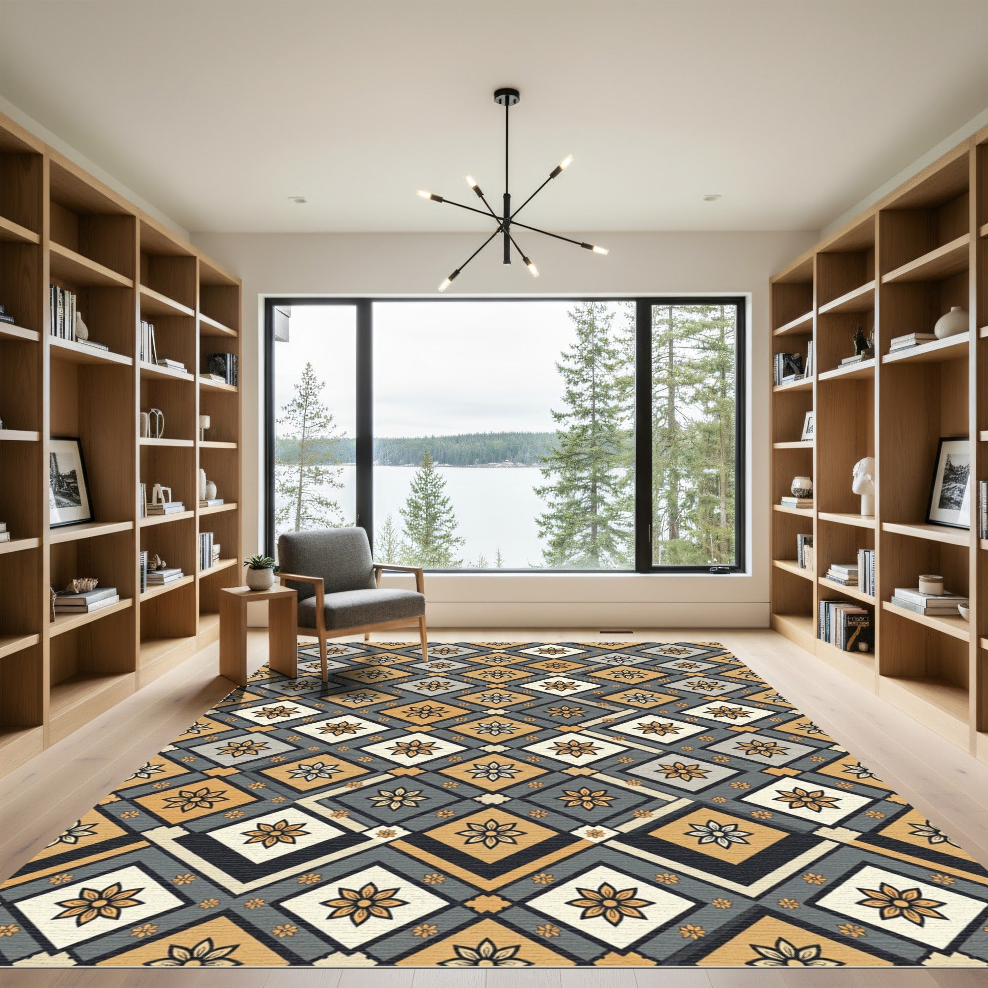 Drawing inspiration from the intricate mosaics of the Alhambra and the rhythmic geometry of traditional Moroccan stonework, this rug is a bridge between ancient craftsmanship and contemporary refinement. The pattern unfurls in a structured dance of golden mustard, charcoal, and ivory slate, where star-like blossoms nestle within sharp-edged diamonds. It captures a Neo-Traditional aesthetic, evoking the disciplined optimism of midcentury textile design while grounding your space in a legacy of global artistry. Step onto this field of interlocking forms, and the room transforms: the floor ceases to be a mere surface and becomes a carefully curated anchor for daily rituals. It is designed for the seeker of intentional living—those who value the friction between bold patterns and quiet, muted tones. Walk upon this modern mosaic and feel the space steady itself. This is not just an area rug; it is a grounding declaration of order, beauty, and grace.