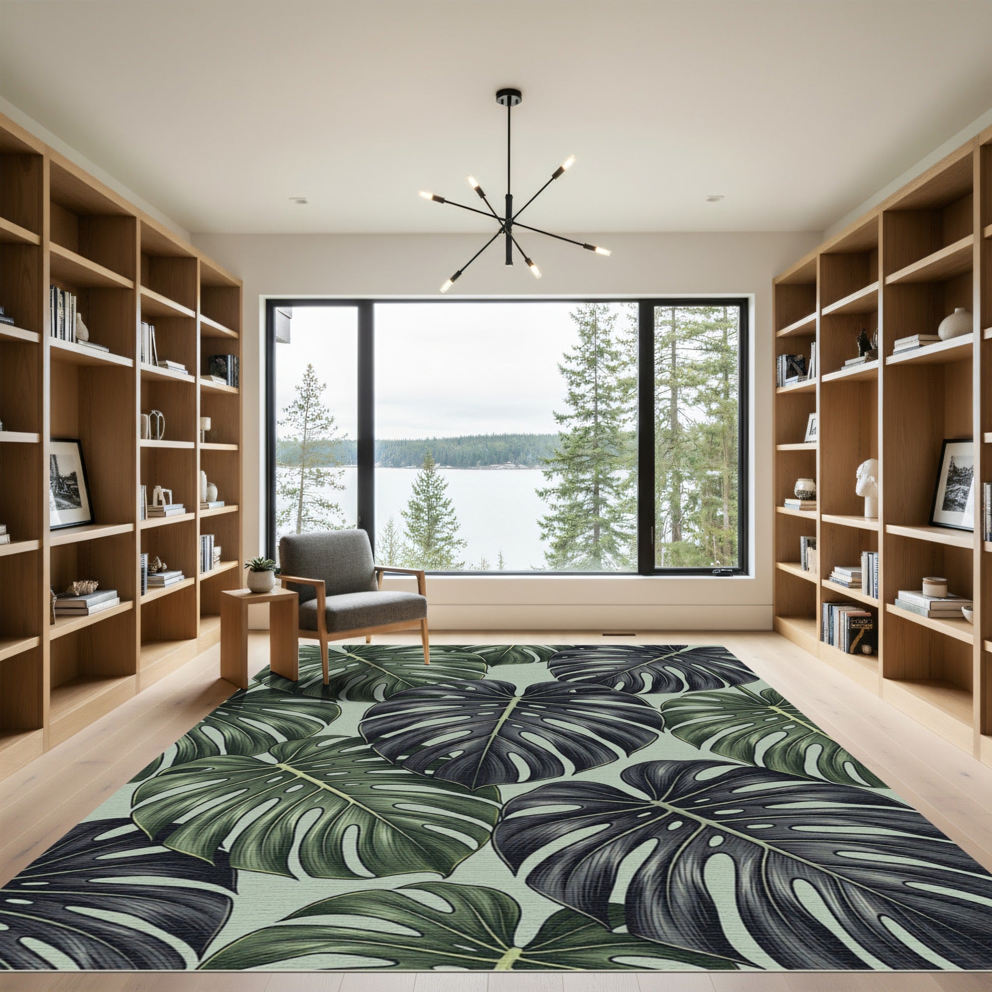 Transport yourself to a vibrant, verdant retreat with this exquisite rug, inspired by the bold, graphic lines of midcentury botanical illustrations and the timeless allure of tropical foliage. The striking contrast between the deep, moody charcoal and the vibrant, life-affirming green leaves evokes the dramatic interplay of light and shadow found in a dense rainforest canopy. This design speaks to the soul that yearns for an oasis of calm and an infusion of natural energy. Imagine stepping onto a floor that feels like a sun-dappled clearing, where the air is thick with the scent of exotic blooms and the only imperative is to breathe deeply. For the modern naturalist, the seeker of sanctuary, this rug transforms mere floor covering into a canvas of vibrant life. It’s for the home builder who believes that even the most utilitarian spaces can become havens of beauty. Don't just decorate your home—invite the wild, serene beauty of the tropics in. Live vibrantly.