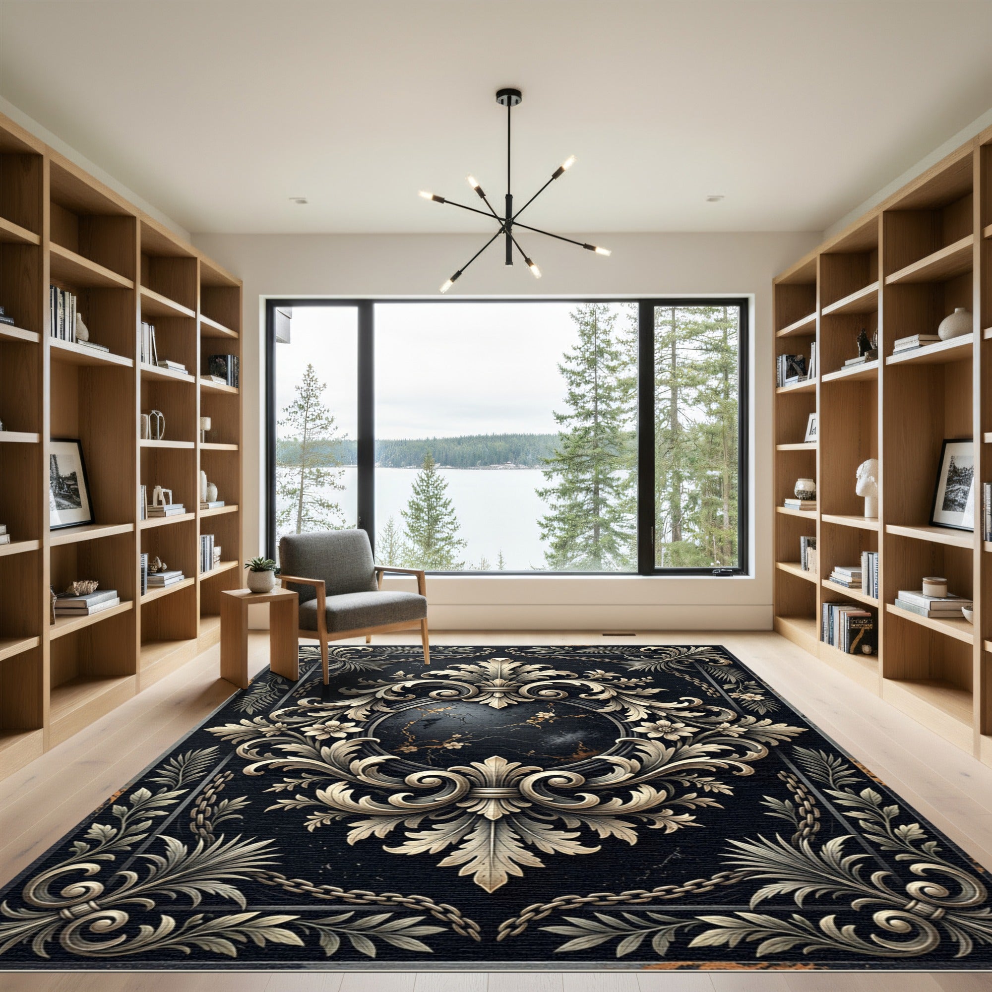 Elevate your space with this striking traditional area rug, featuring a dramatic Baroque floral motif set against a sophisticated black marble-effect background. Intricate scrolling acanthus leaves and delicate floral accents are rendered in a striking contrast of cream and gold, framed by a robust chain link border. This durable and machine washable rug is designed for both beauty and practicality, offering an OEKO-TEX Standard 100 certification for your peace of mind. Its sophisticated design makes it an ideal choice for living rooms or dining areas, bringing a touch of timeless elegance to any decor. Available in various sizes, this rug seamlessly adapts from cozy nooks to grand entertaining spaces.