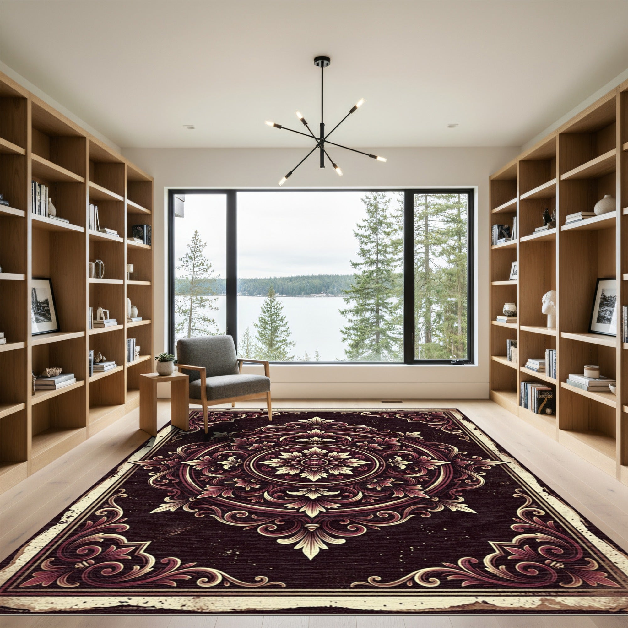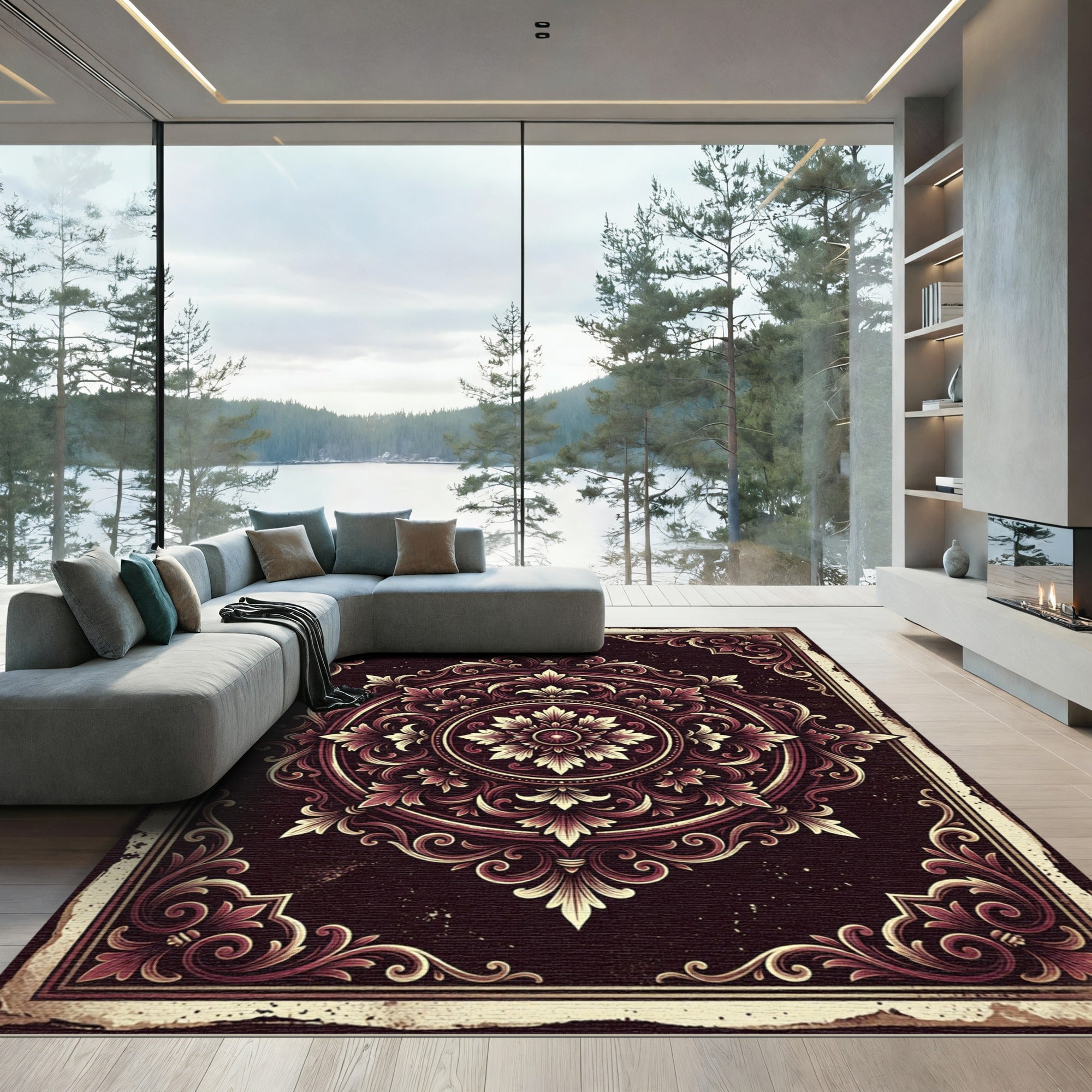 Elevate your living room with this exquisite area rug, designed to bring a touch of timeless elegance to any space. Its intricate, ornate pattern, reminiscent of classic Persian artistry, is rendered in rich burgundy and sophisticated gold tones against a deep, textured background. This rug isn't just beautiful; it's crafted for real life. Featuring durable construction, it's built to withstand the demands of high-traffic areas, making it a perfect choice for busy households. Plus, its machine washable nature ensures effortless cleaning and maintenance, while the OEKO-TEX Standard 100 certification guarantees it's free from harmful substances. Available in various sizes, this traditional rug seamlessly blends practicality with stunning aesthetics.