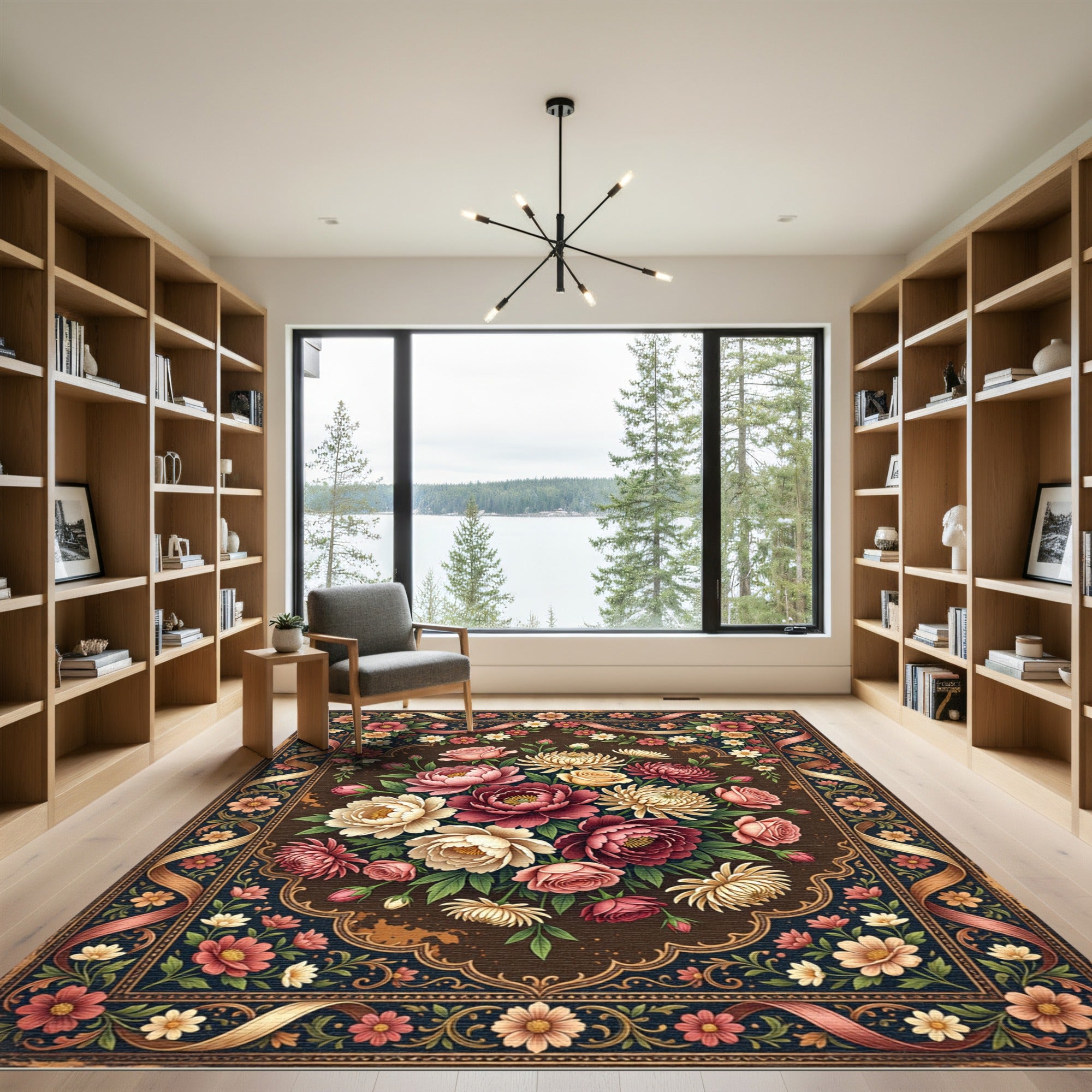 Channeling the opulent charm of Victorian conservatory gardens and the meticulous detail of 19th-century botanical illustrations, this rug is a celebration of enduring beauty. The central floral arrangement, a cascade of richly hued peonies and roses, evokes a sense of Romanticism, while the ornate border, with its interlacing ribbons and delicate daisy motifs, speaks to traditional textile artistry. This design is for the soul that finds solace in nature's artistry and believes that everyday spaces can be imbued with a sense of wonder. Imagine this rug not just as a floor covering, but as a portal to a sun-drenched, quiet afternoon, where the air is thick with the scent of blossoms. It transforms a room from merely functional to a sanctuary of cultivated calm, an ode to slow living and the enduring power of natural beauty. Don't just furnish your home—curate a narrative of grace and tranquility.