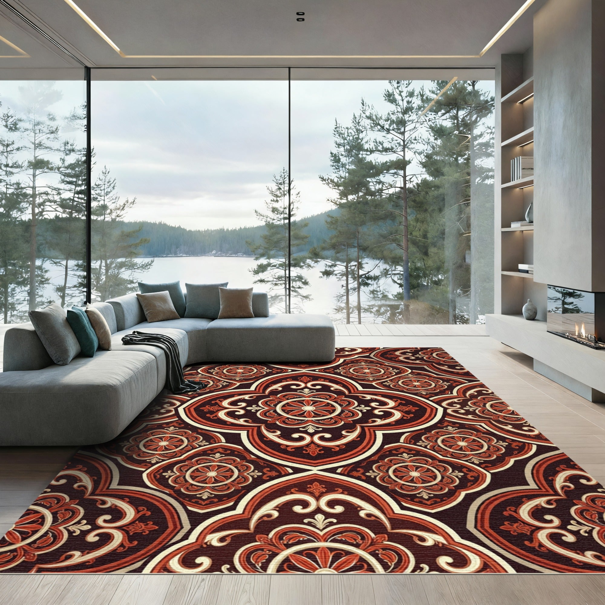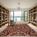Elevate your living room with this exquisite traditional area rug, featuring a rich, deep red floral medallion motif set against a dark background. Crafted for both beauty and resilience, this durable rug is machine washable, making it perfect for busy households. Its intricate patterns, reminiscent of vintage Moroccan tiles, add a touch of timeless elegance to any space. Certified OEKO-TEX Standard 100, it ensures a safe and healthy environment. Available in various sizes, this rug can seamlessly transform small nooks or anchor expansive living areas with its striking design and practical, low-maintenance charm.