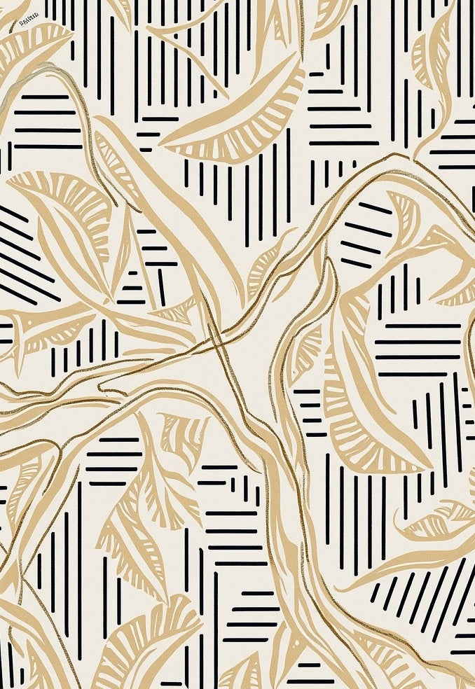 Abstract Angular Network with Black Stripes and Leaf Shapes(Beige)