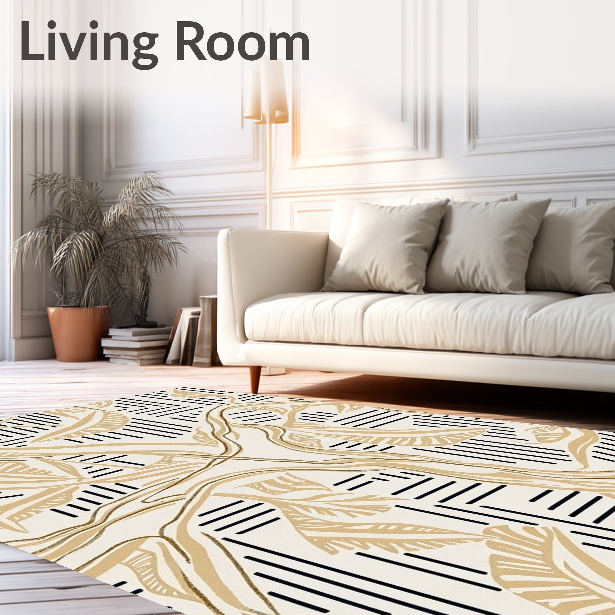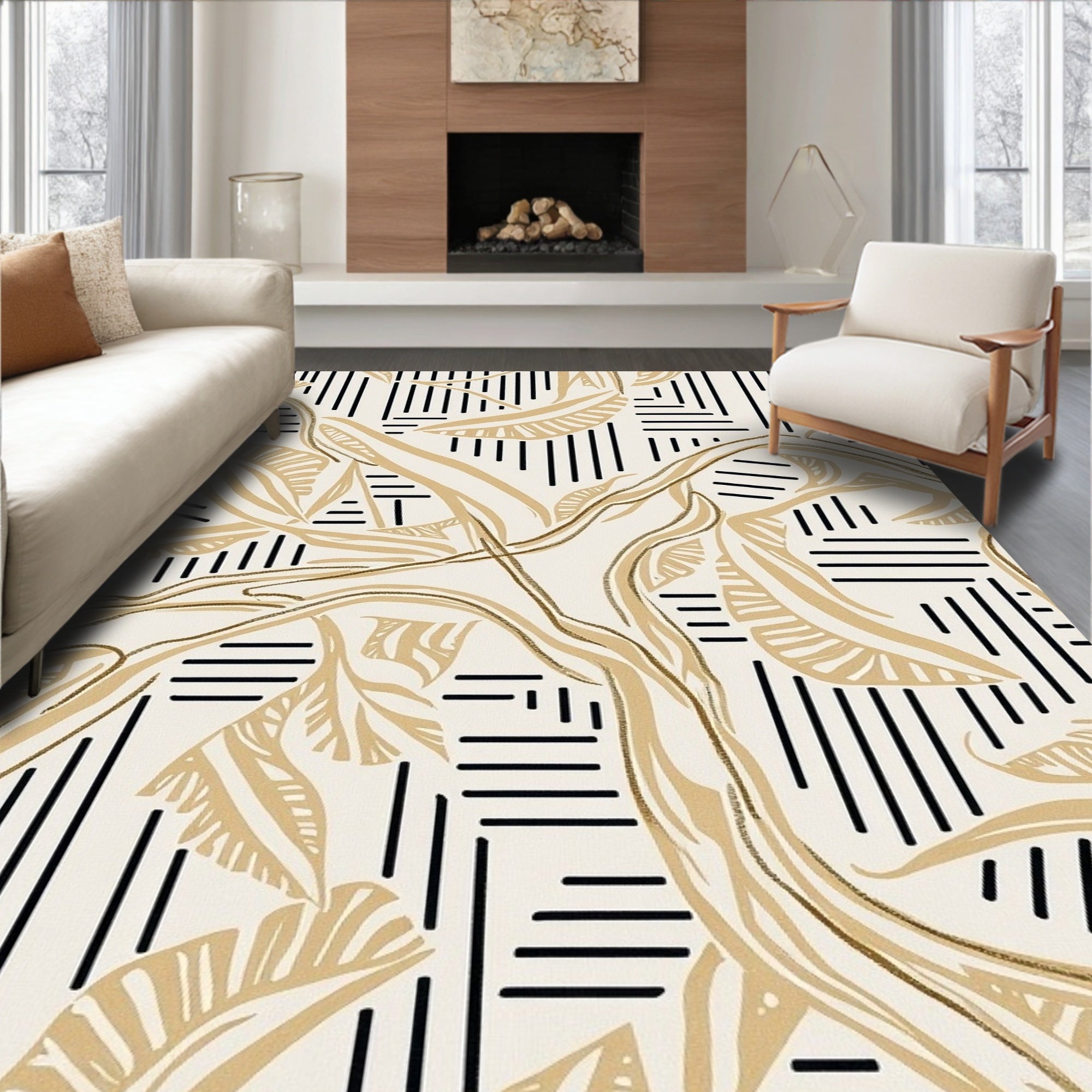 Flatwoven High Traffic Area Rug, Abstract Angular Network with Black Stripes and Leaf Shapes, Non Slip, Stain Resistant, Washable Area Rugs for Living Room, Bedroom (Beige) Overview: