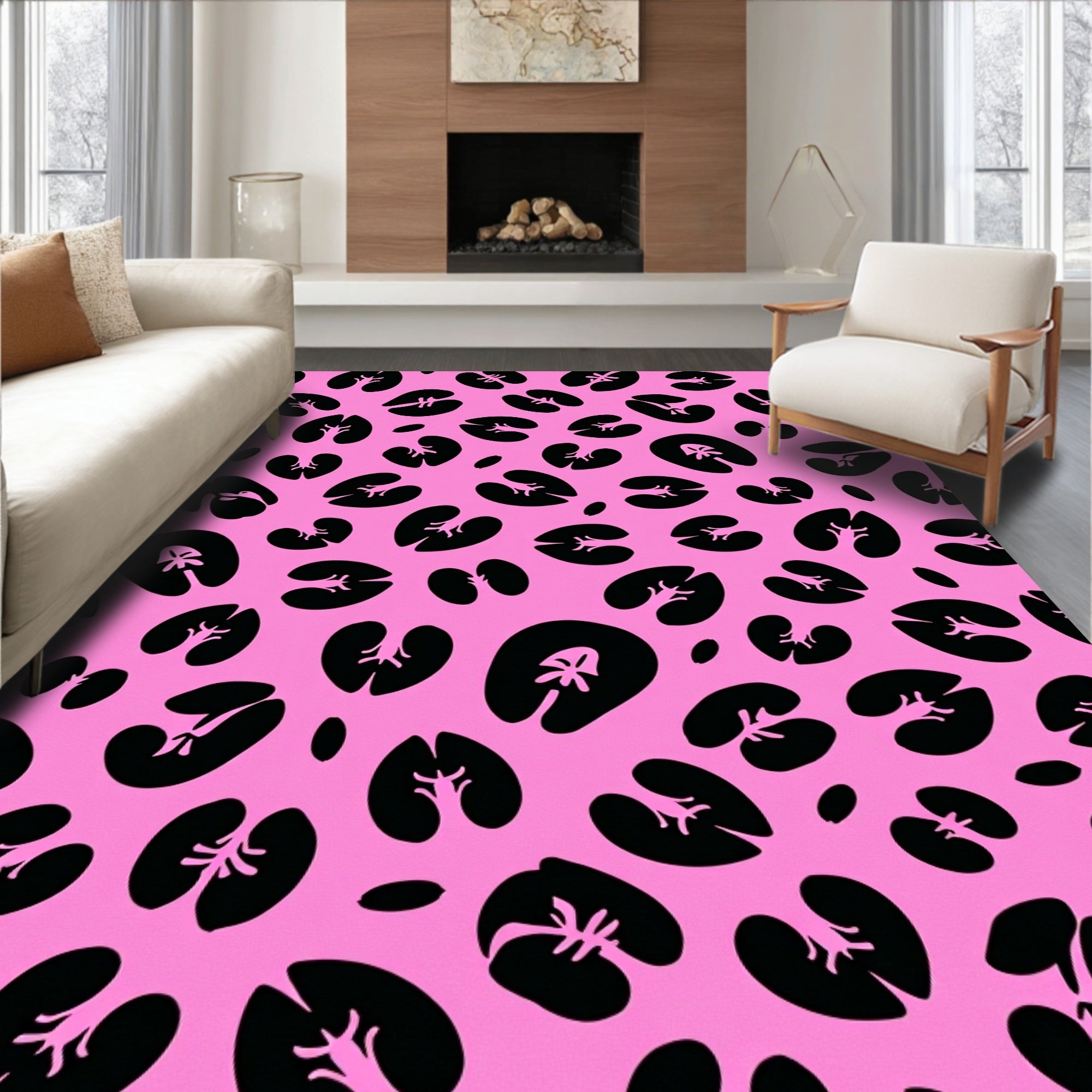 Drawing from the subversive energy of 1980s New Wave graphics and the playful organicism of Mid-Century Atomic design, this rug is a visual ode to the boldest eras of interior expression. The kidney-shaped motifs float like liquid punctuation across a neon-soaked field, reminiscent of Marimekko’s unapologetic shapes or the high-glam animal prints that defined Sunset Strip maximalism. The ink-black silhouettes bloom across the electric pink canvas like cellular life viewed through a kaleidoscopic lens, creating a rhythmic dance of void and saturation. When introduced to a room, the atmosphere instantly heightens; standard walls dissolve into a gallery of pop-art rebellion, while the floor becomes an electric stage for self-expression. It is designed for the unafraid homebuilder—the soul who finds comfort in the loud, the tactile, and the avant-garde. This is not just a floor covering; it is a declaration of presence. Walk upon art that pulses with life. Live in a state of high-fidelity color.