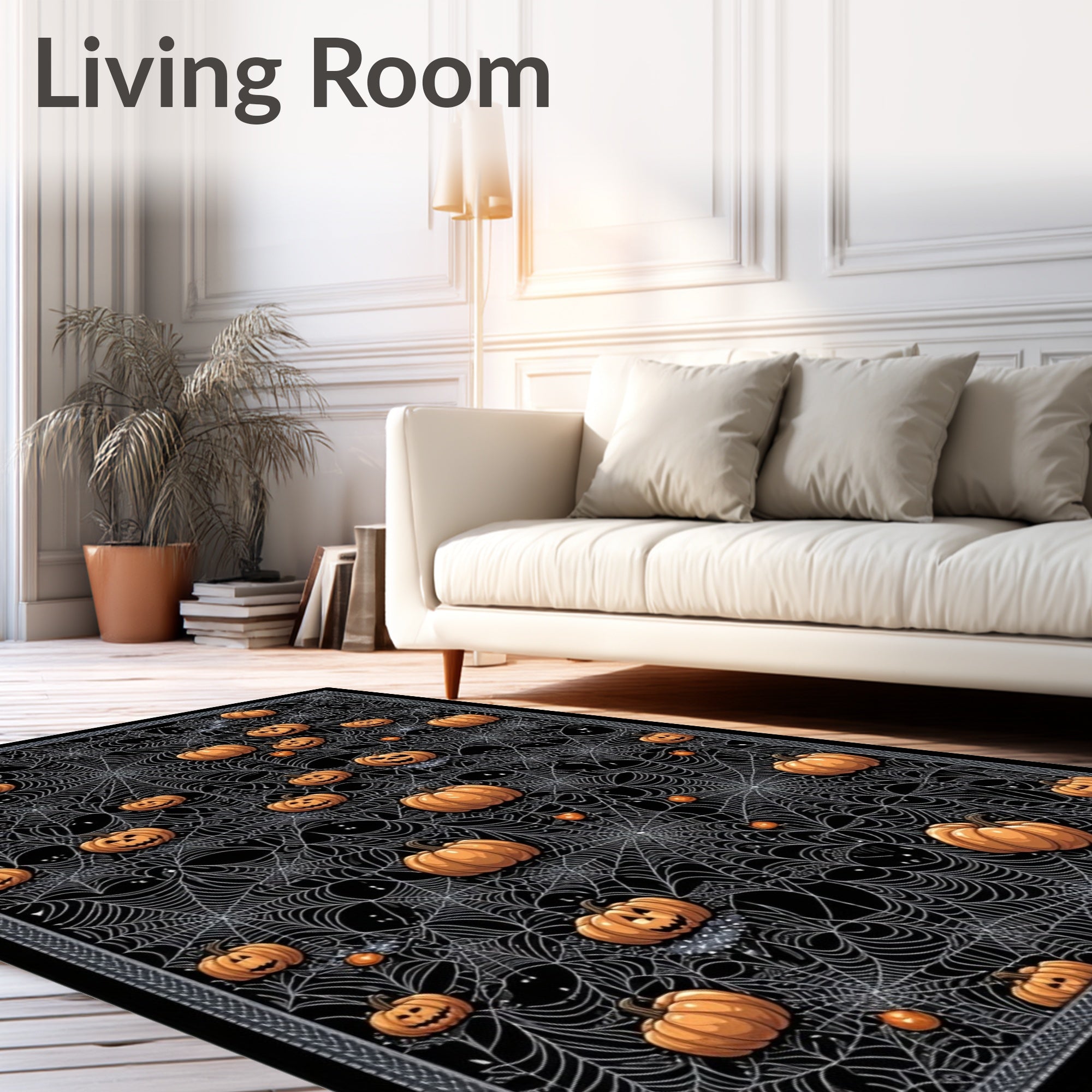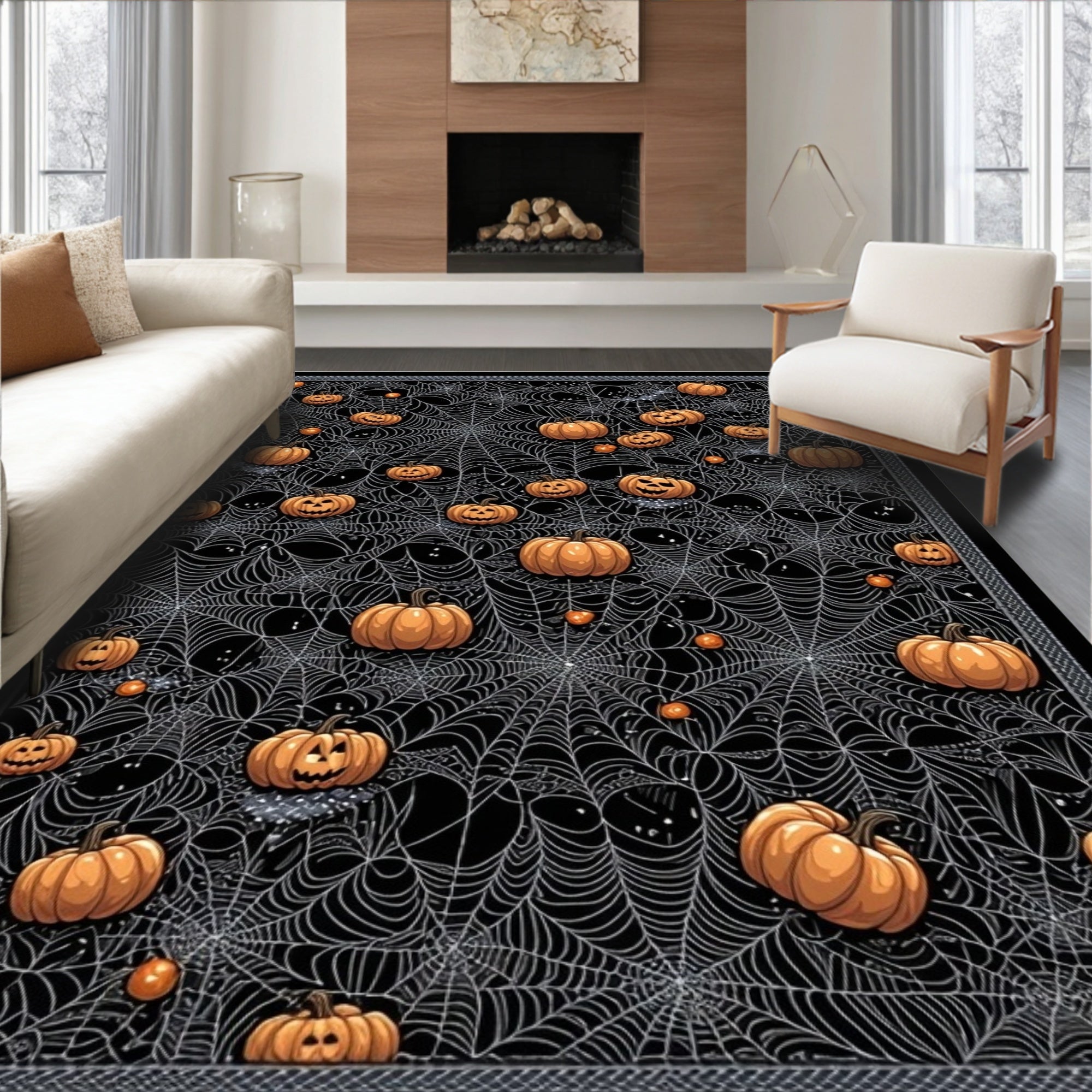 Ultra Soft Area Rug, Non Slip, Stain Resistant, Washable Area Rugs for Living Room, Bedroom, Abstract Spider Web and Pumpkin Motif Round with Gothic Charm(Orange) Overview:
