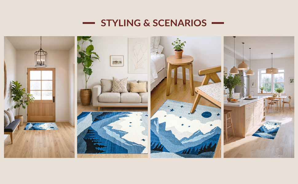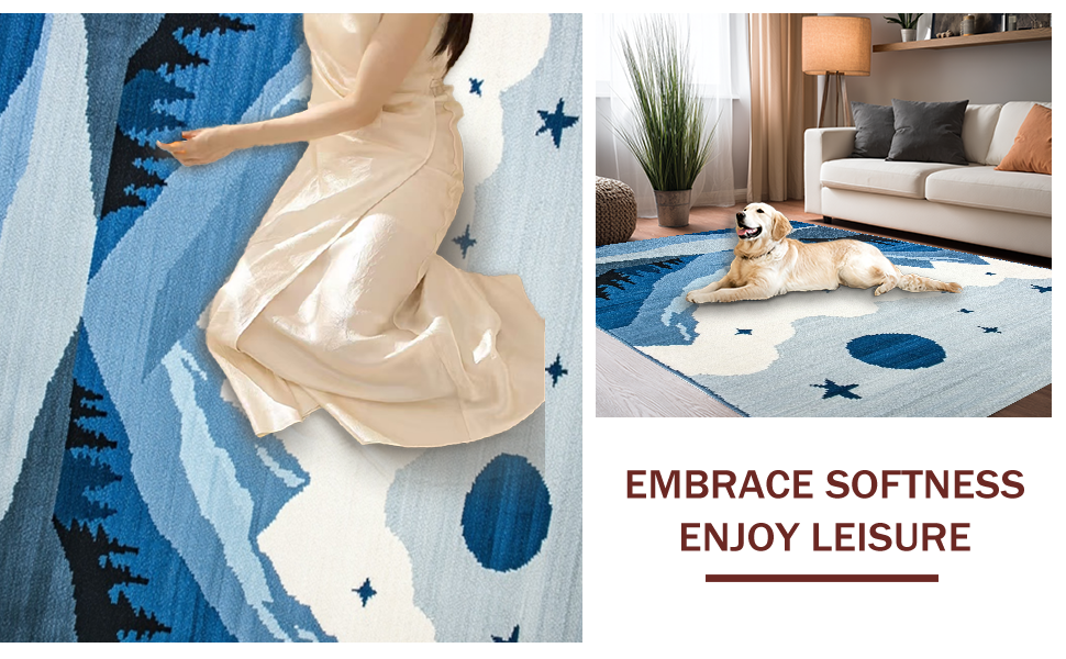 Ultra Soft Area Rug, Non Slip, Stain Resistant, Washable Area Rugs for Living Room, Bedroom, Adventurous Sky and Peaks Theme(Blue) Overview: