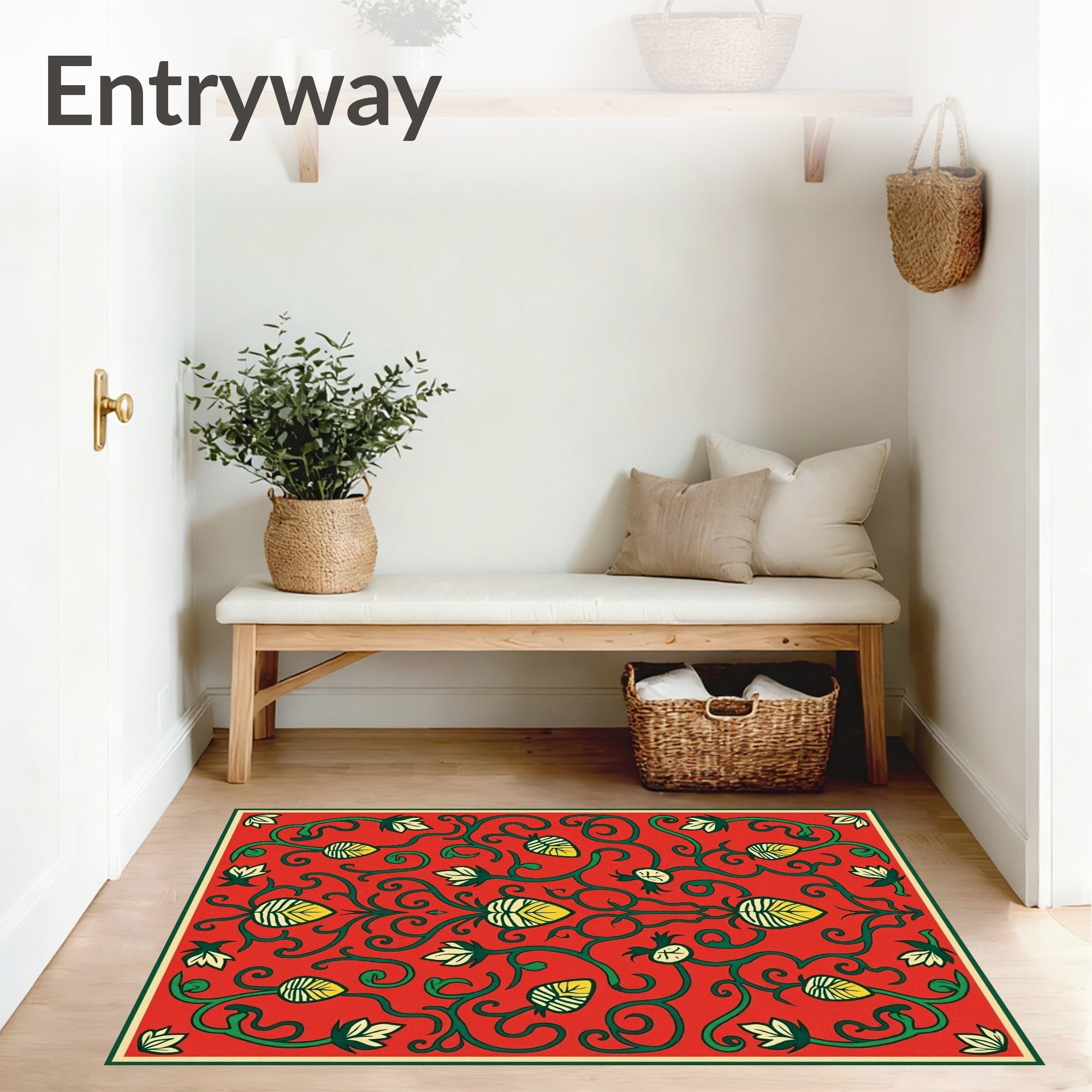 Ultra Soft Area Rug, Non Slip, Stain Resistant, Washable Area Rugs for Living Room, Bedroom, Amber Folk Art Oak Grove with Flowing Botanical Scrollwork(Red) Overview: