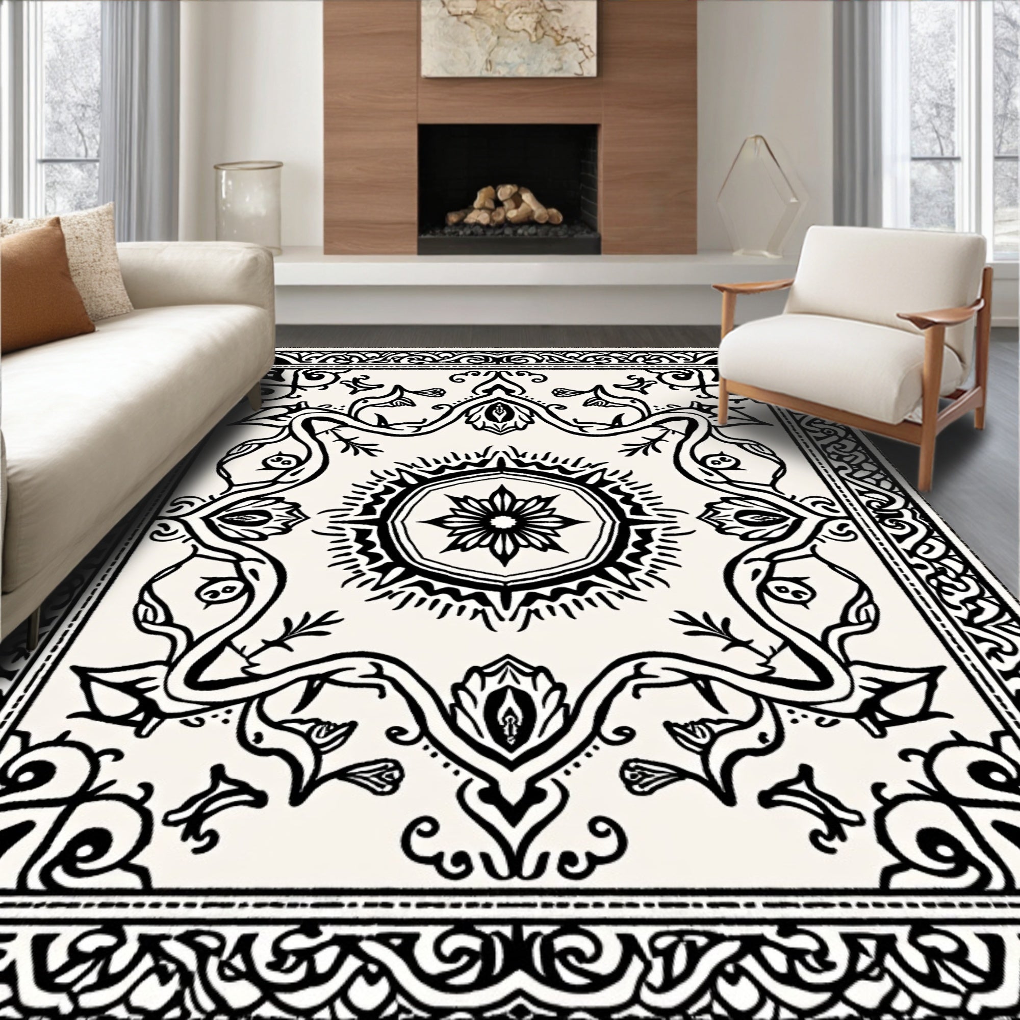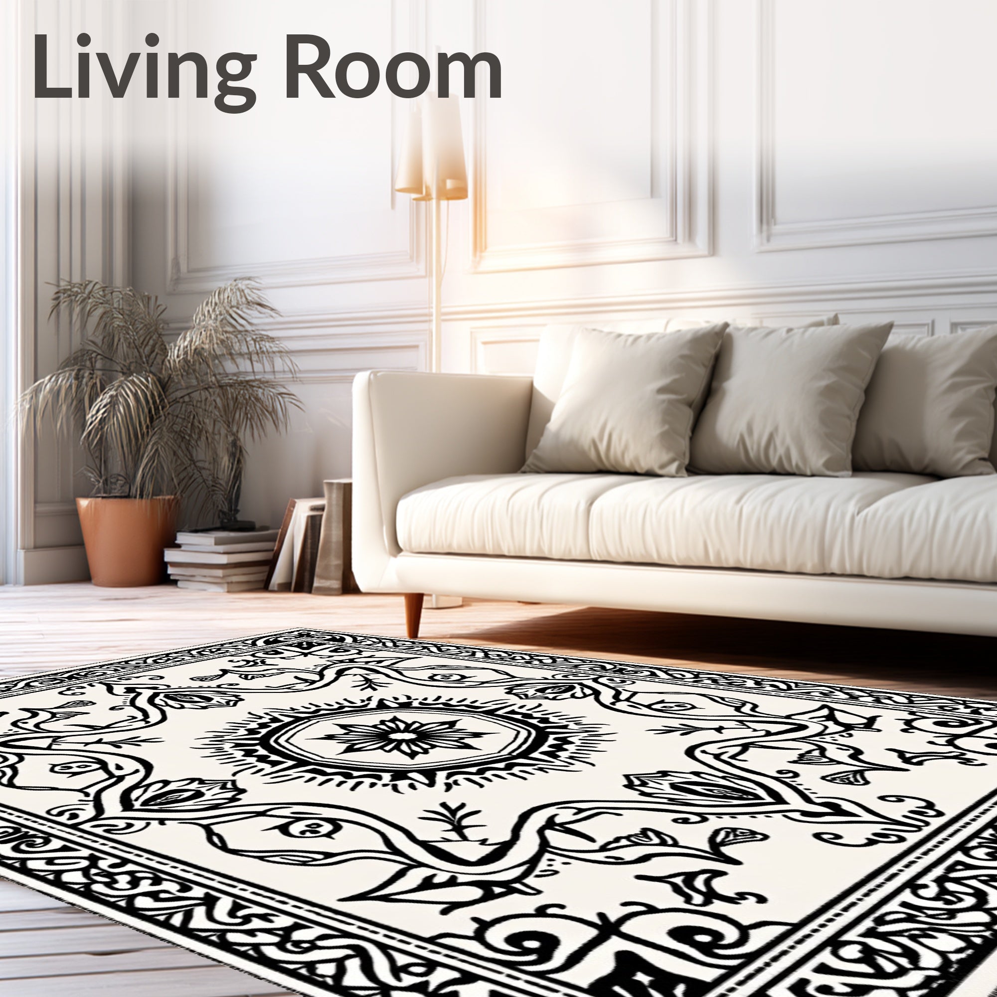 Ultra Soft Area Rug, Non Slip, Stain Resistant, Washable Area Rugs for Living Room, Bedroom, Andalusian Trellis Medallion with Distressed Boho Accents(Black) Overview:
