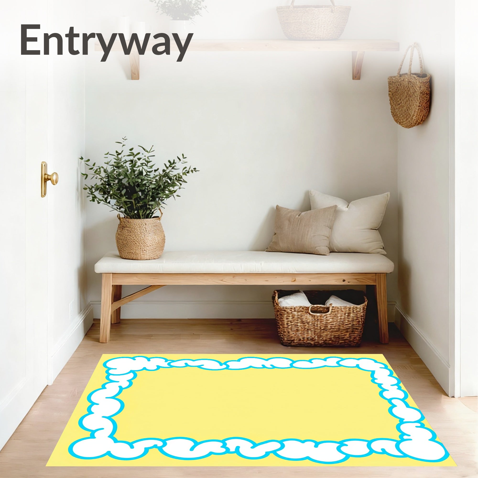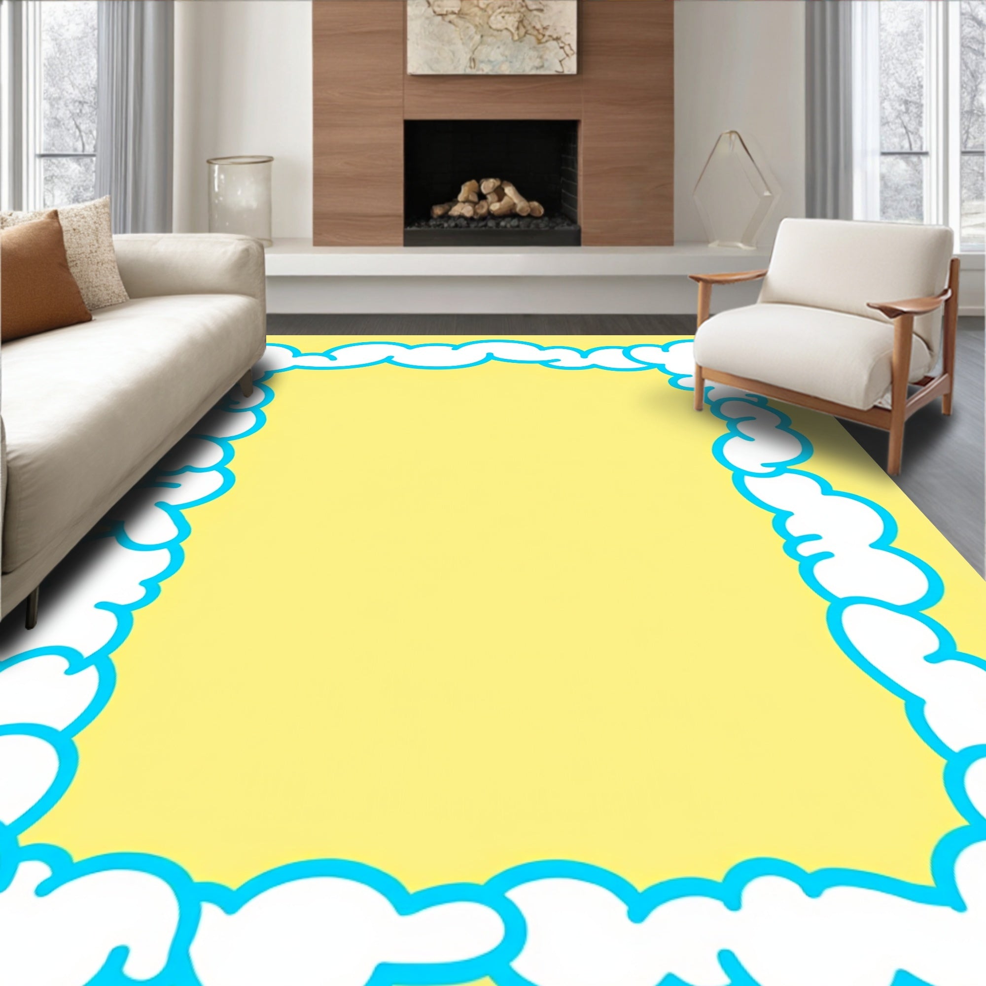Ultra Soft Area Rug, Non Slip, Stain Resistant, Washable Area Rugs for Living Room, Bedroom, Animated Pup Adventure Scene Surrounded by Puffy Cloud Borders(Yellow) Overview: