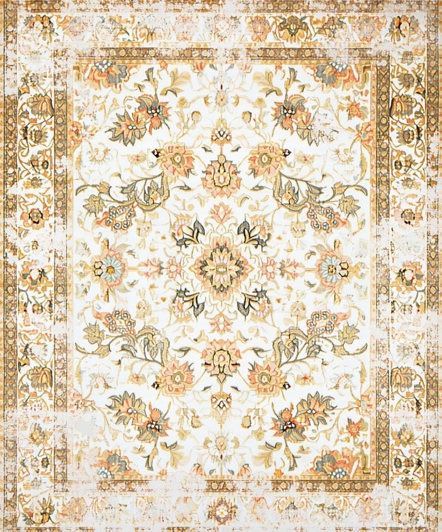 Ultra Soft Area Rug, Non Slip, Stain Resistant, Washable Area Rugs for Living Room, Bedroom, Antique Charm Area Distressed Beige Tones with Medallion Accents(Ivory) Overview: