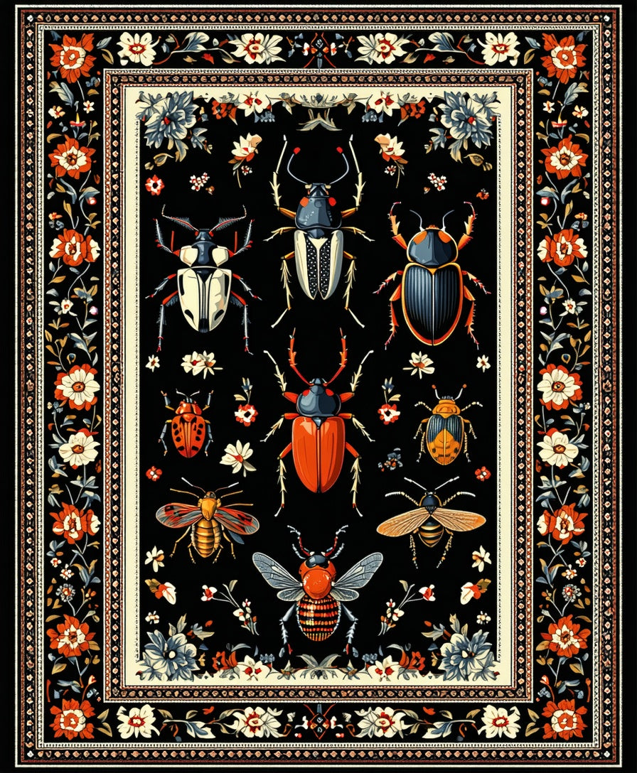 Antique Inspired Beetle and Bug with Interlaced Floral Elements(Black)