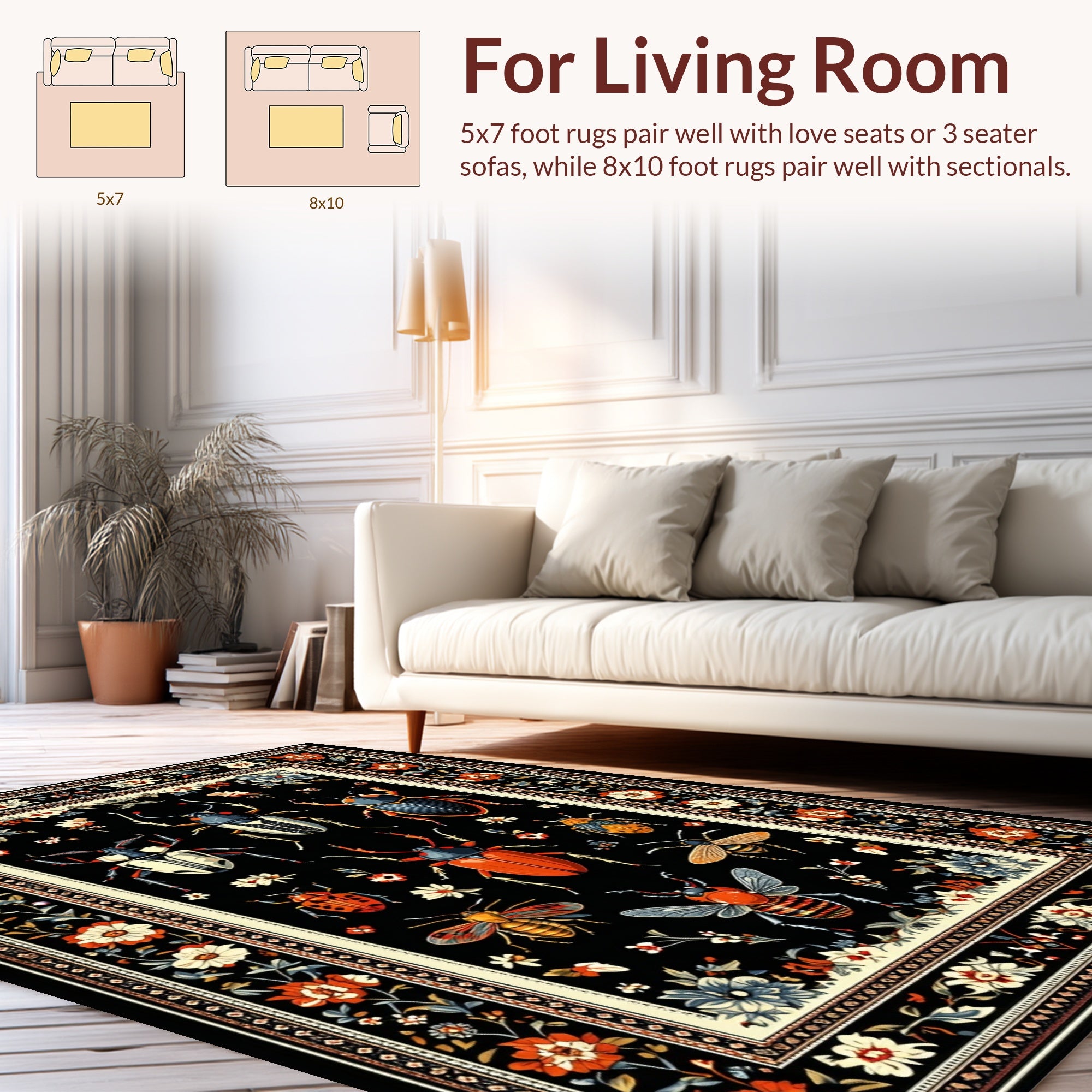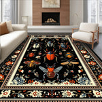 Flatwoven High Traffic Area Rug, Antique Inspired Beetle and Bug with Interlaced Floral Elements, Non Slip, Stain Resistant, Washable Area Rugs for Living Room, Bedroom (Black) Overview:
