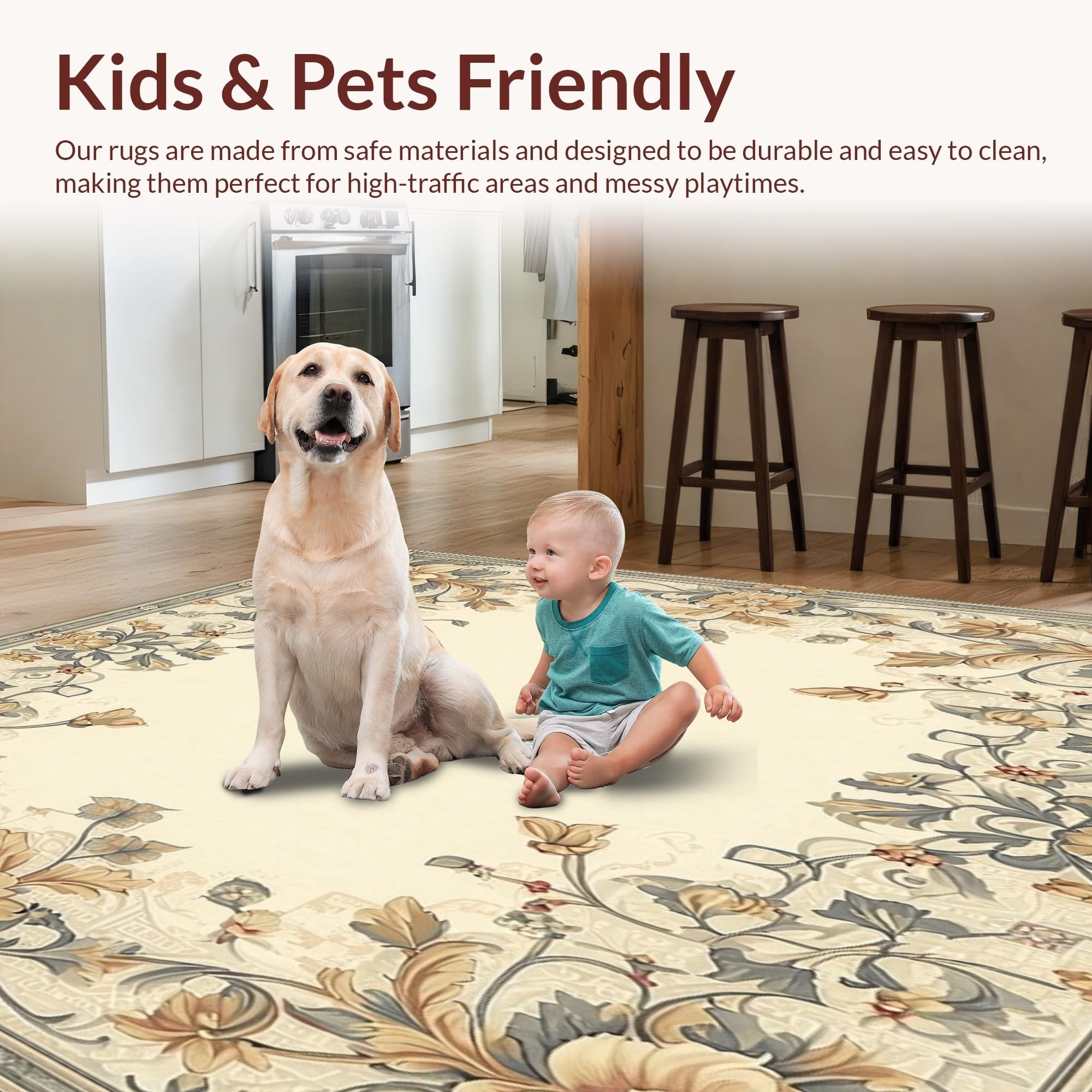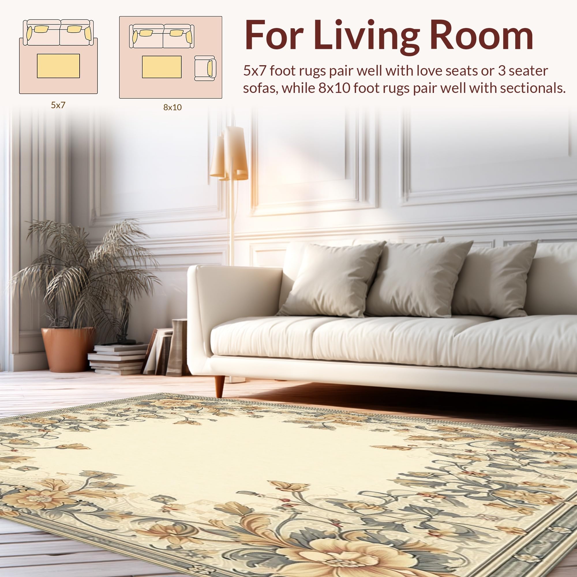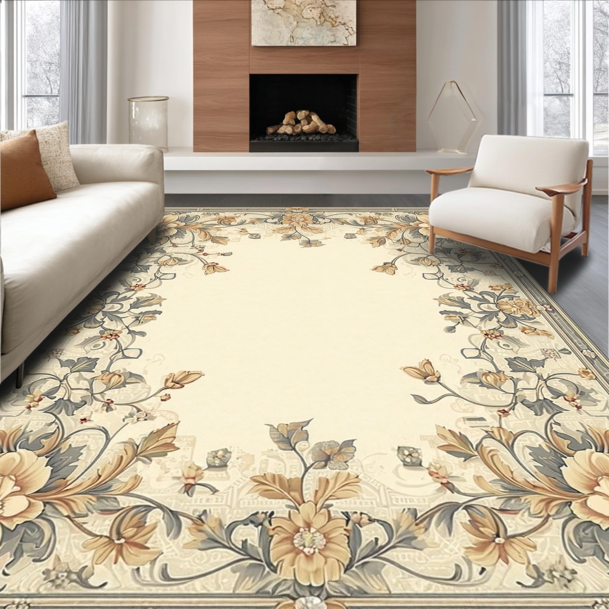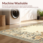 Ultra Soft Area Rug, Non Slip, Stain Resistant, Washable Area Rugs for Living Room, Bedroom, Antique Scroll Area Showcasing Floral Arabesque and Stylized Border Details(Beige) Overview: