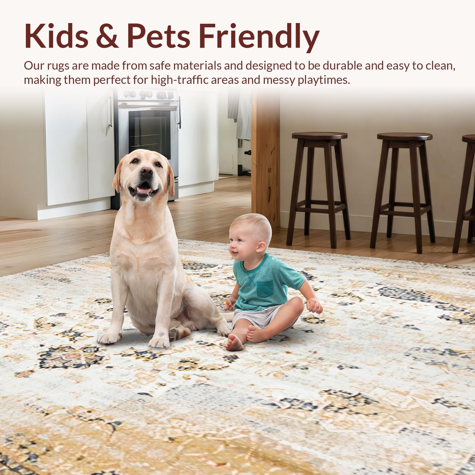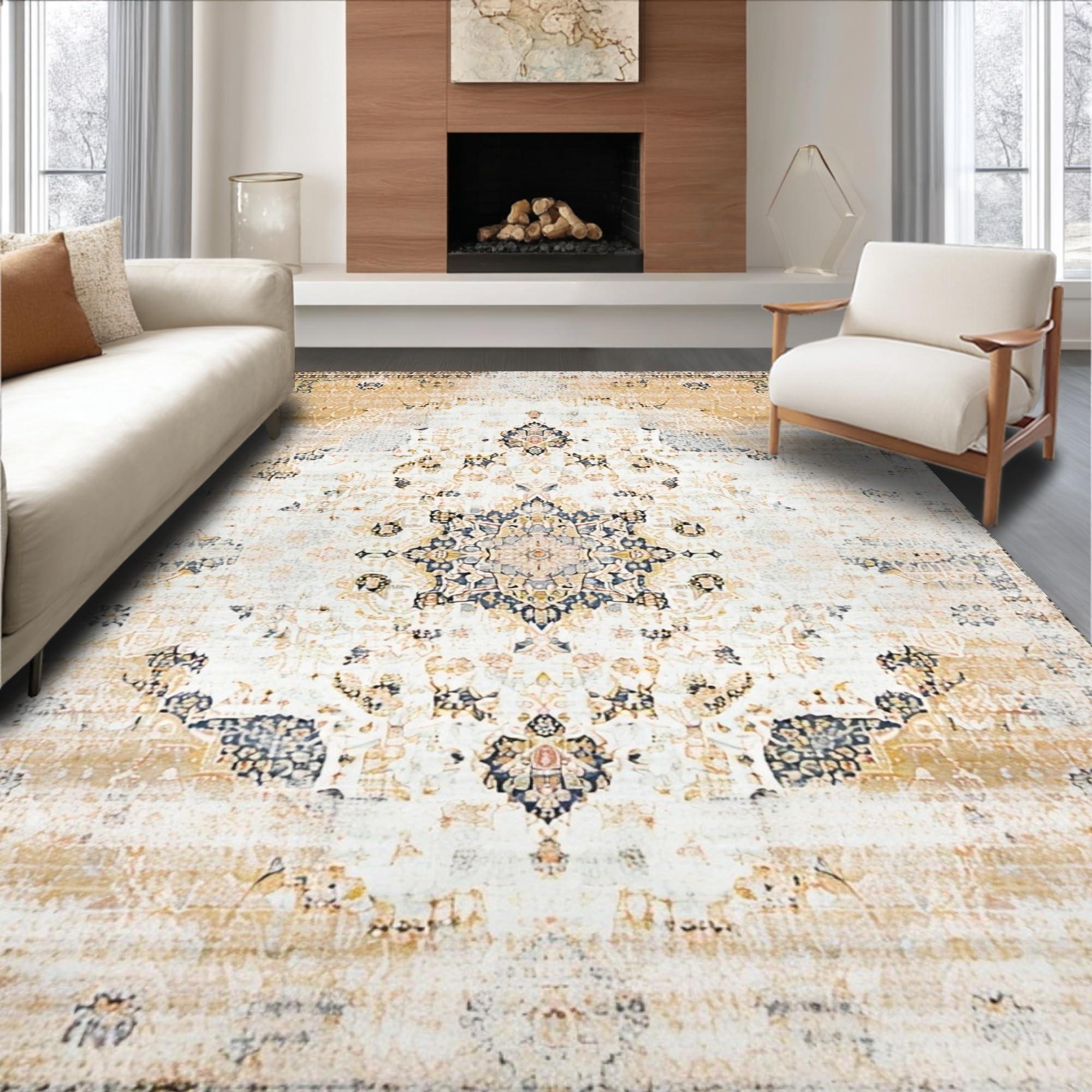 Ultra Soft Area Rug, Non Slip, Stain Resistant, Washable Area Rugs for Living Room, Bedroom, Area Featuring Vintage Medallion Design in Beige Tones(Beige) Overview: