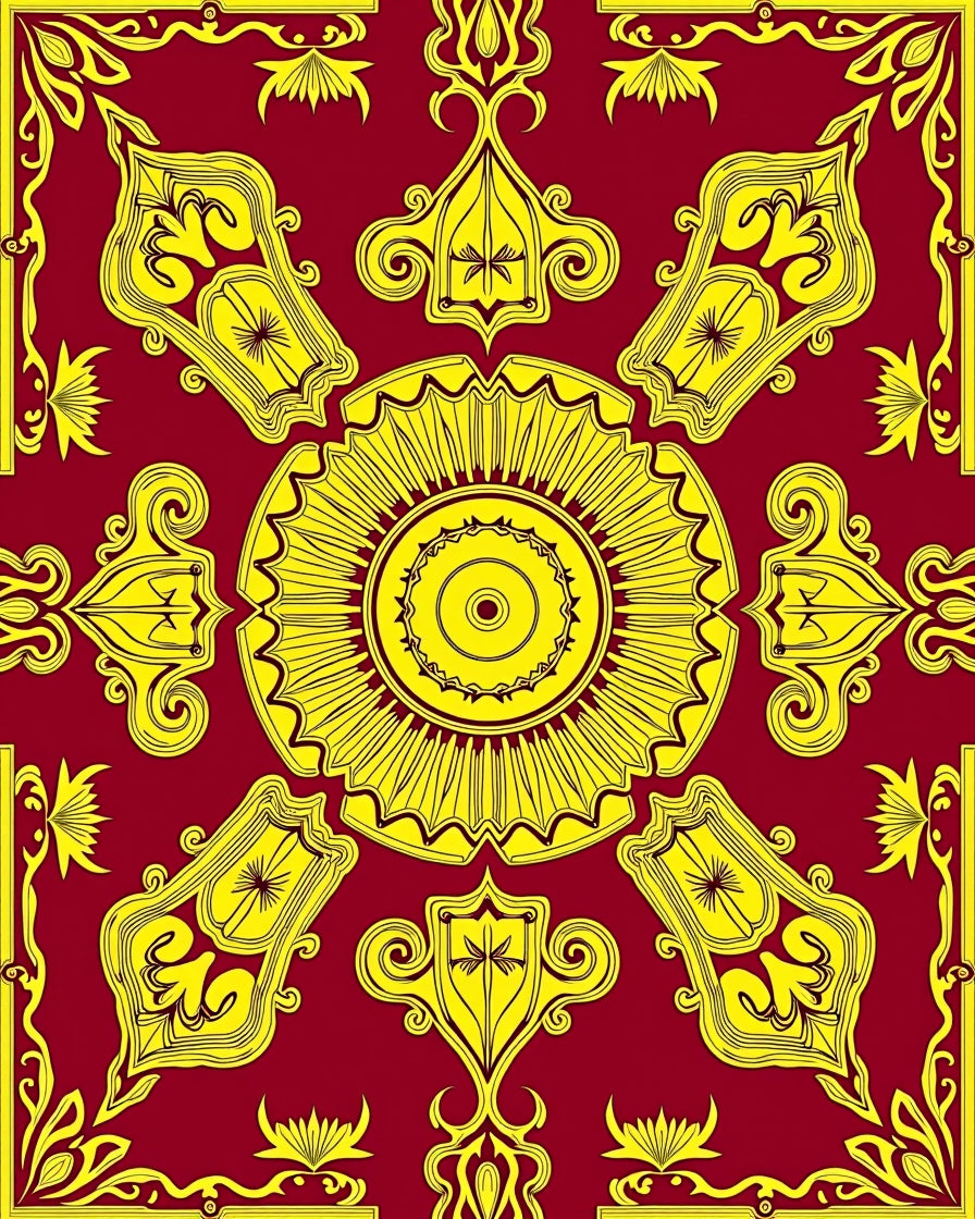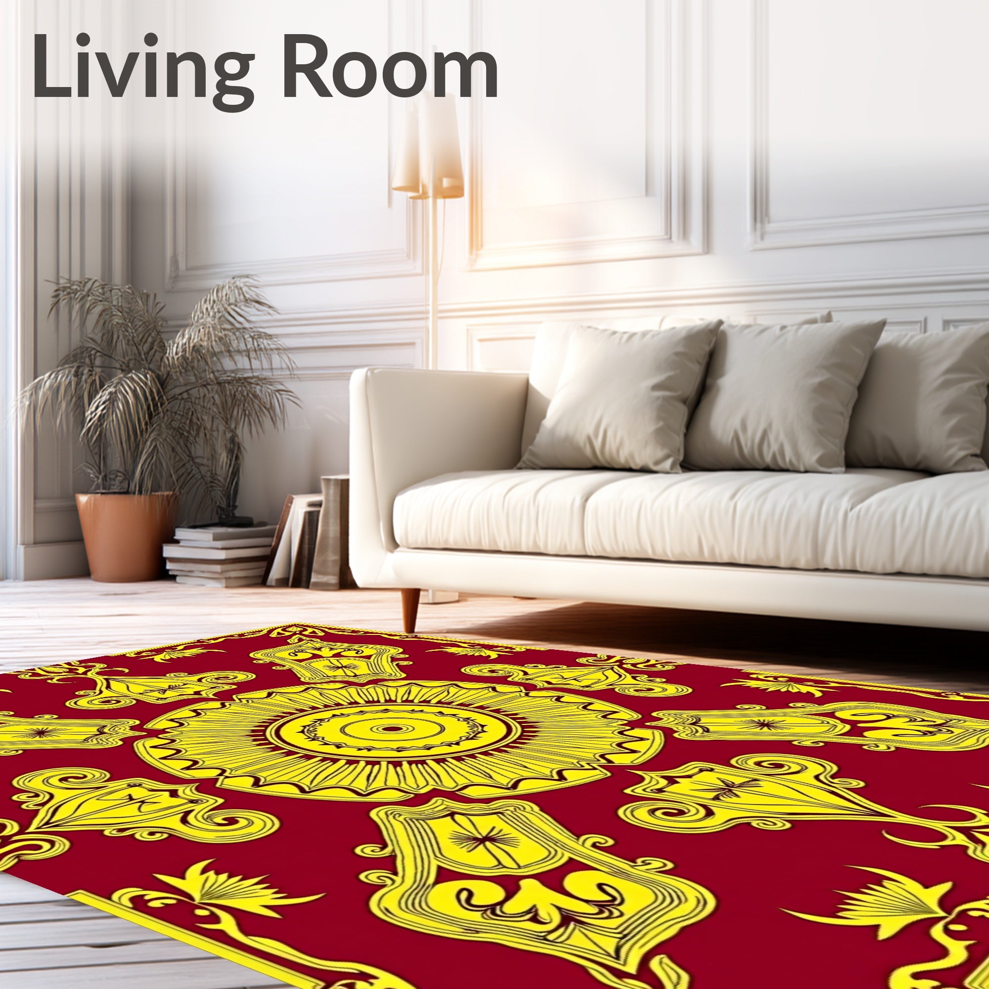 Ultra Soft Area Rug, Non Slip, Stain Resistant, Washable Area Rugs for Living Room, Bedroom, Art Starburst Array with Metallic Gold Filigree Details(Red) Overview: