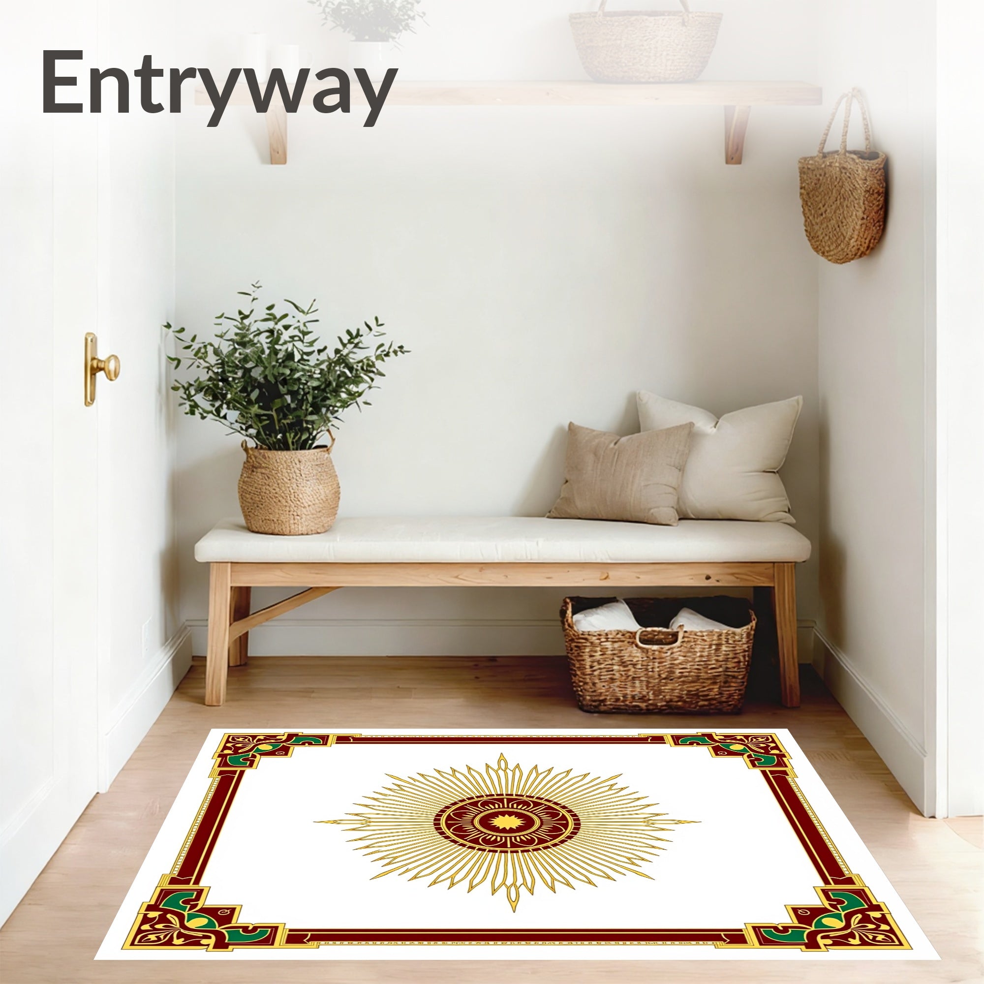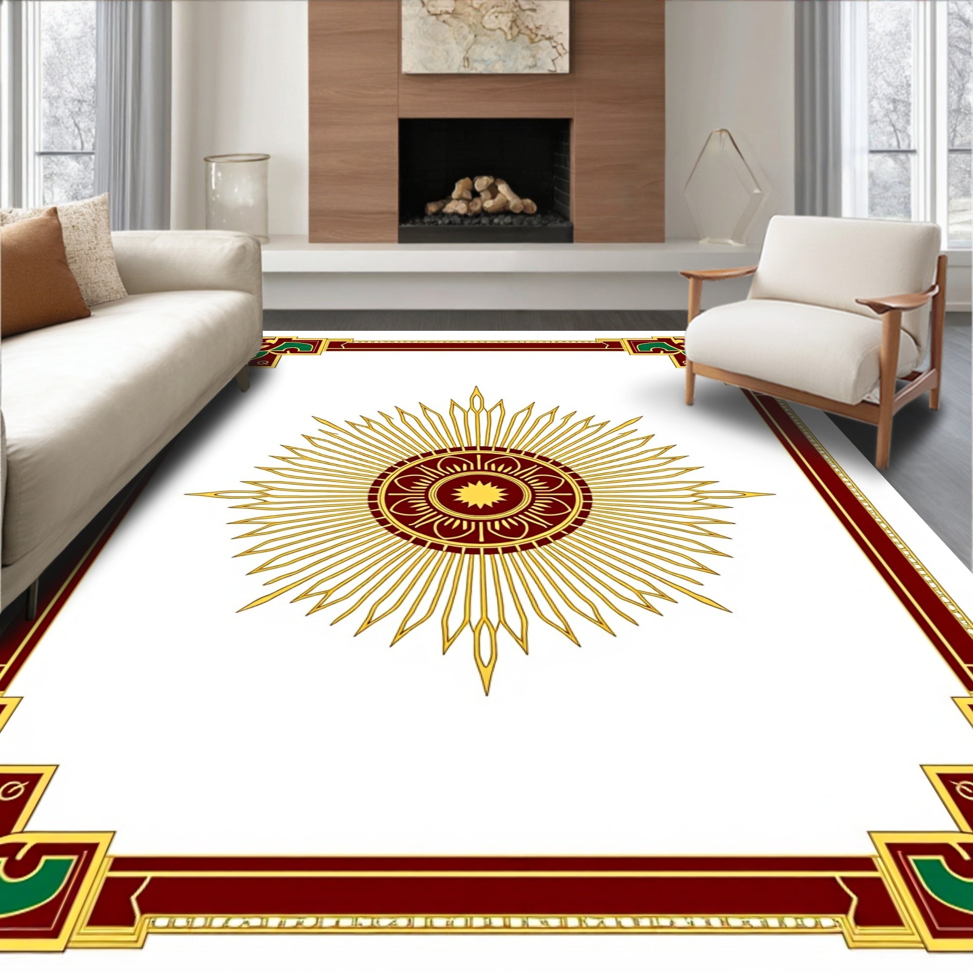 Ultra Soft Area Rug, Non Slip, Stain Resistant, Washable Area Rugs for Living Room, Bedroom, Art Sunburst with Interlocking Festive Scrolls and Abstract Festoon Detailing(Gold) Overview: