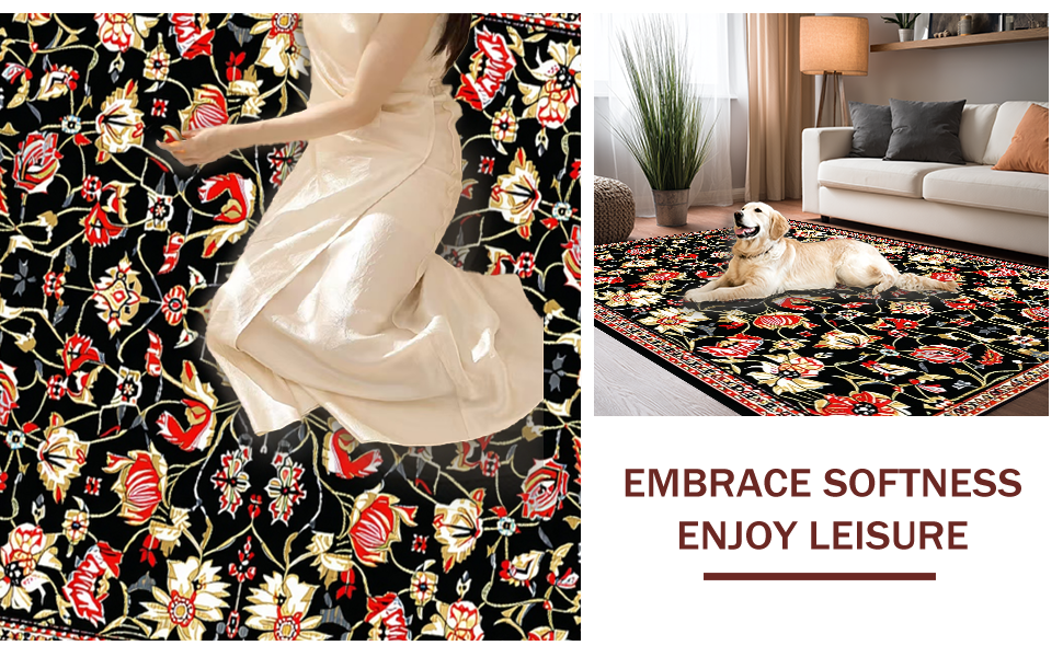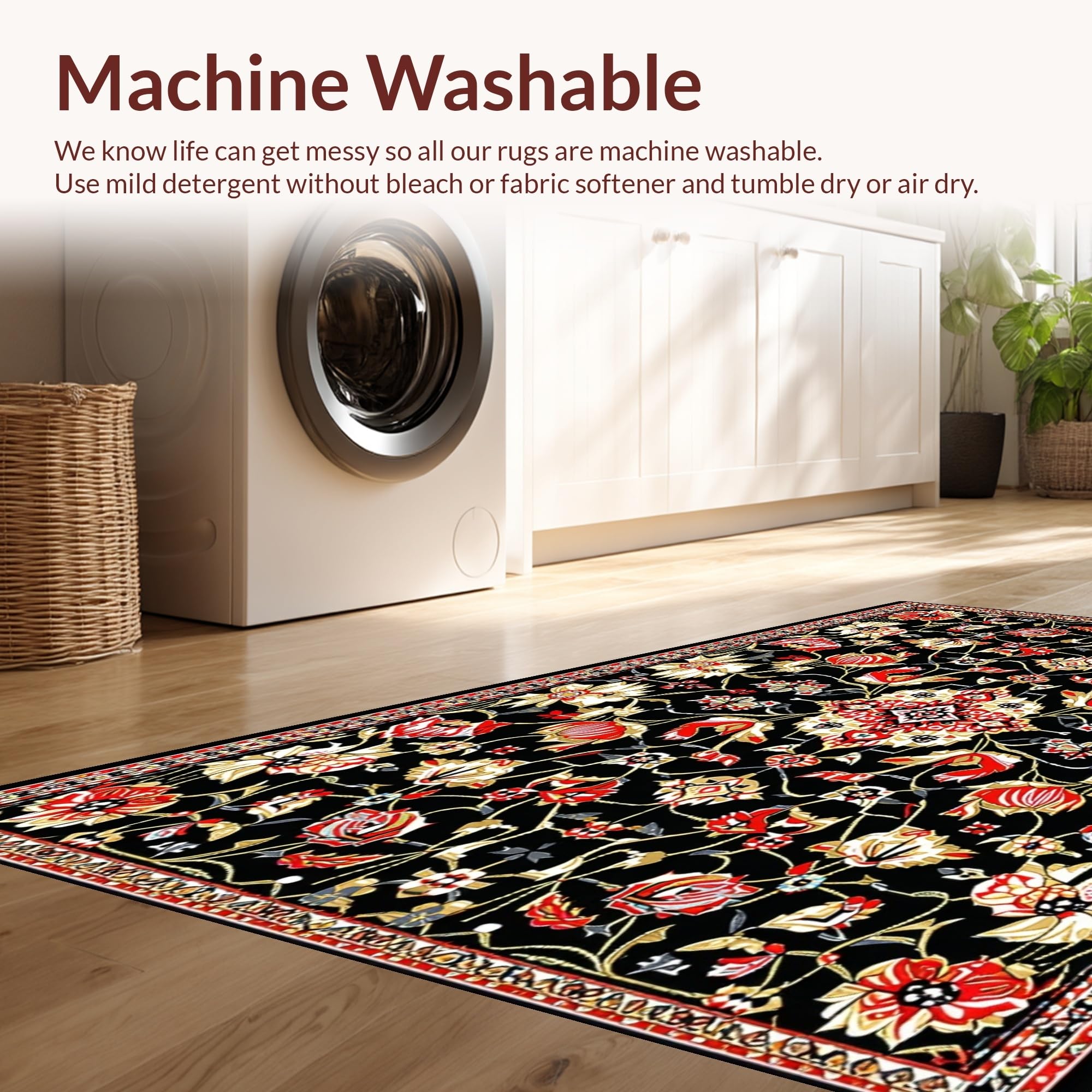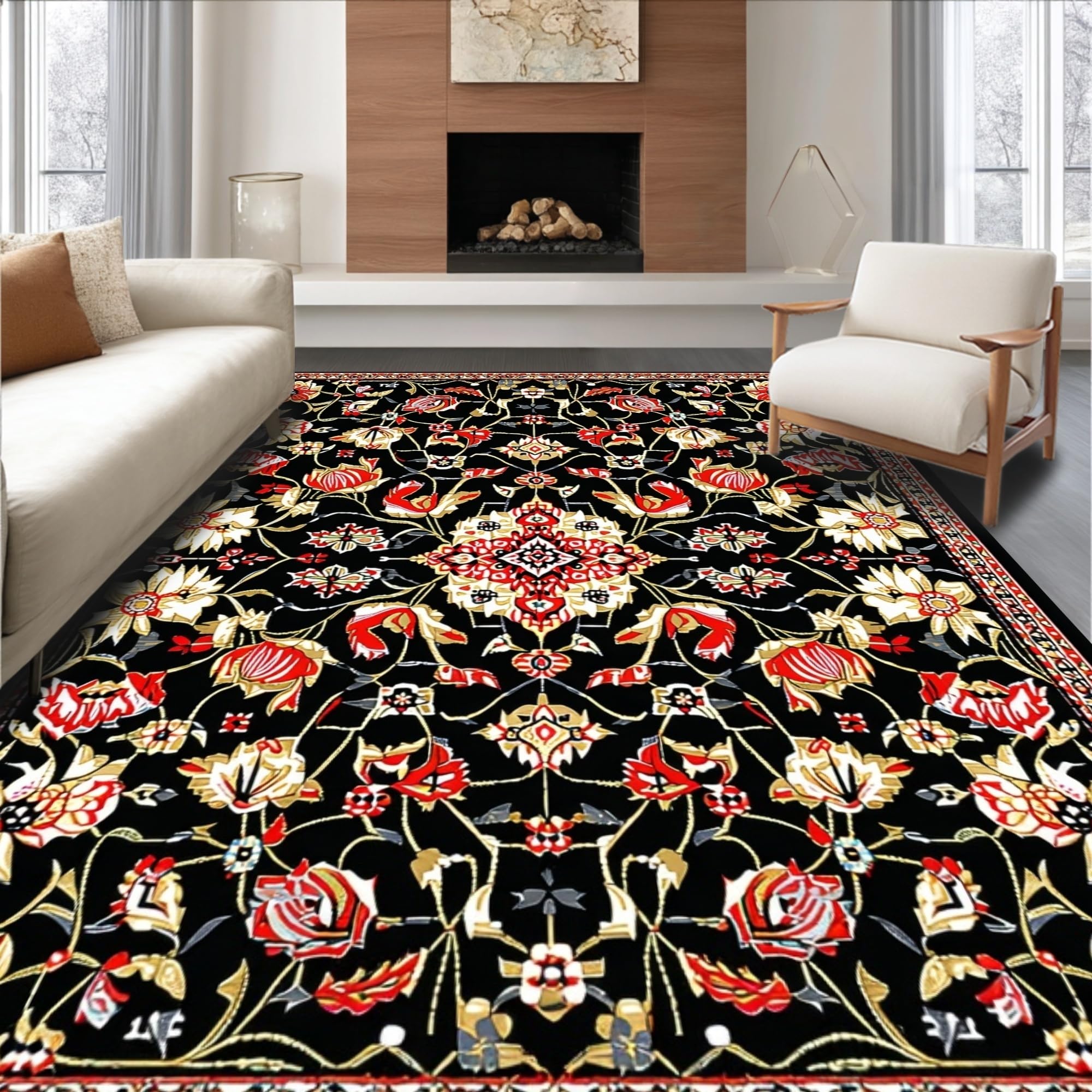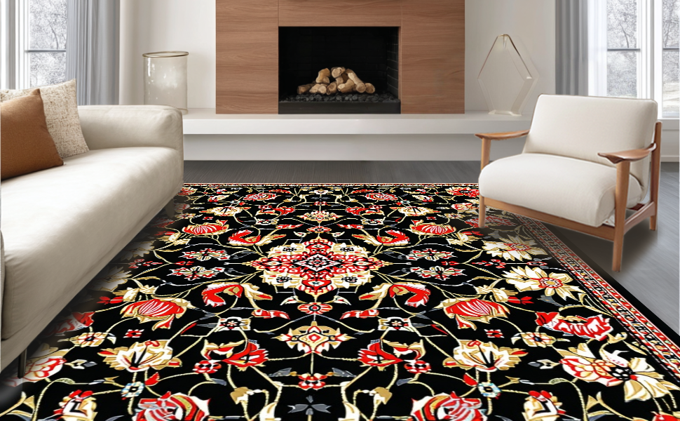 Ultra Soft Area Rug, Non Slip, Stain Resistant, Washable Area Rugs for Living Room, Bedroom, Artful Black Floral Display(Black) Overview: