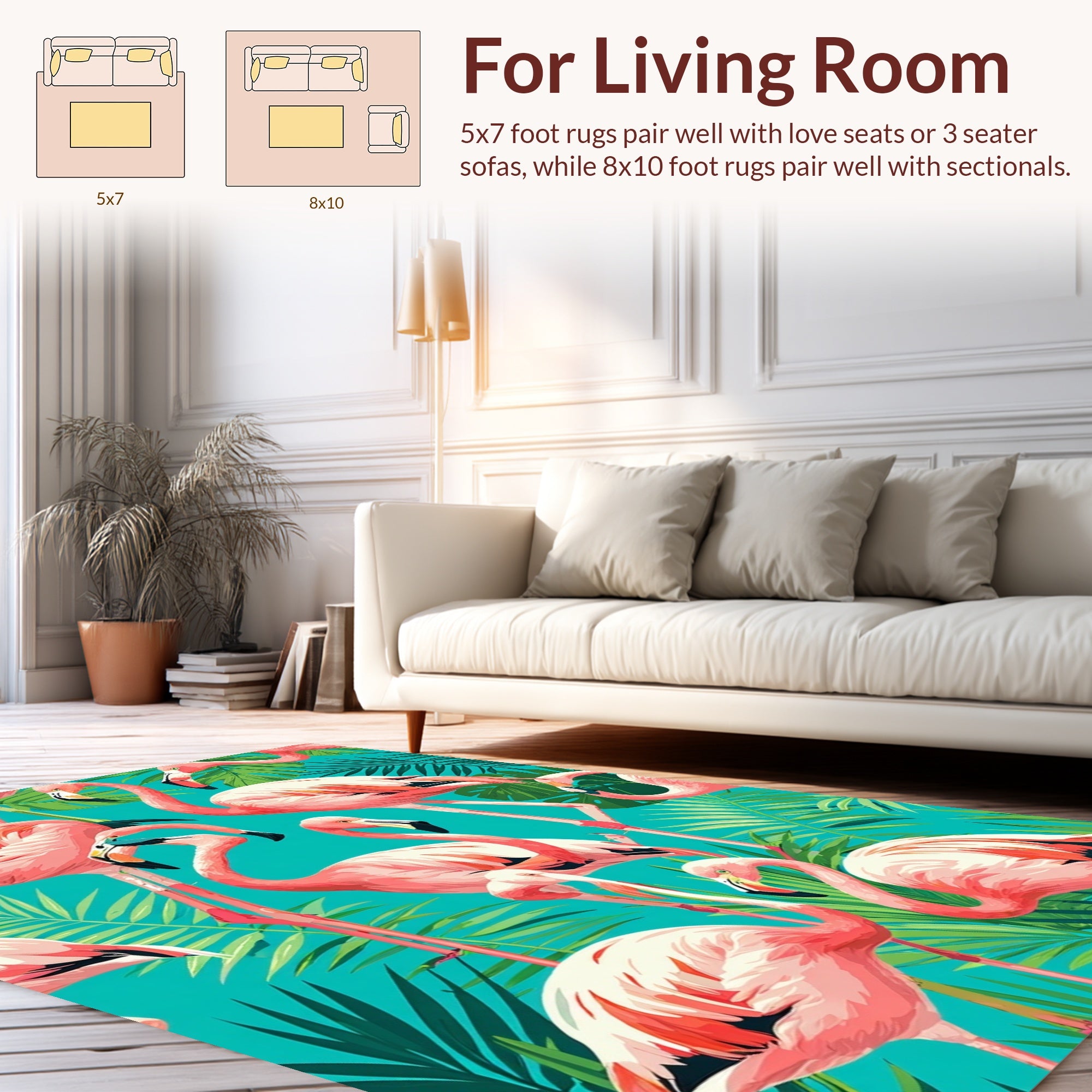 Flatwoven High Traffic Area Rug, Artful Flamingo and Palm, Non Slip, Stain Resistant, Washable Area Rugs for Living Room, Bedroom (Pink) Overview: