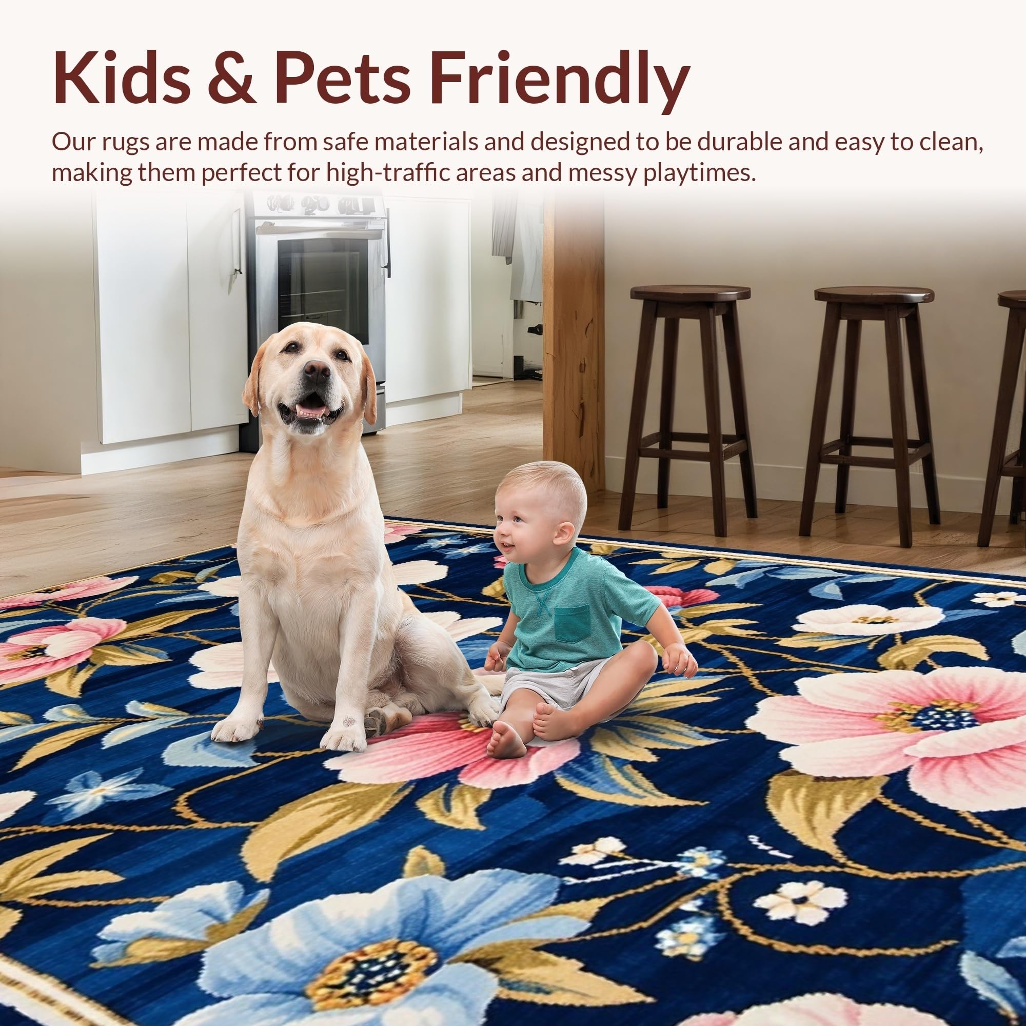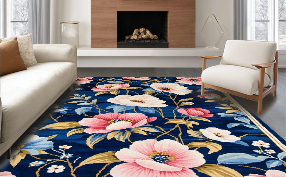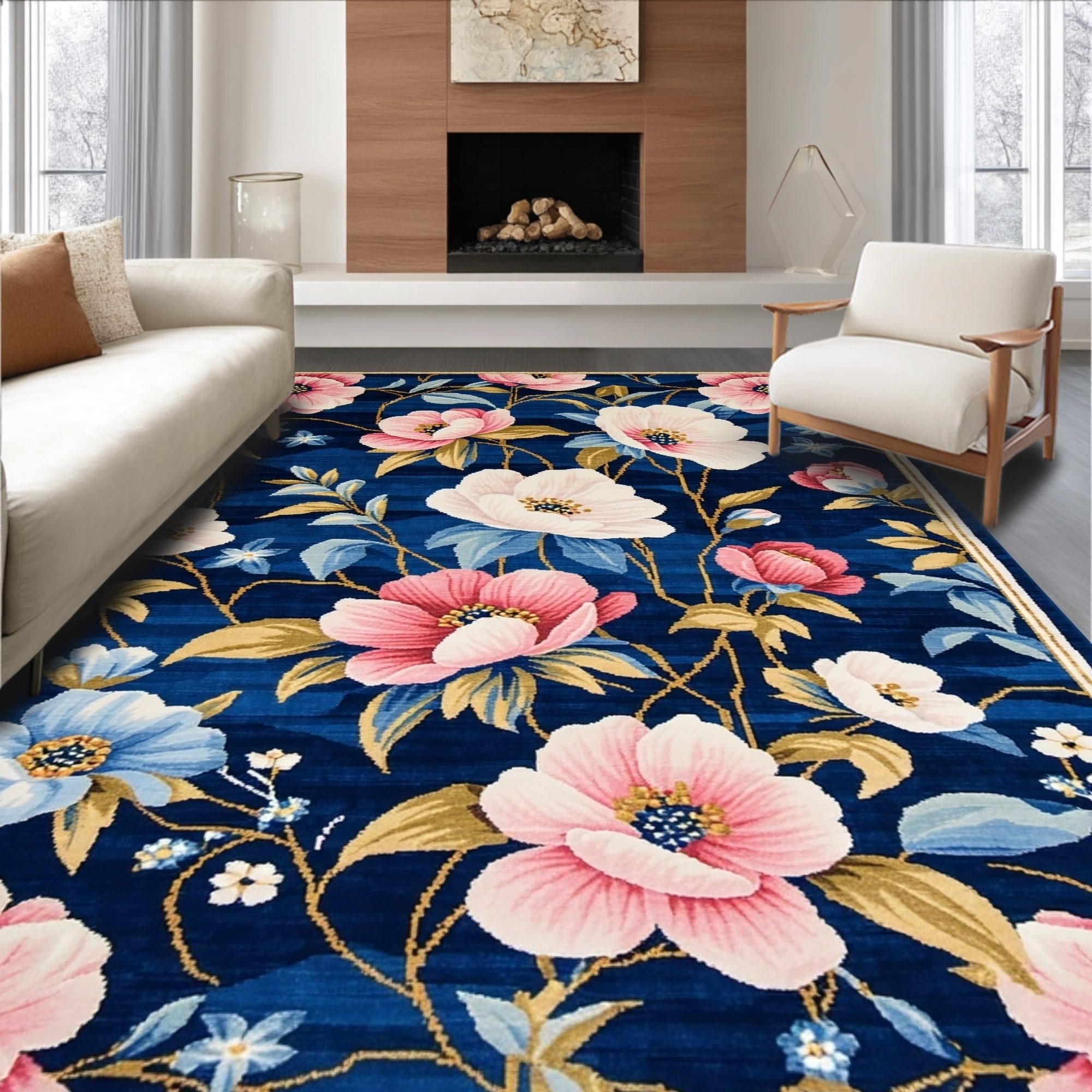 Ultra Soft Area Rug, Non Slip, Stain Resistant, Washable Area Rugs for Living Room, Bedroom, Artful Ogee Floral Aesthetic(Blue) Overview: