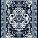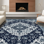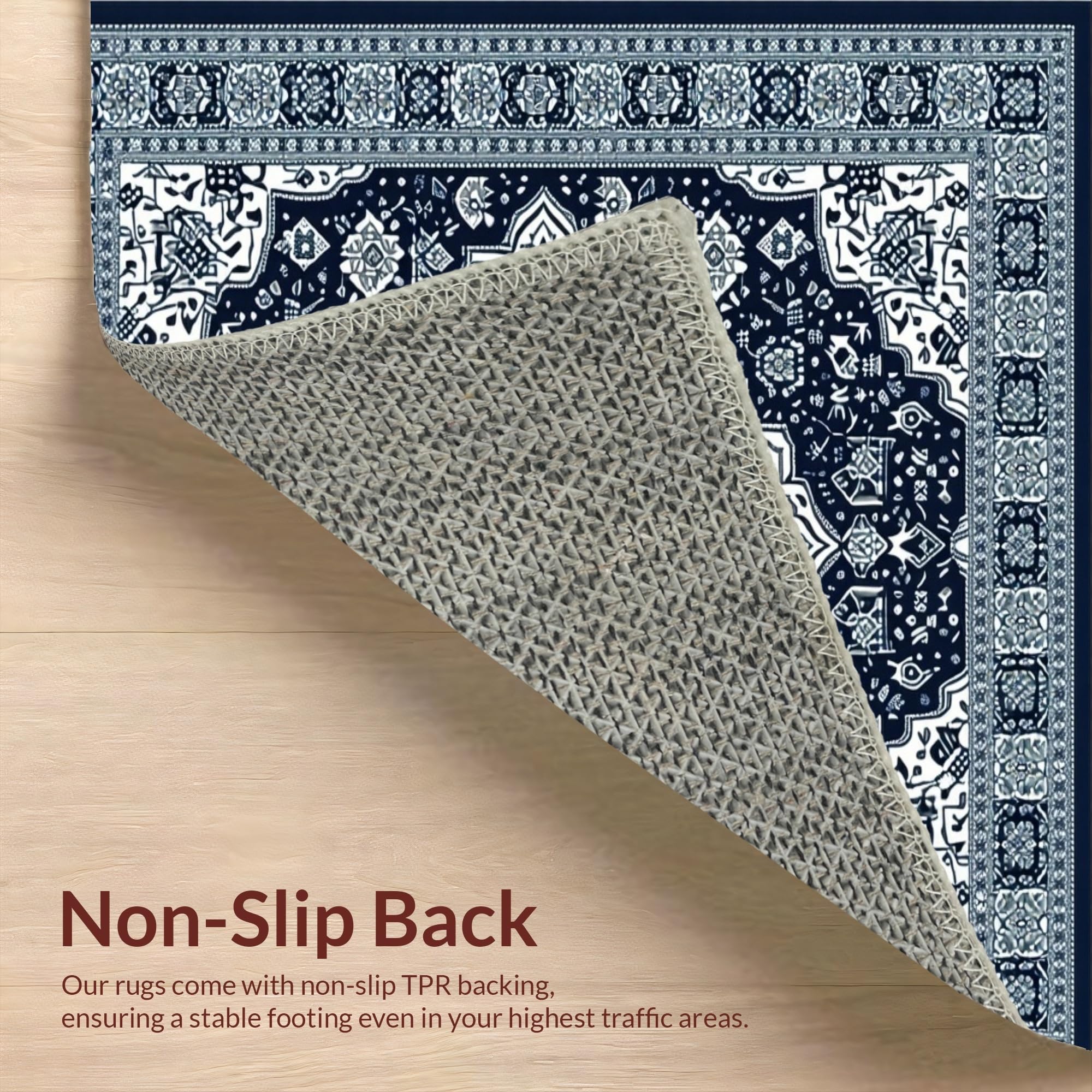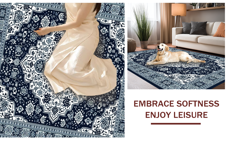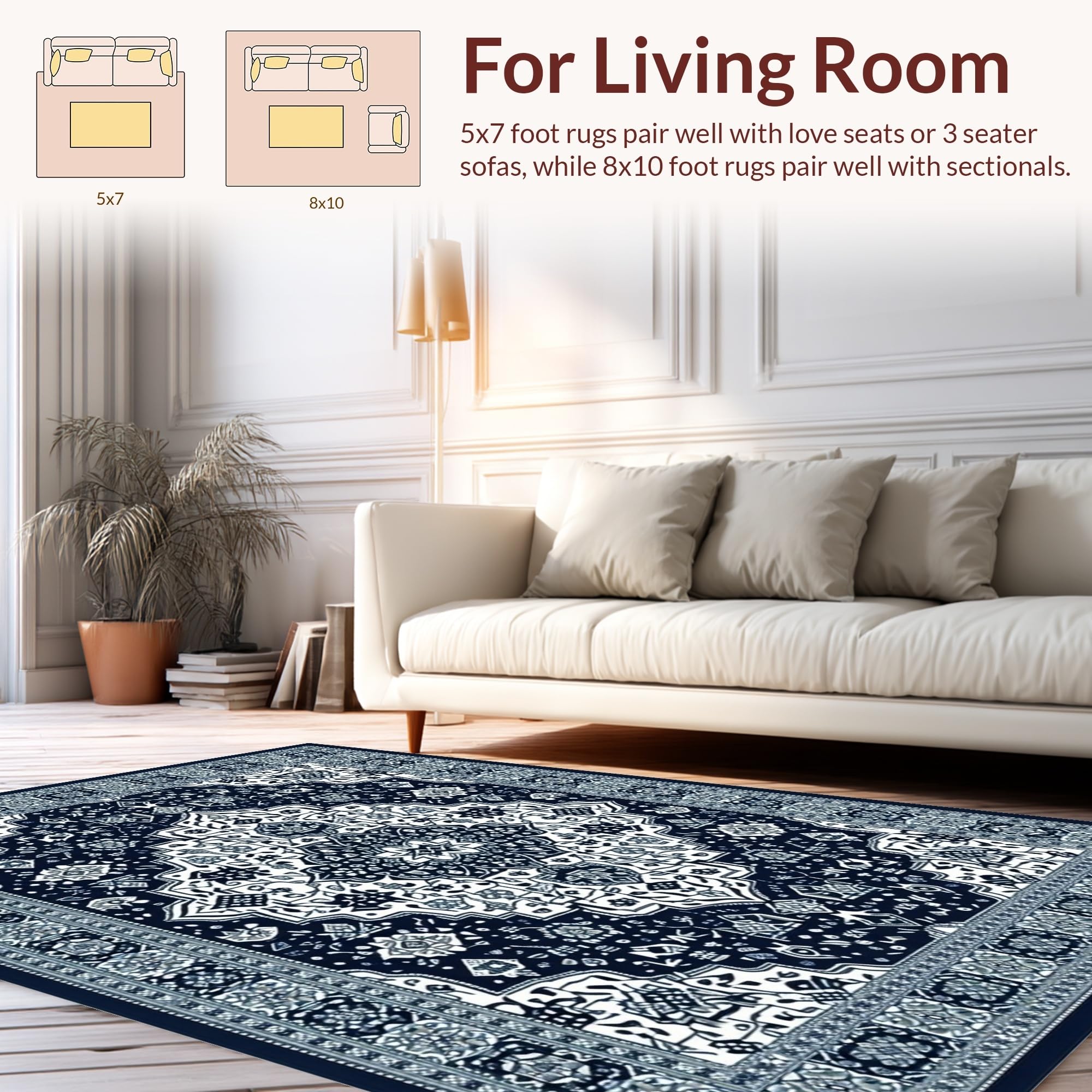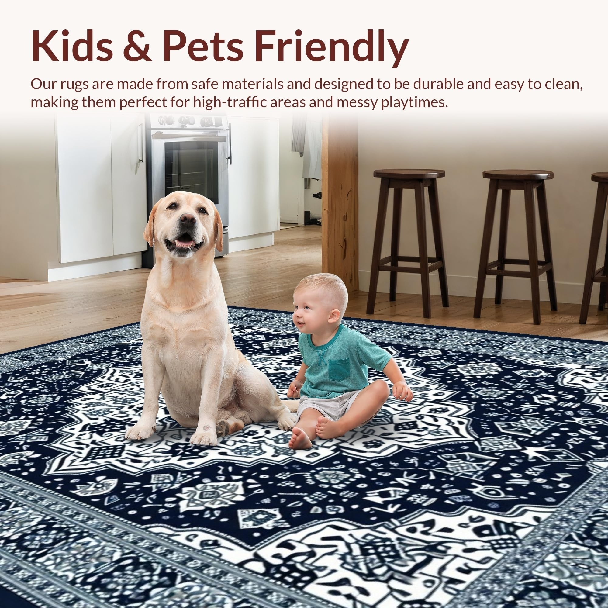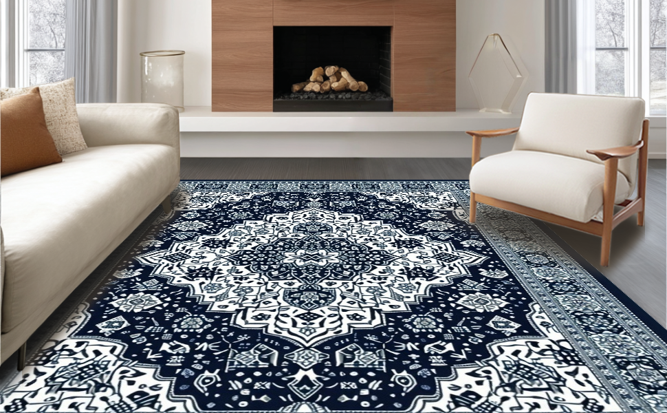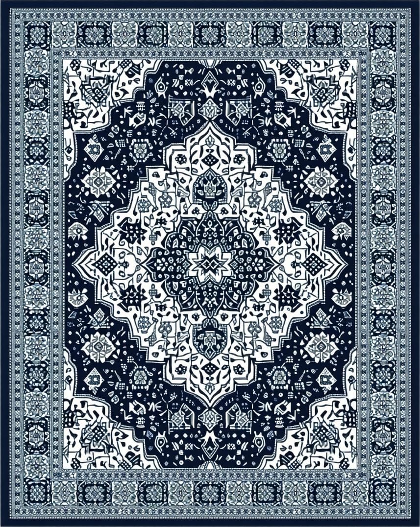 Ultra Soft Area Rug, Non Slip, Stain Resistant, Washable Area Rugs for Living Room, Bedroom, Artful Ogee Pattern with Gray Accents(Blue) Overview: