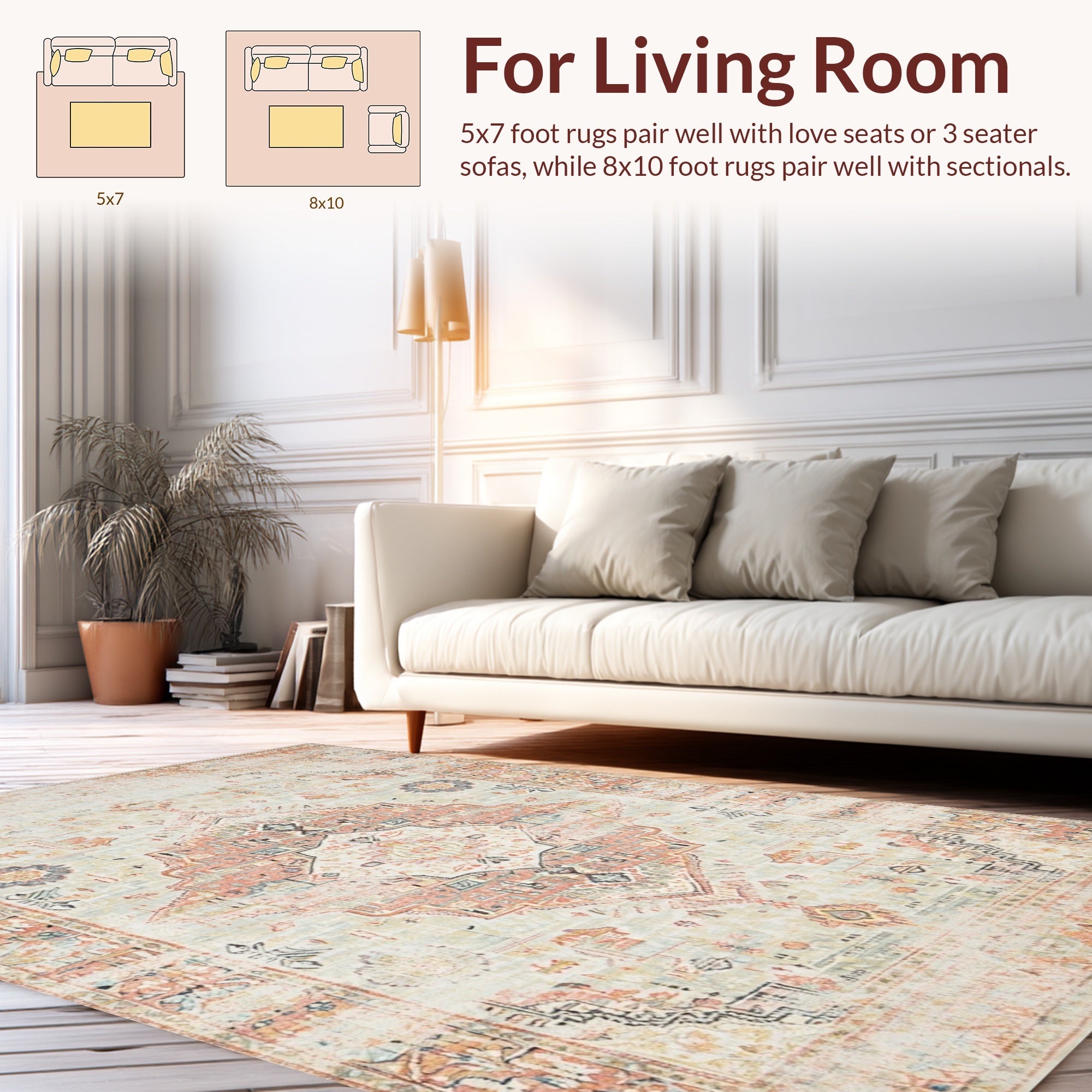 Ultra Soft Area Rug, Non Slip, Stain Resistant, Washable Area Rugs for Living Room, Bedroom, Artisan Crafted Neutral With Distressed Medallion Boho Design(Beige) Overview: