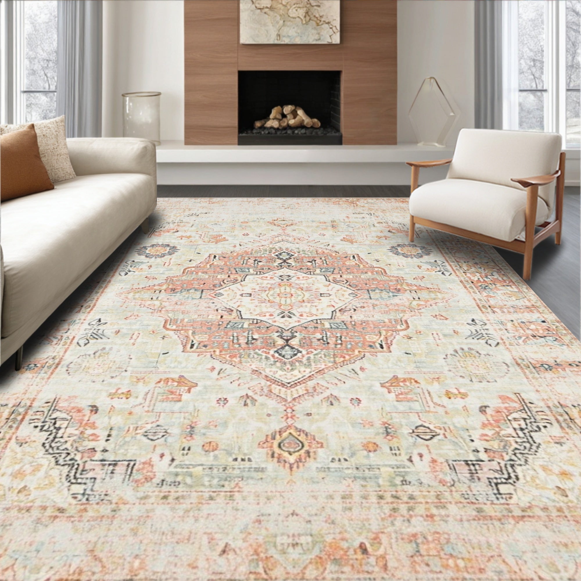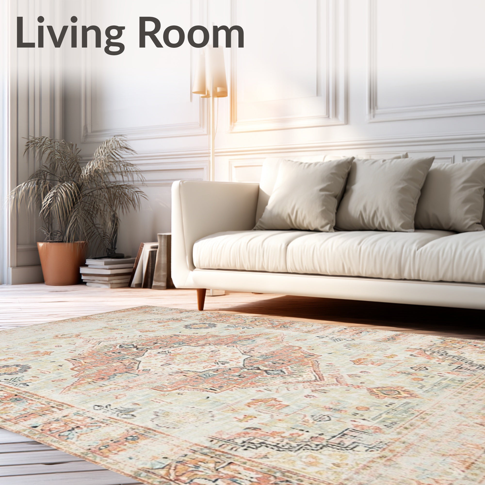 Flatwoven High Traffic Area Rug, Artisan Crafted Neutral With Distressed Medallion Boho Design, Non Slip, Stain Resistant, Washable Area Rugs for Living Room, Bedroom (Beige) Overview: