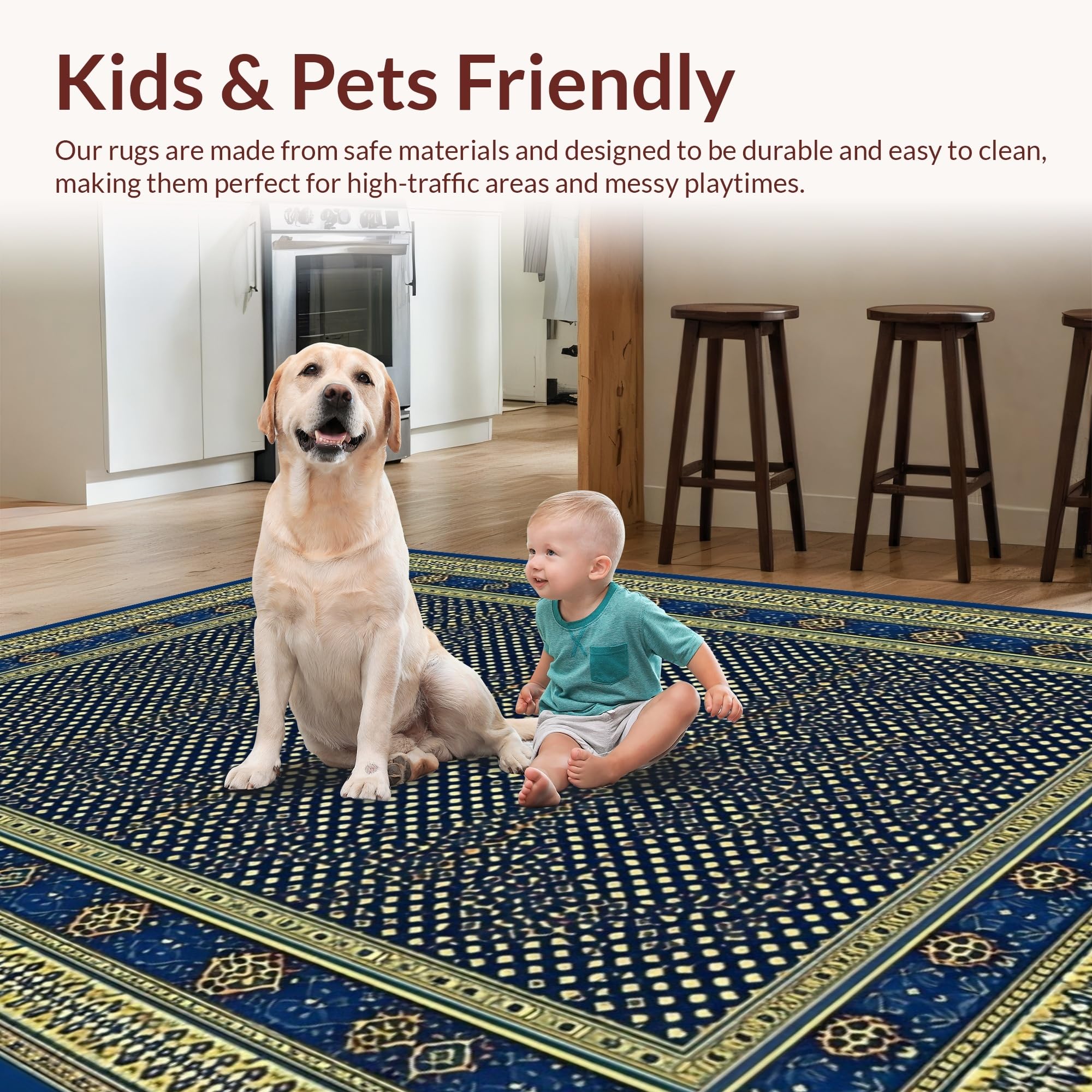 Ultra Soft Area Rug, Non Slip, Stain Resistant, Washable Area Rugs for Living Room, Bedroom, Artisan Geometric Area with Deep Blue and Gold Motifs(Blue) Overview: