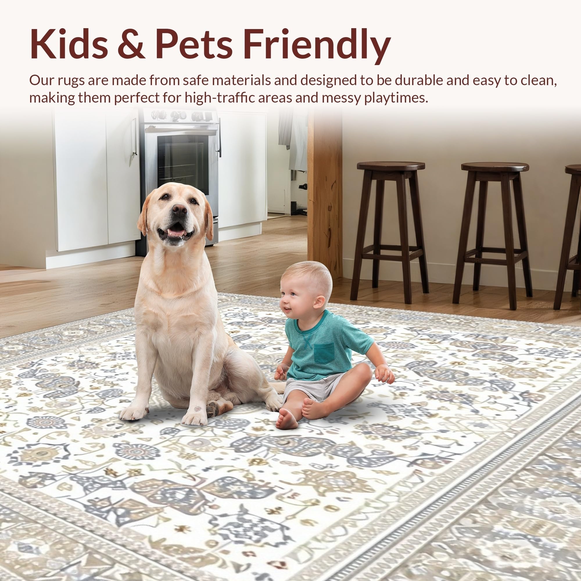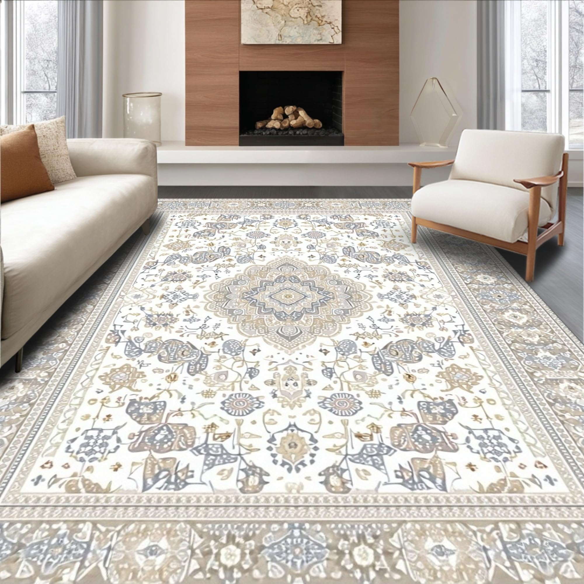 Ultra Soft Area Rug, Non Slip, Stain Resistant, Washable Area Rugs for Living Room, Bedroom, Artisan Inspired Area Rug with Boho Medallion and Soft Neutral Palette(Beige) Overview: