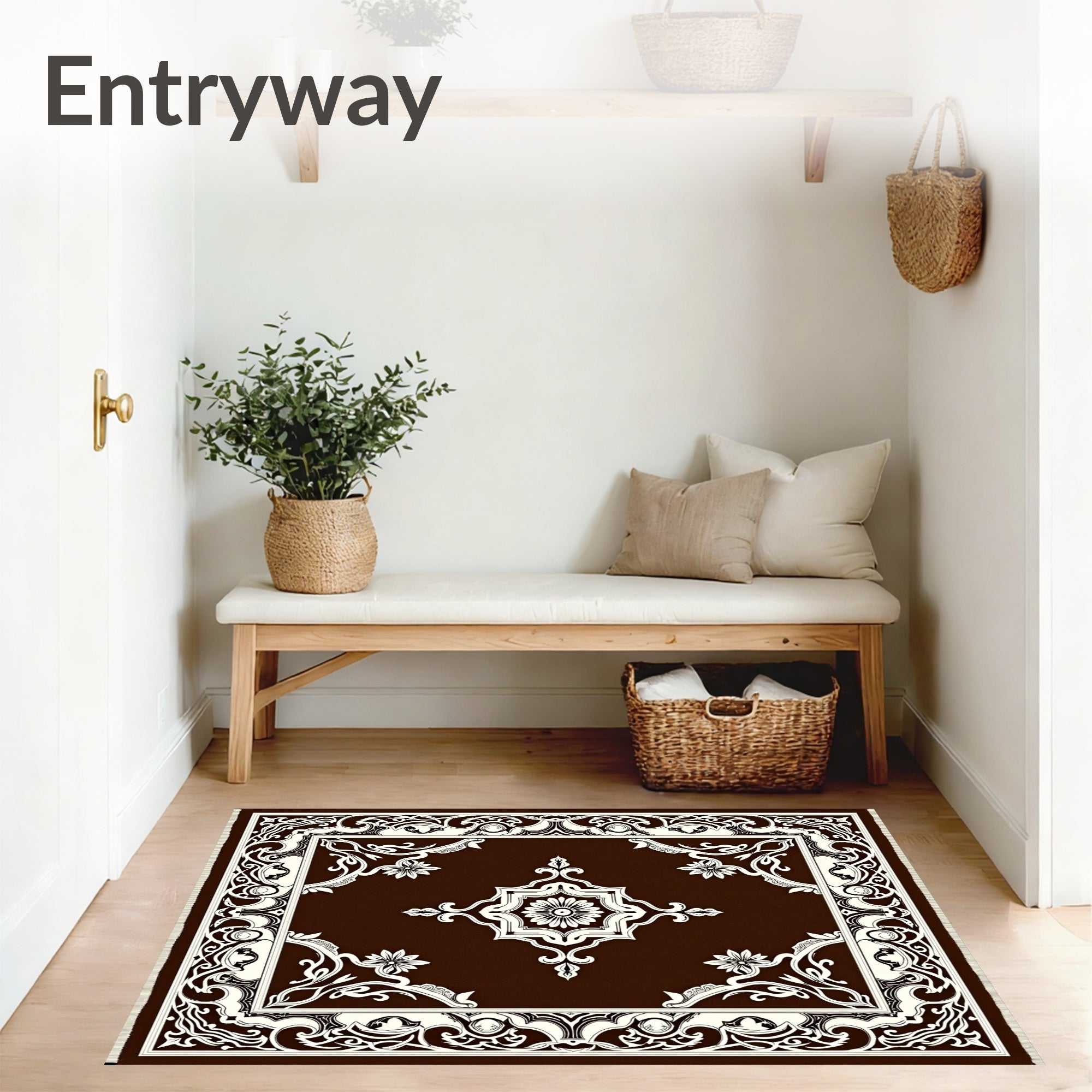 Flatwoven High Traffic Area Rug, Artisan Lattice Motif with Interlocking and Stylized Paisley Forms, Non Slip, Stain Resistant, Washable Area Rugs for Living Room, Bedroom (Brown) Overview: