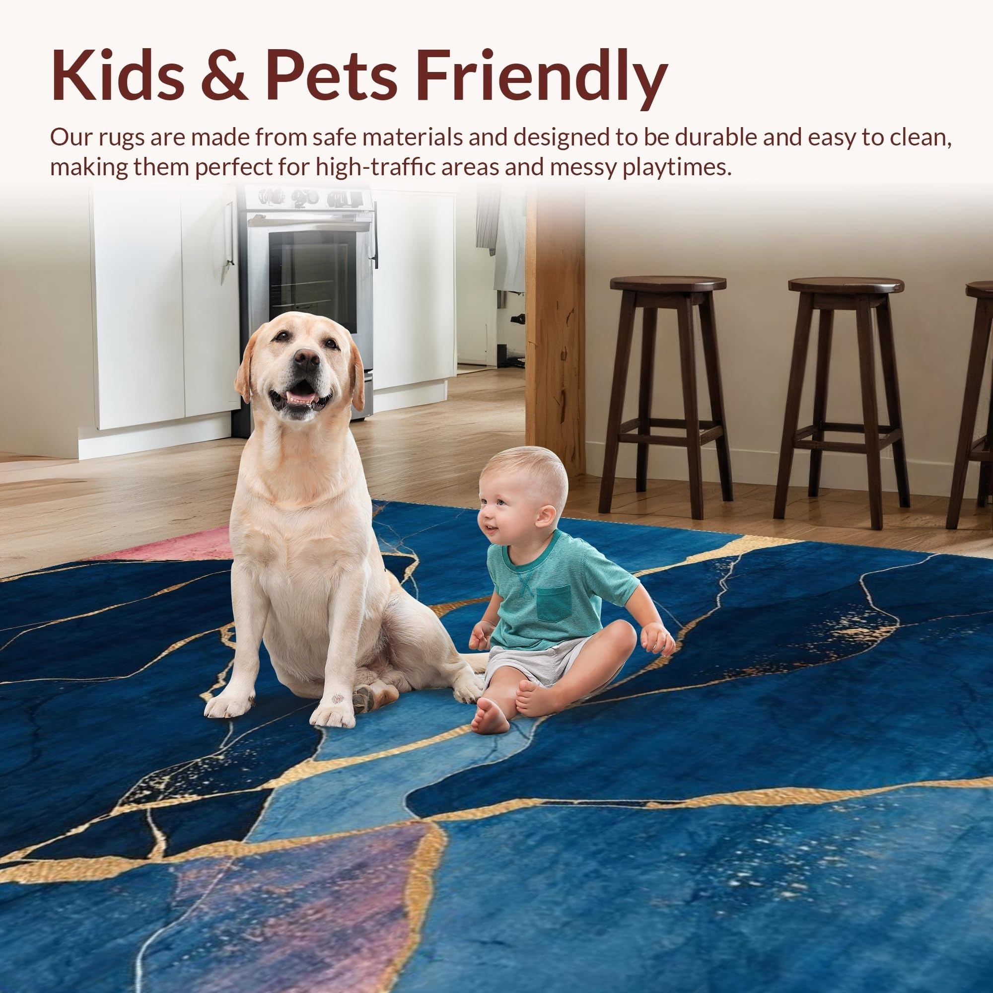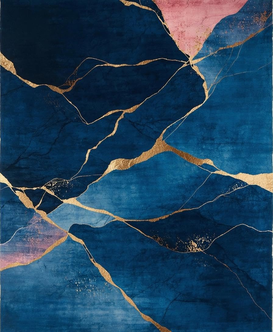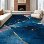 Ultra Soft Area Rug, Non Slip, Stain Resistant, Washable Area Rugs for Living Room, Bedroom, Artistic Gold Foil Geometric Print(Blue) Overview: