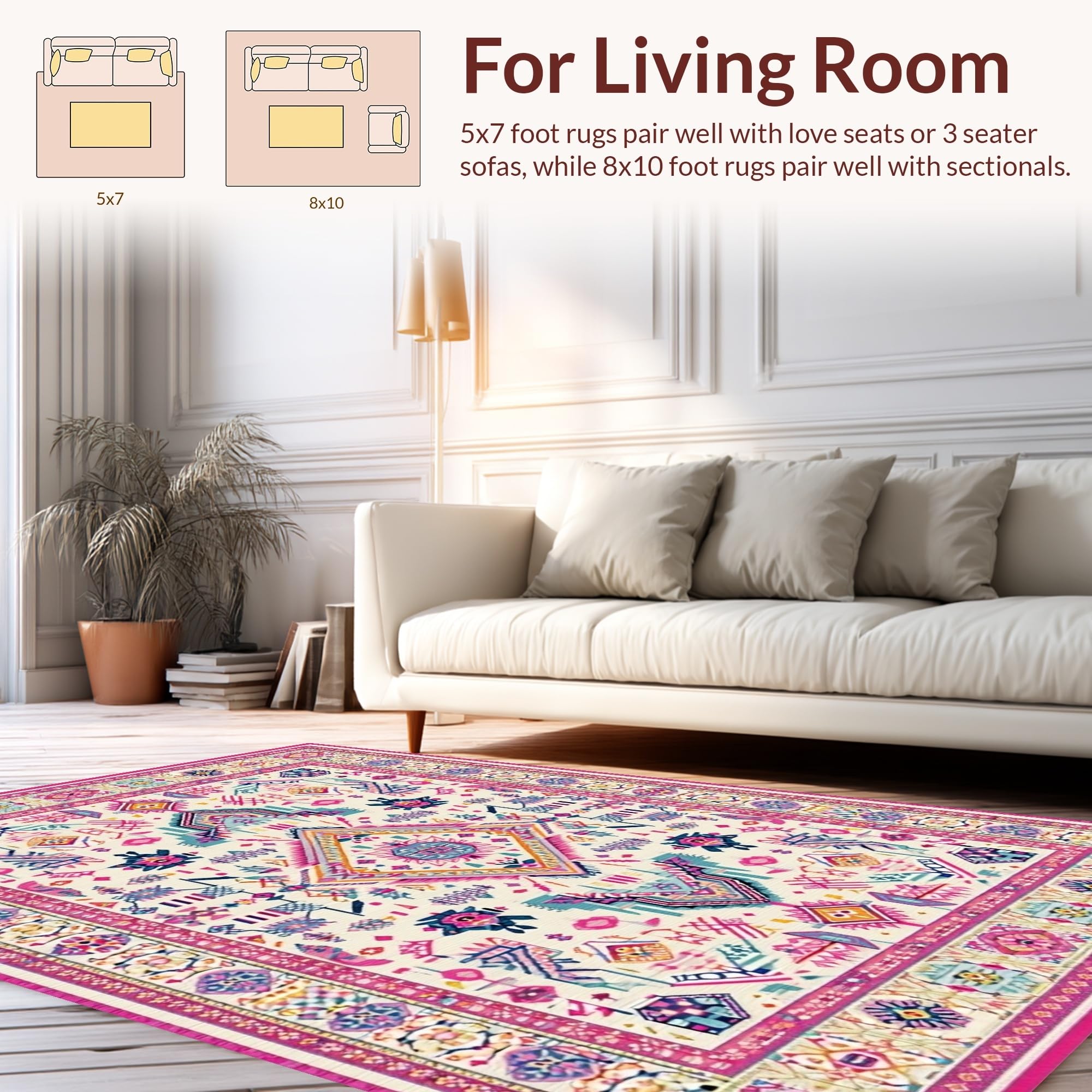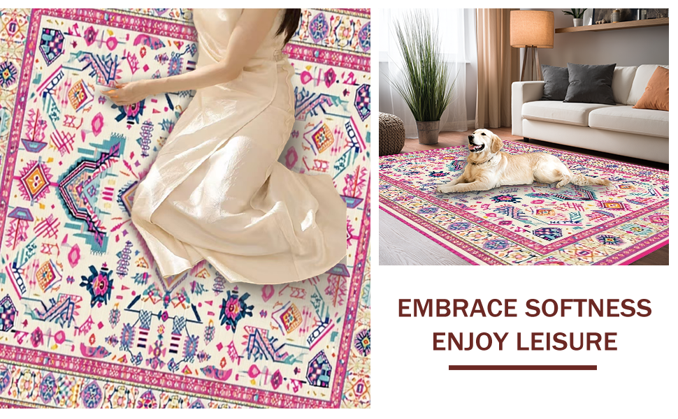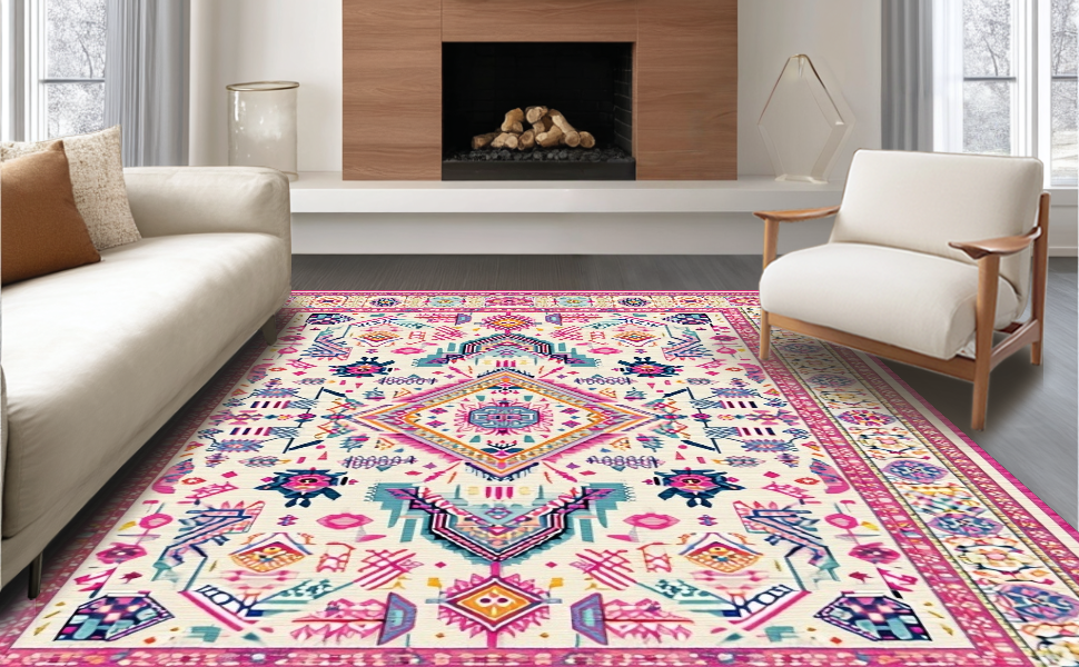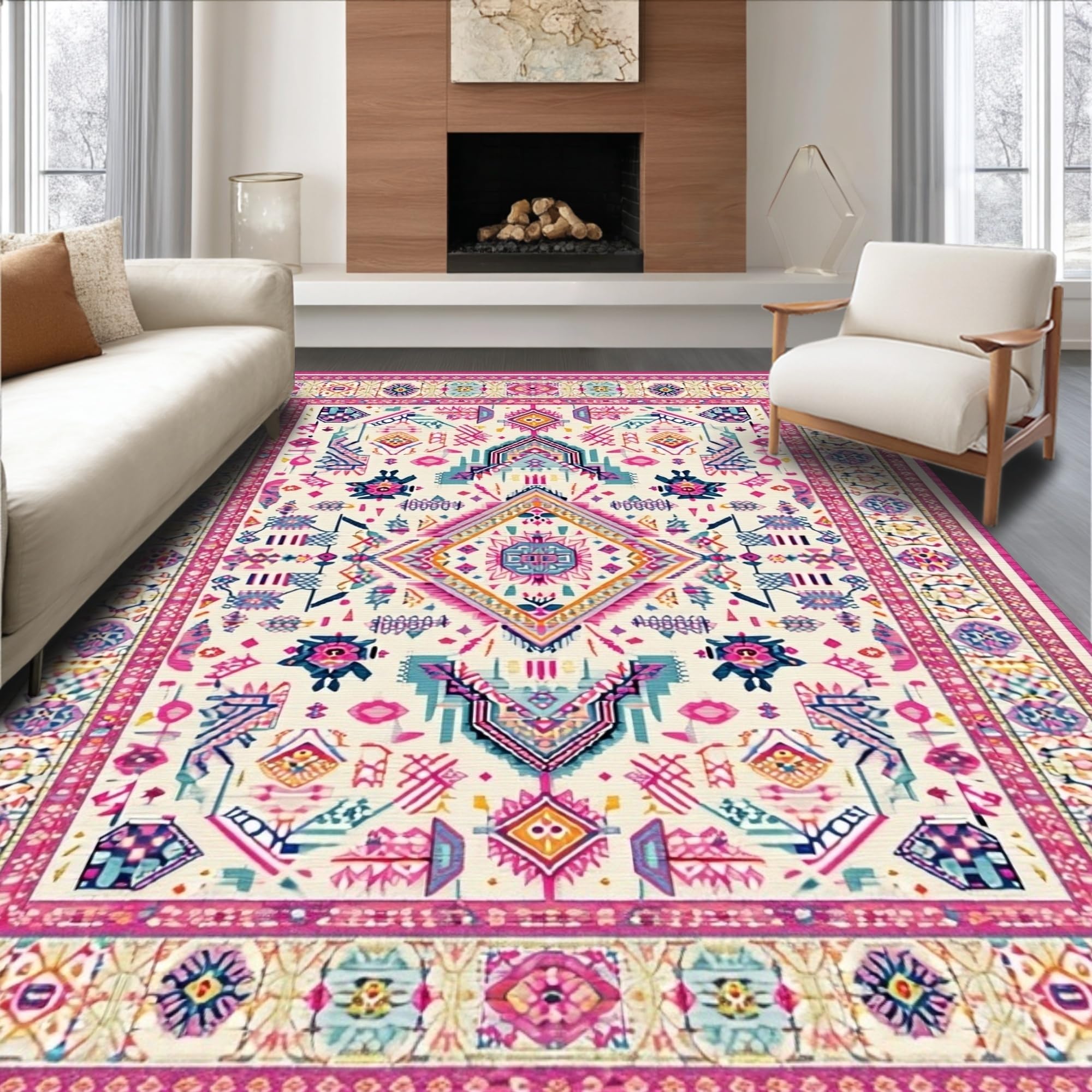 Ultra Soft Area Rug, Non Slip, Stain Resistant, Washable Area Rugs for Living Room, Bedroom, Artistic Pink Medallion Fusion(White) Overview: