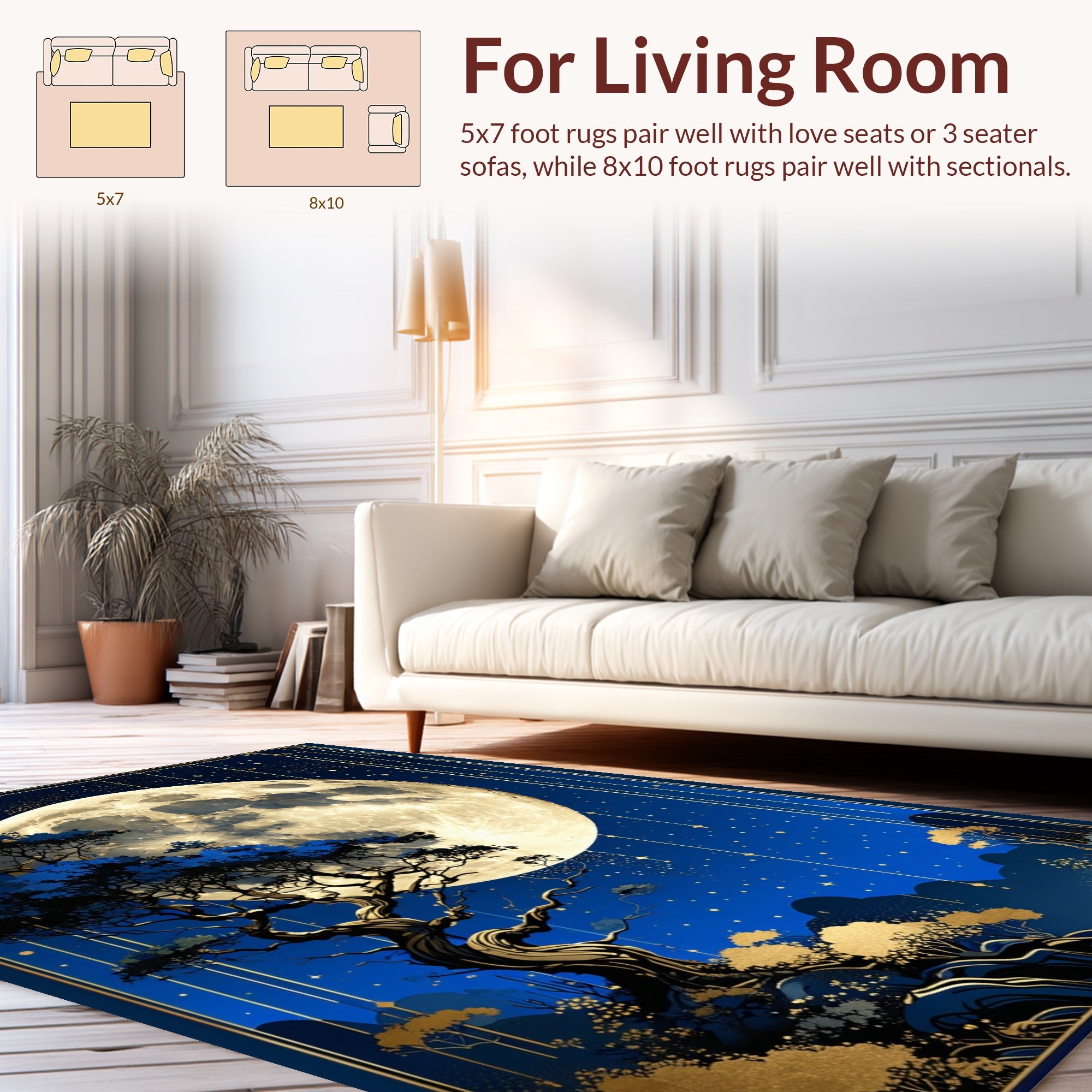 Flatwoven High Traffic Area Rug, Artistic Sun and Moon, Non Slip, Stain Resistant, Washable Area Rugs for Living Room, Bedroom (Blue) Overview: