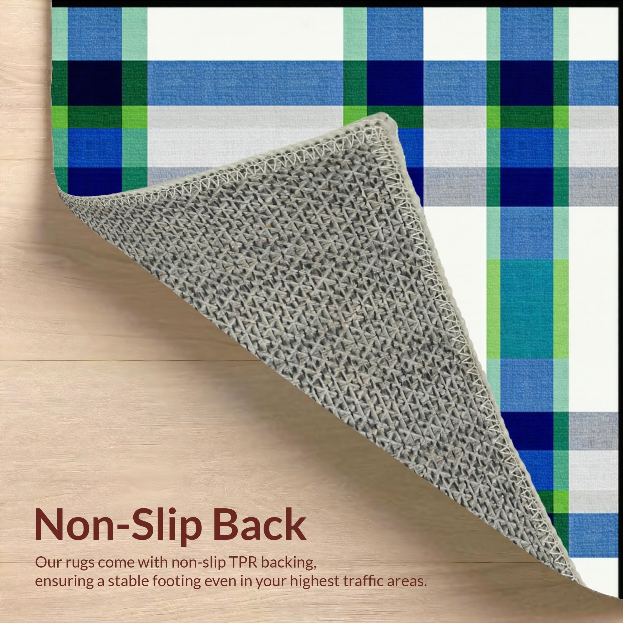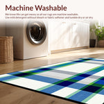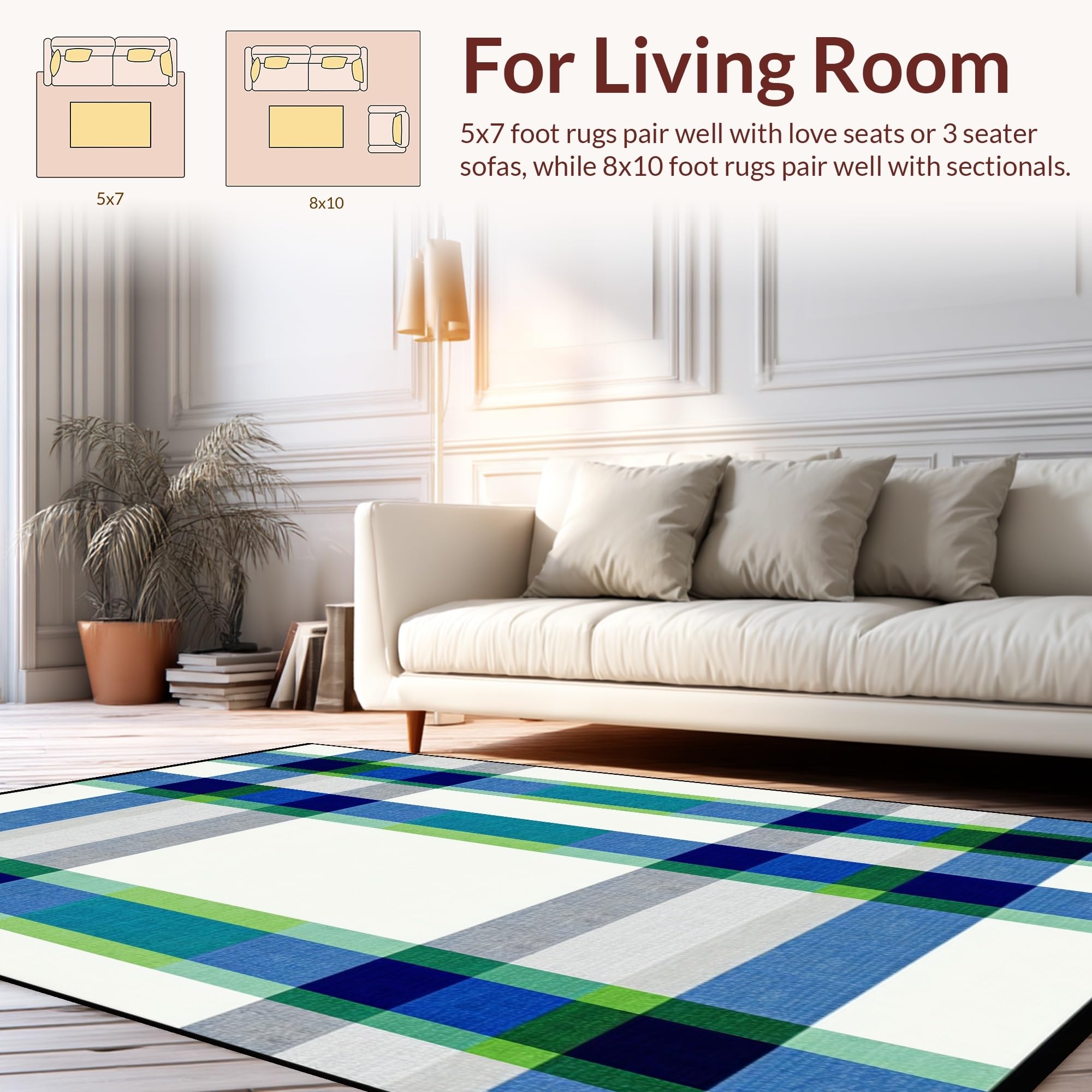 Ultra Soft Area Rug, Non Slip, Stain Resistant, Washable Area Rugs for Living Room, Bedroom, Asymmetric Blue Green and Beige Plaid Featuring Bold Linear(Blue) Overview: