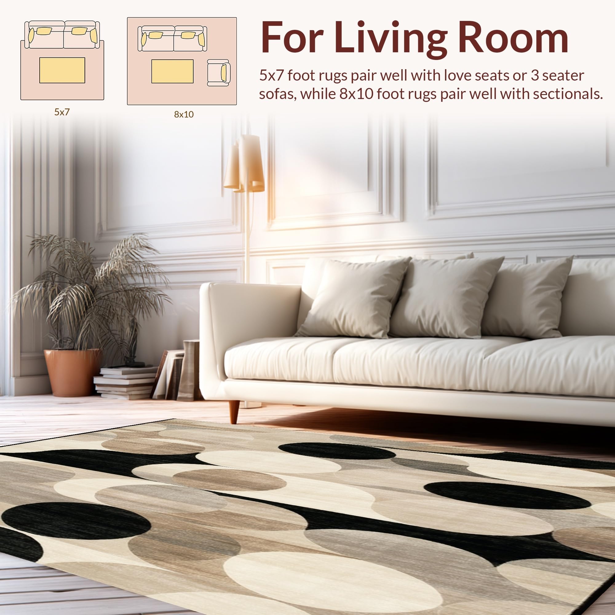 Ultra Soft Area Rug, Non Slip, Stain Resistant, Washable Area Rugs for Living Room, Bedroom, Barista Collection Modern Abstract Circles Geometric Area Beige Black(Beige) Overview: