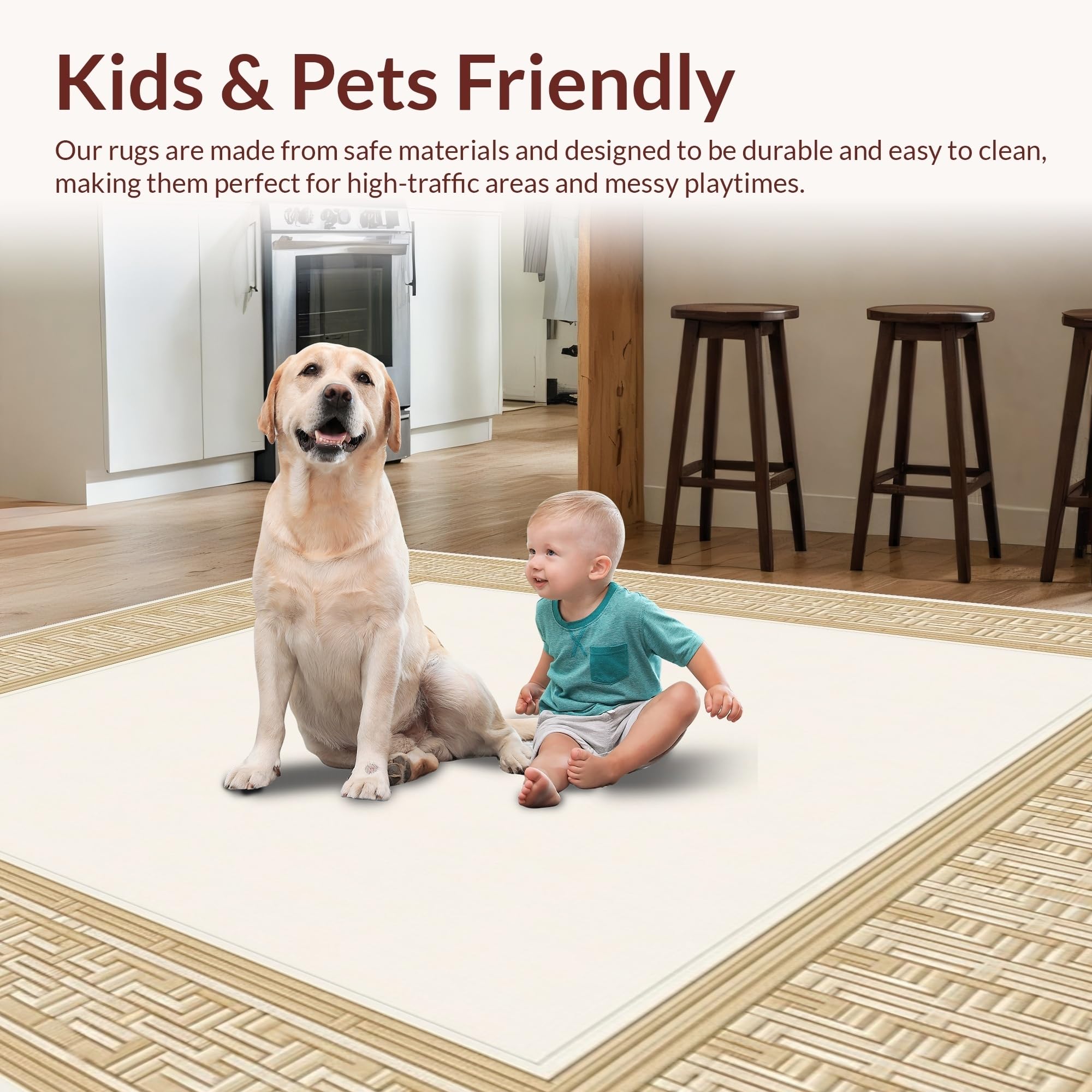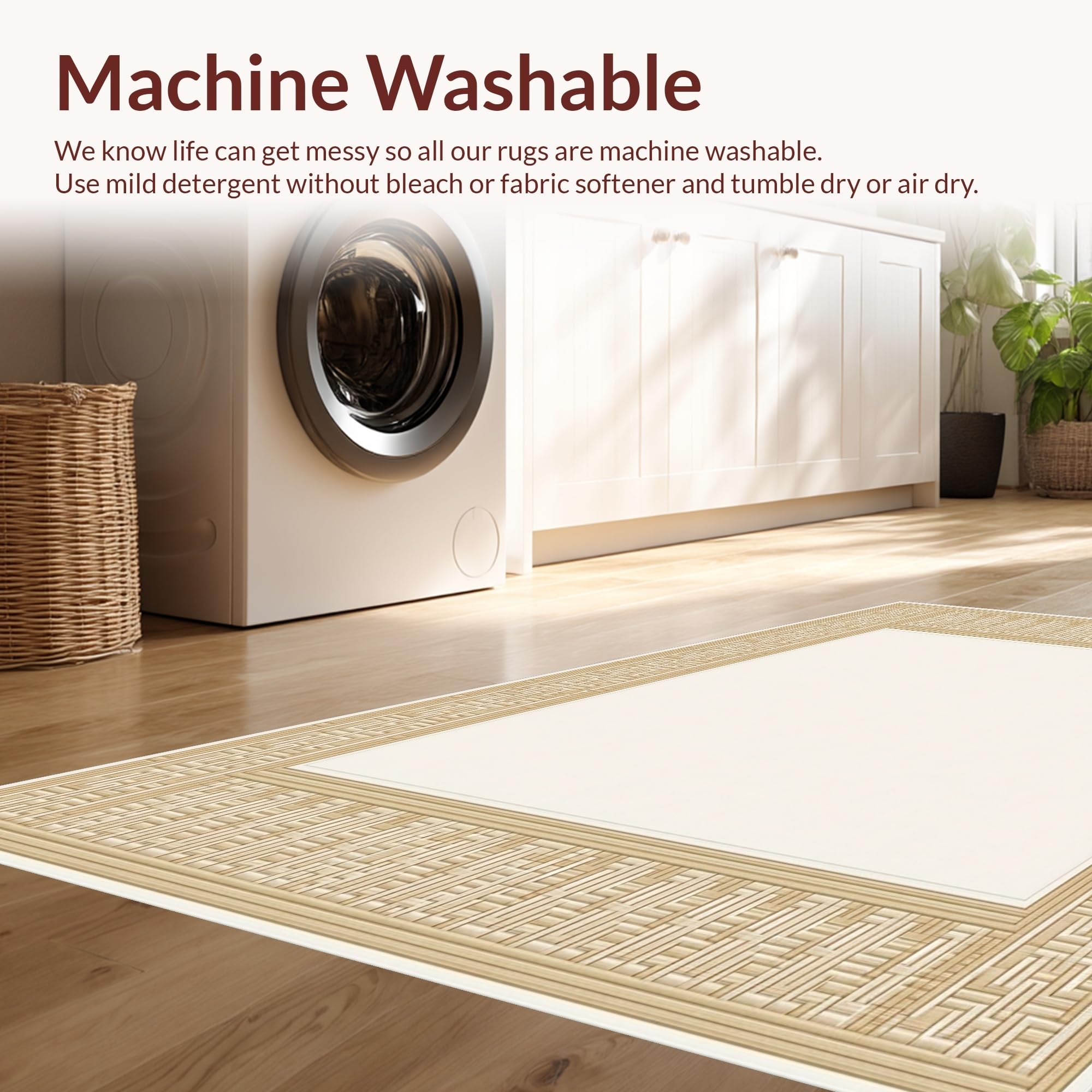 Ultra Soft Area Rug, Non Slip, Stain Resistant, Washable Area Rugs for Living Room, Bedroom, Basketweave Inspired with Interlocking Square Border(Beige) Overview:
