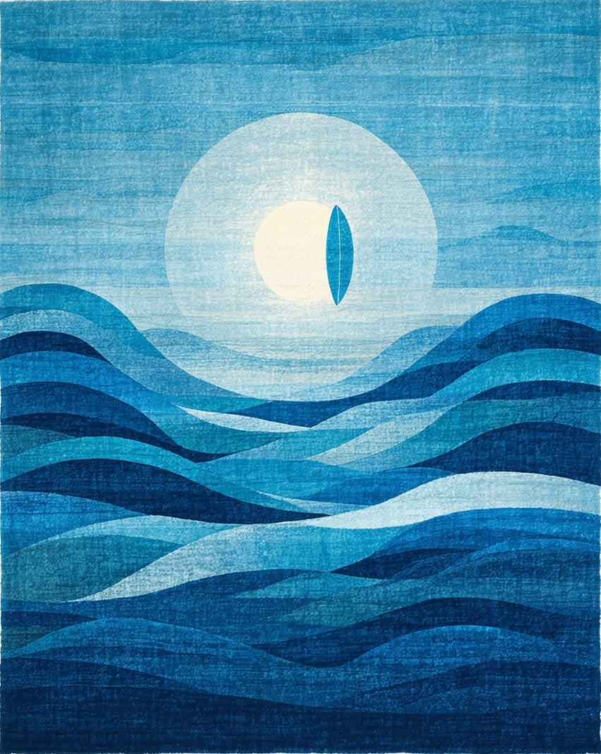 Beachy Crest Surfboard With Undulating Wave Lines And Subtle Sun Motif(Blue)